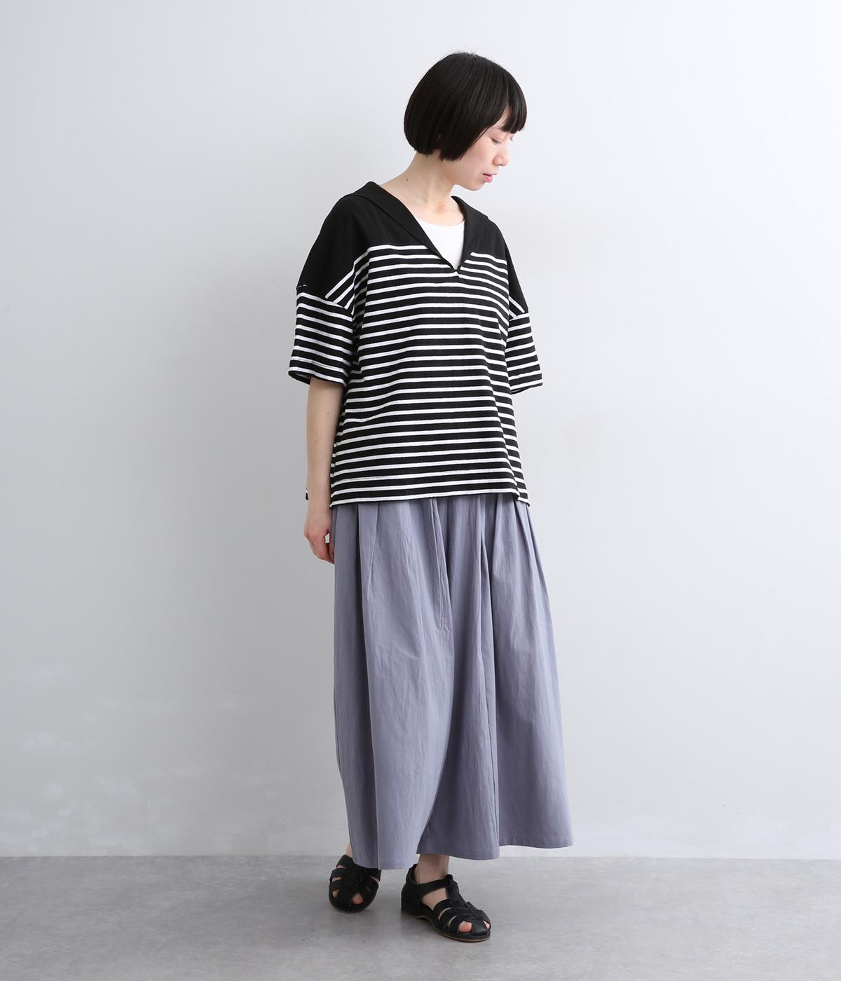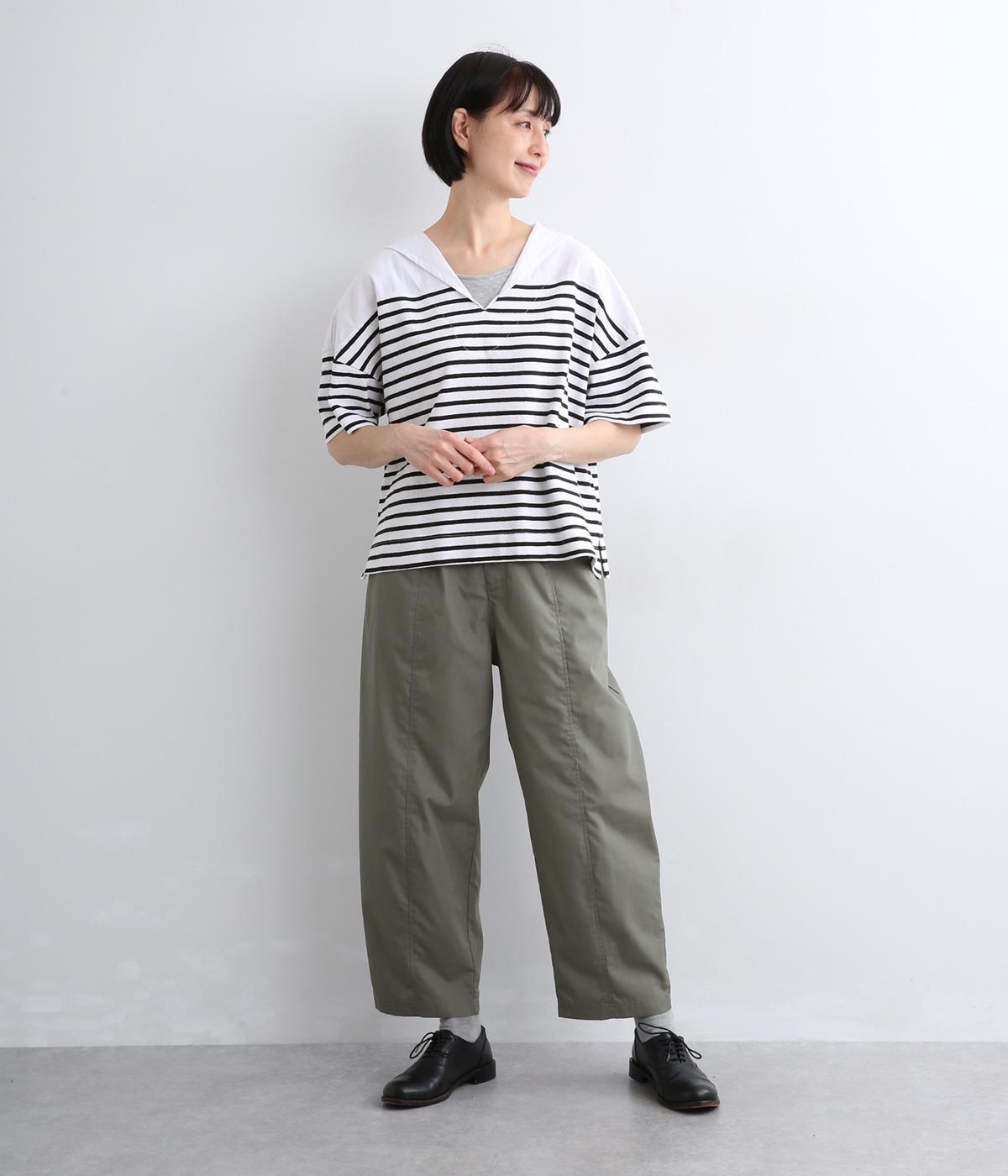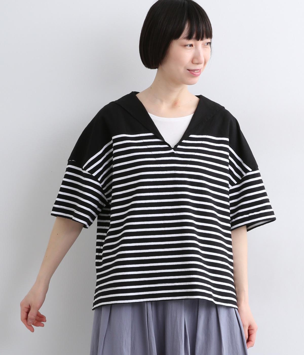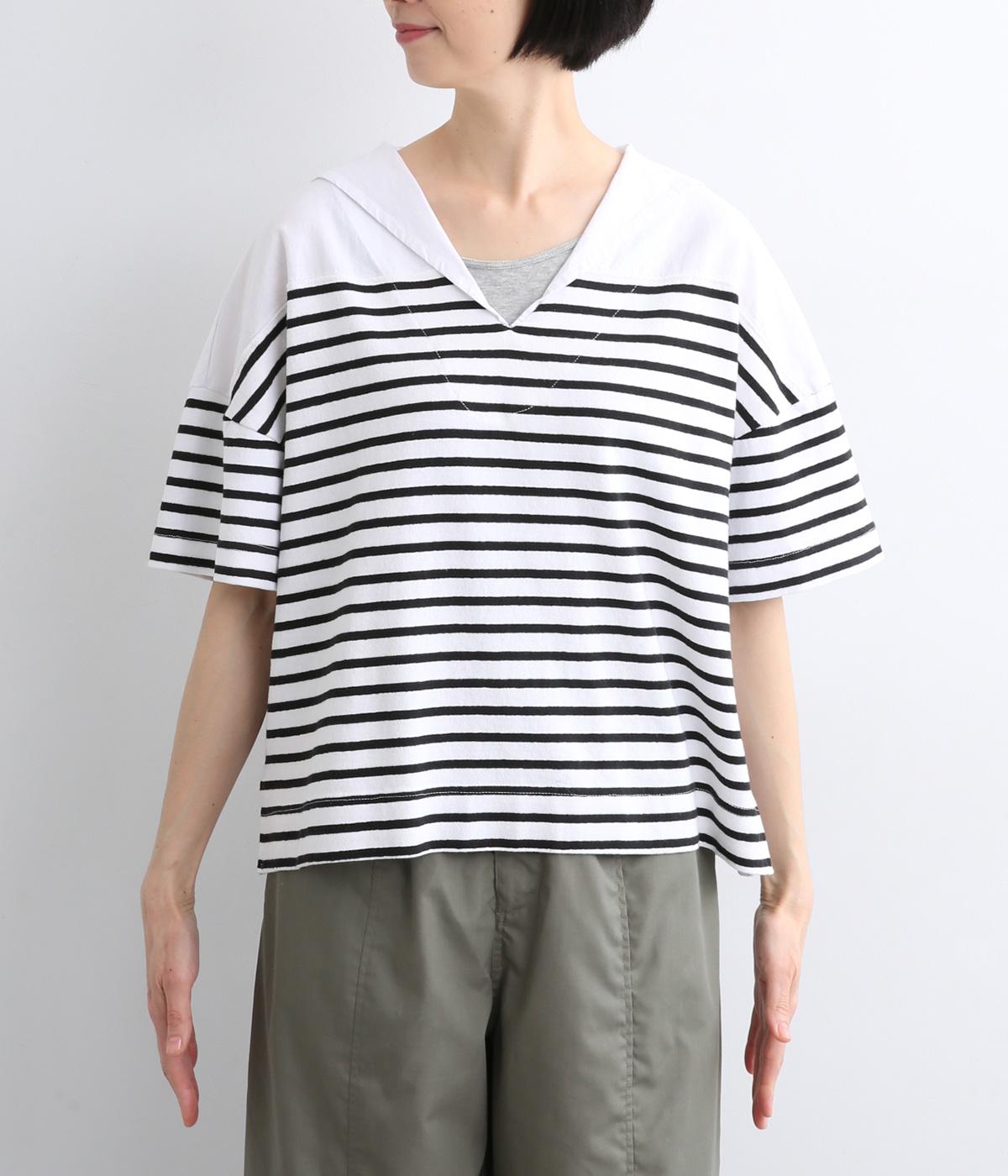 パネル切り替えで布帛使いしたセーラーデザインが、甘すぎないアクセントを添えるプルオーバーです。すっきりと開いたVネックは抜け感をつくるポイントに。ロングスカートやワイドパンツと合わせた大人の女性らしい着こなしもおすすめです。