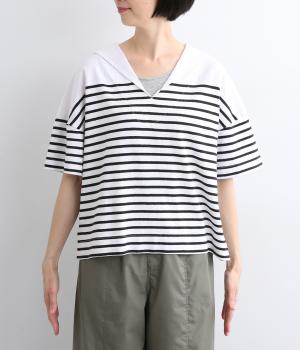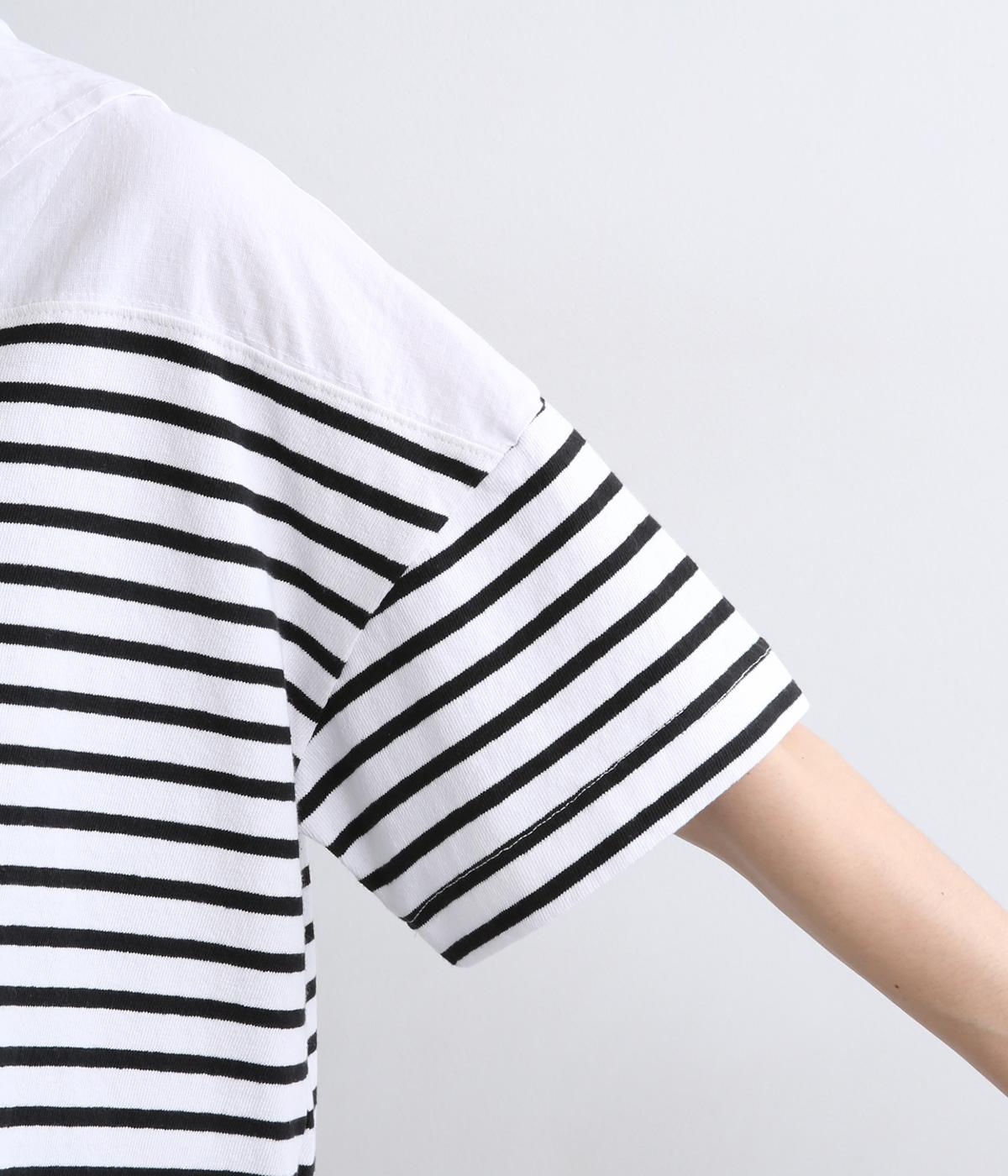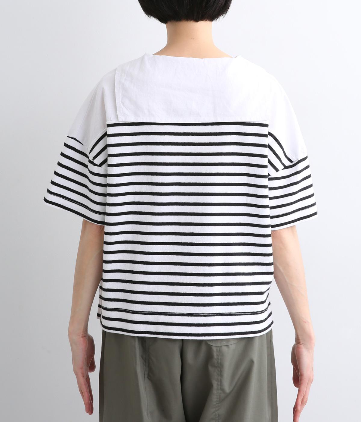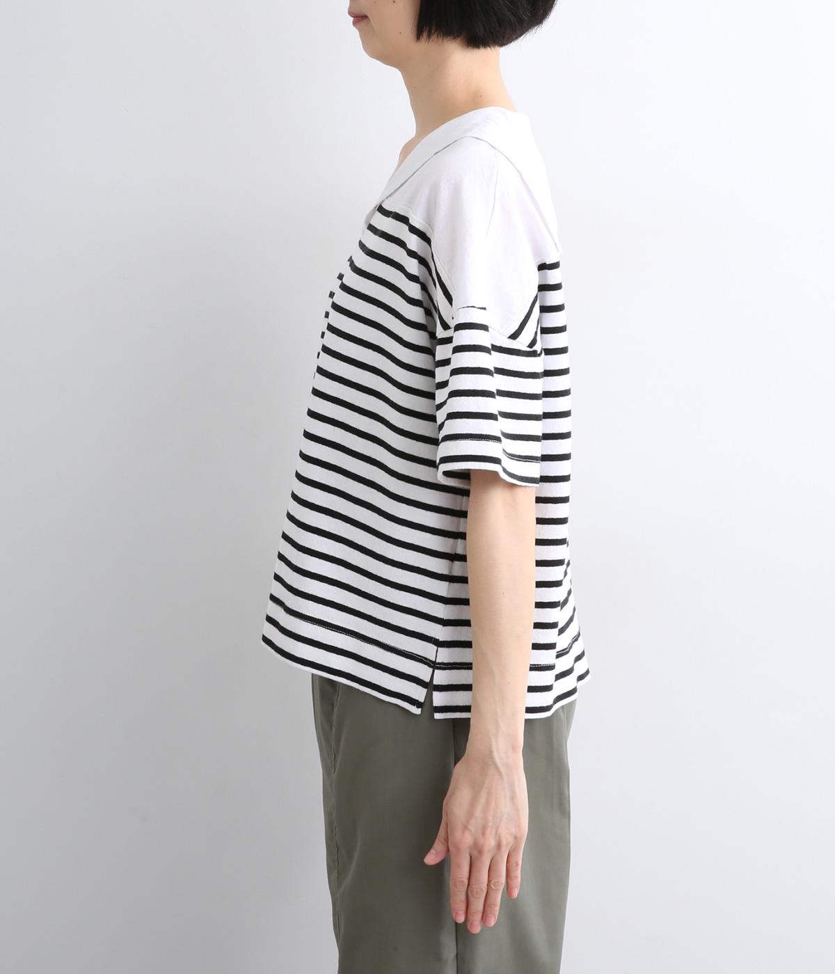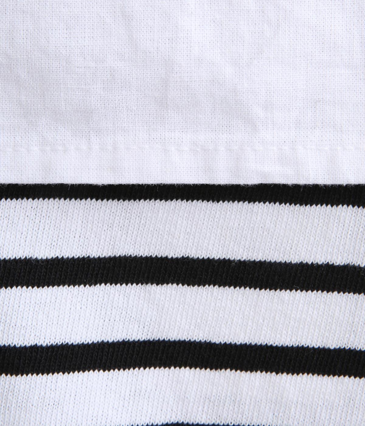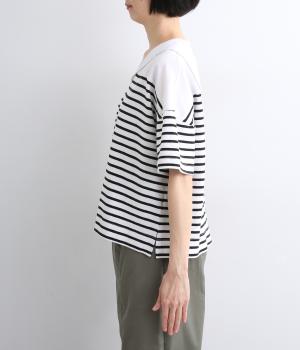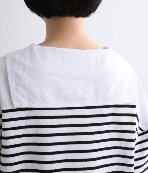 身頃に伸びのよい度詰めの先染めボーダー地を、襟や肩部分はナチュラルな風合いが映えるコットンリネン生地で切り替えたドッキング仕様です。