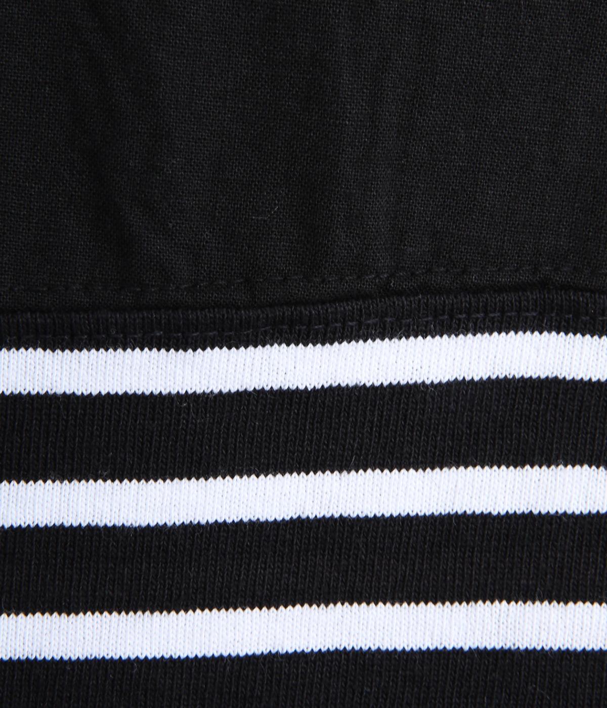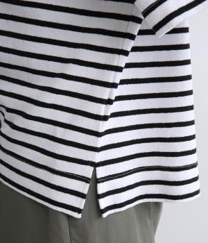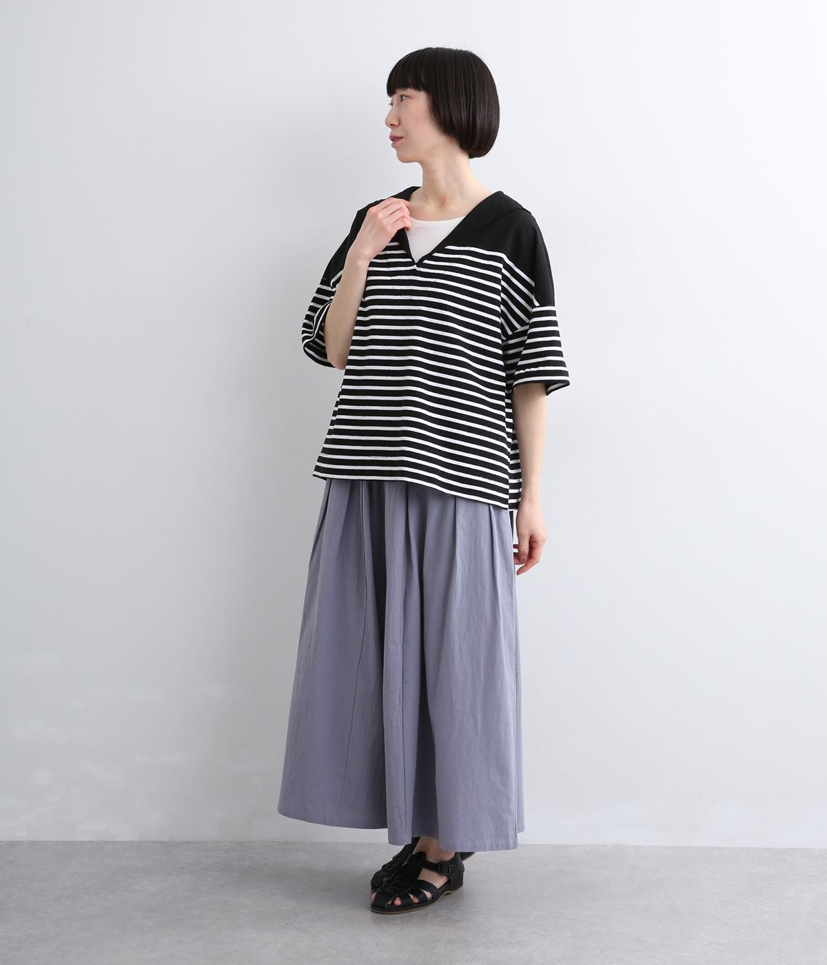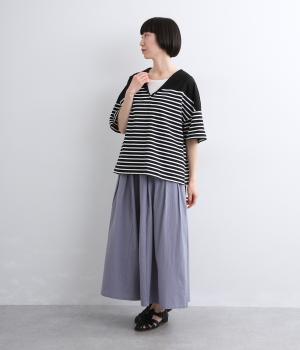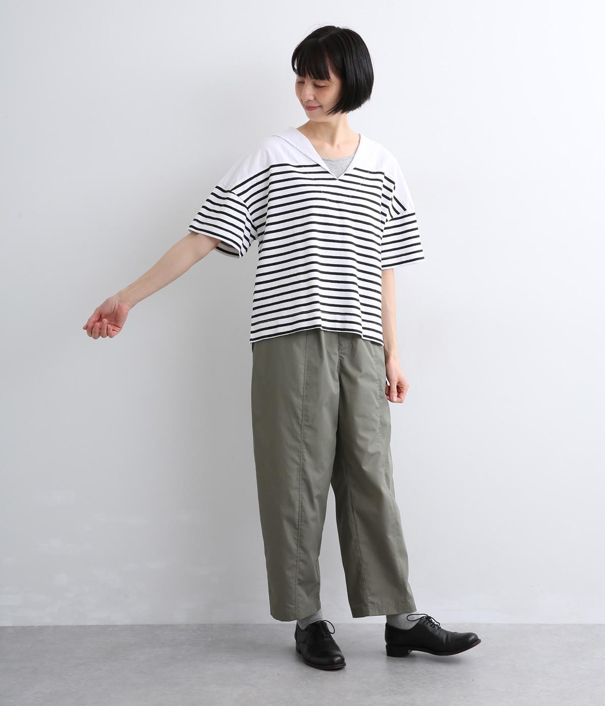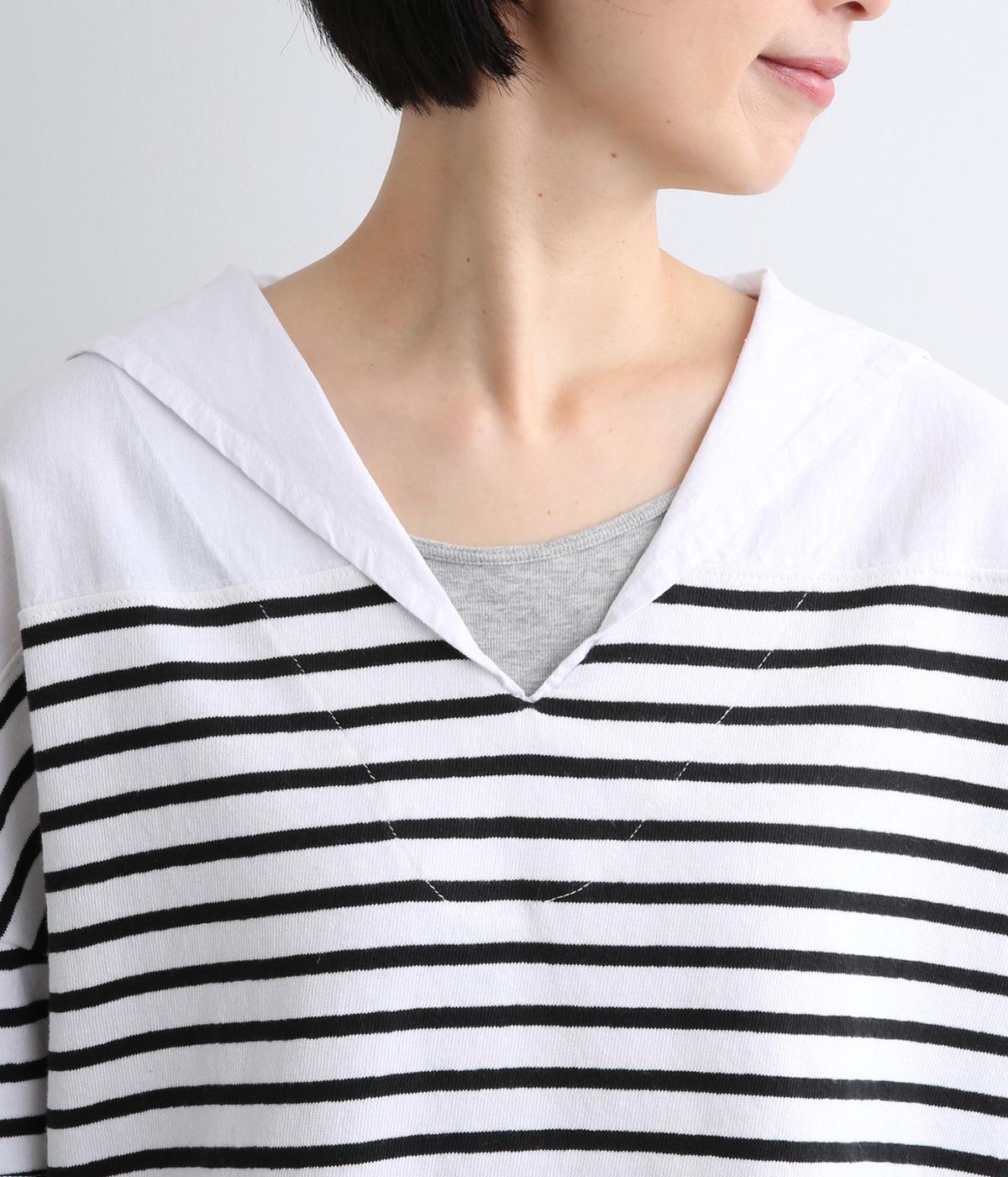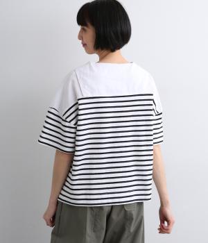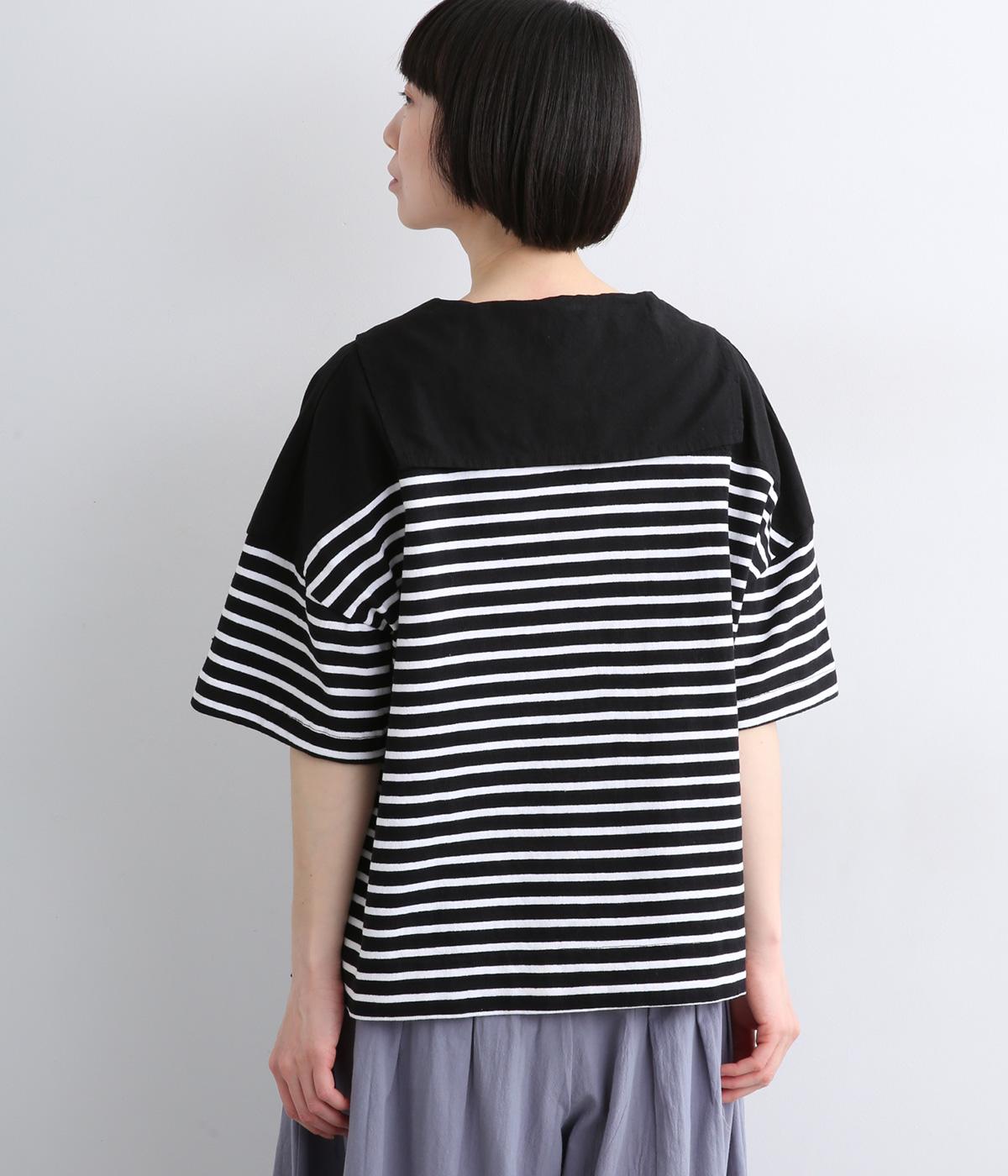 身頃に伸びのよい度詰めの先染めボーダー地を、襟や肩部分はナチュラルな風合いが映えるコットンリネン生地で切り替えたドッキング仕様です。
