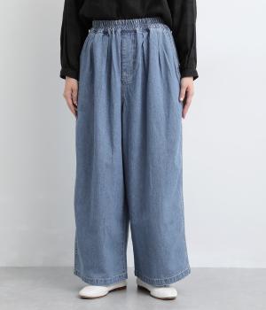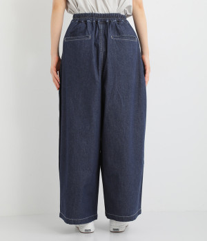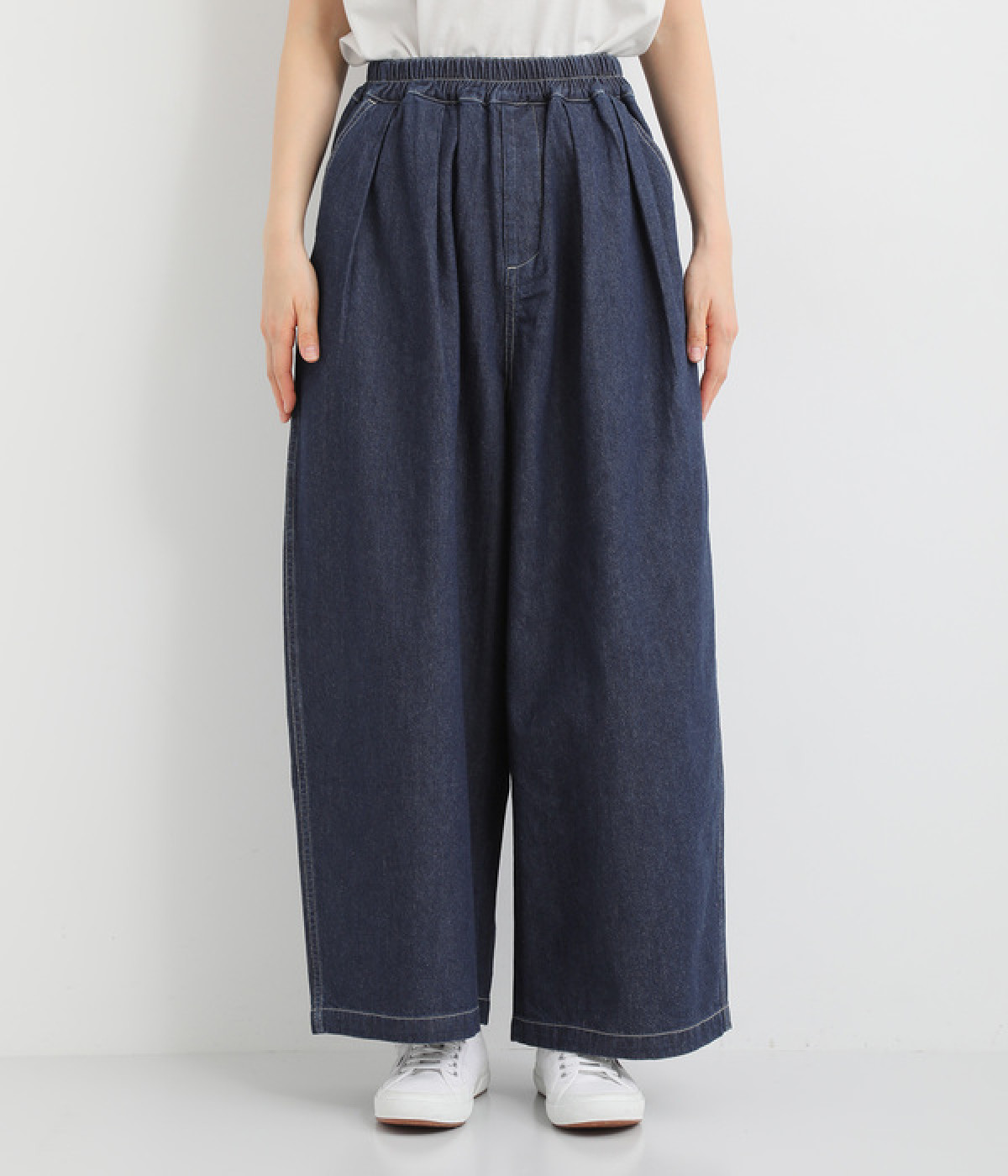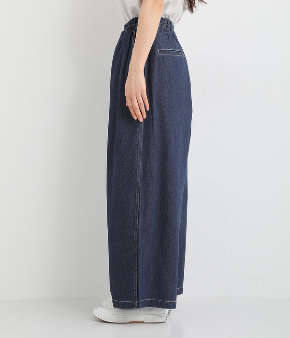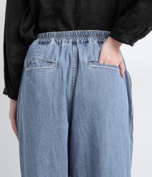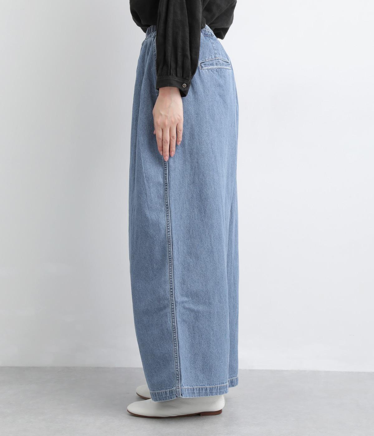 ウエストにタックをほどこし、たっぷり贅沢に生地を使用したワイドパンツ。生地が肉厚すぎないので重くなく軽やかにはけてスタイリングバランスも◎。ウエストはフィット感のいいオールゴムに調整紐を通しました。