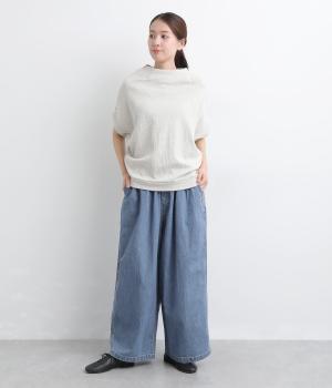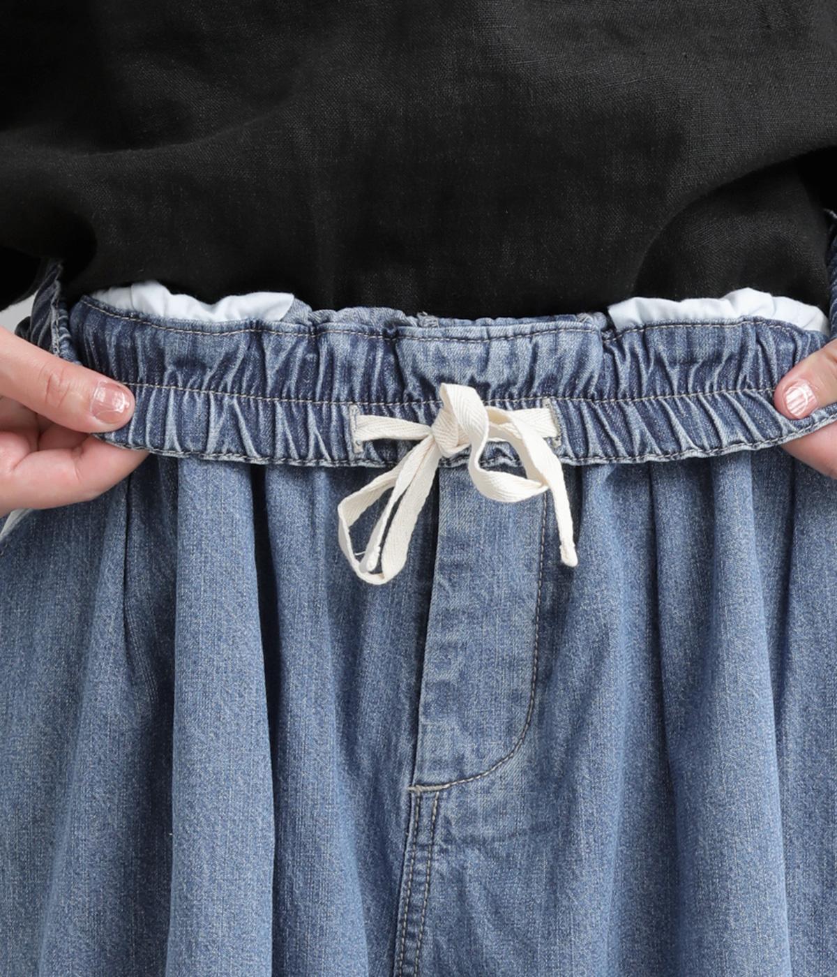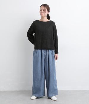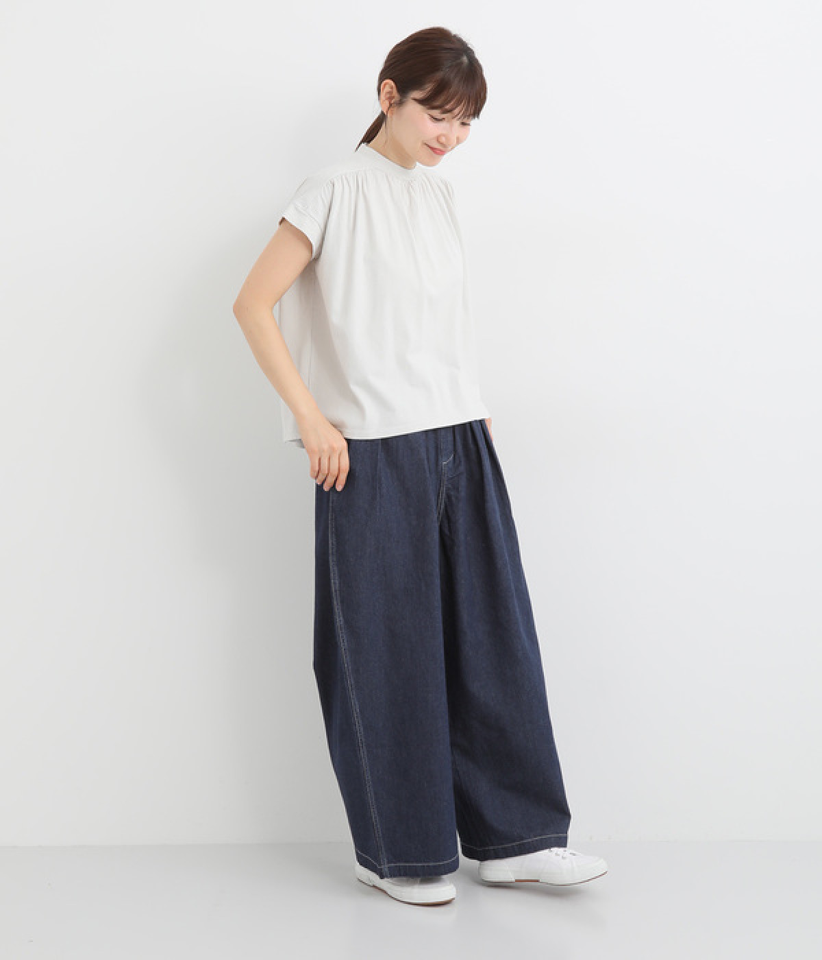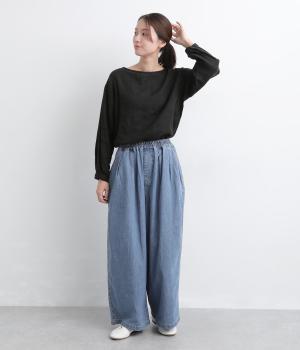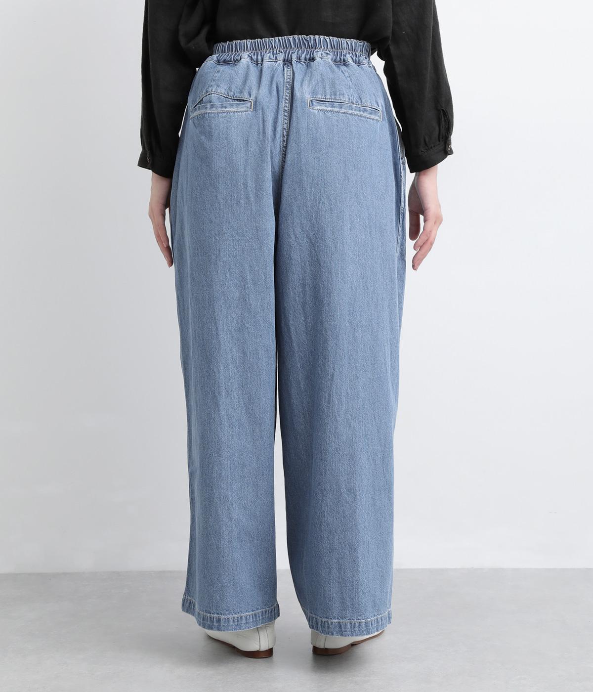 ウエストにタックをほどこし、たっぷり贅沢に生地を使用したワイドパンツ。生地が肉厚すぎないので重くなく軽やかにはけてスタイリングバランスも◎。ウエストはフィット感のいいオールゴムに調整紐を通しました。