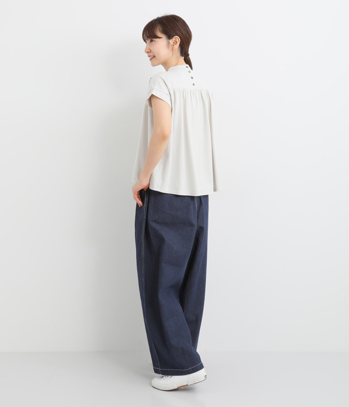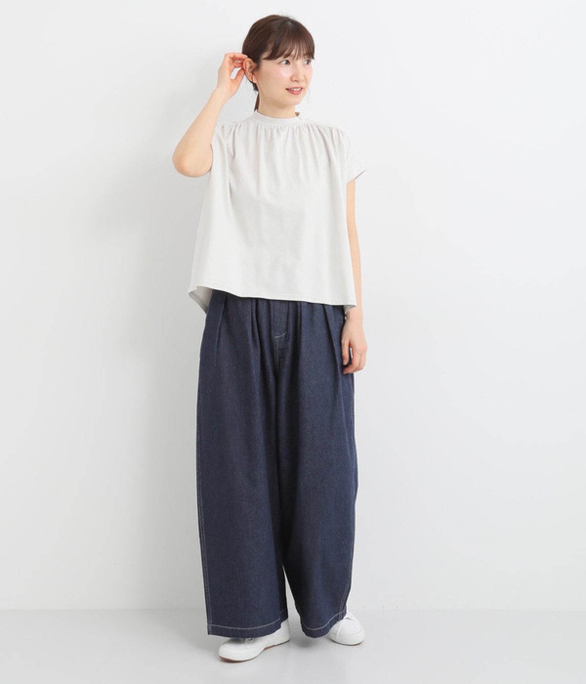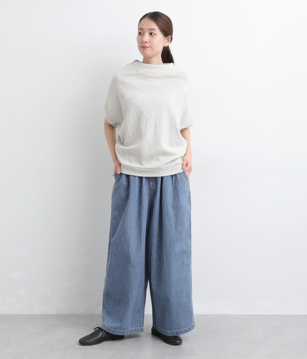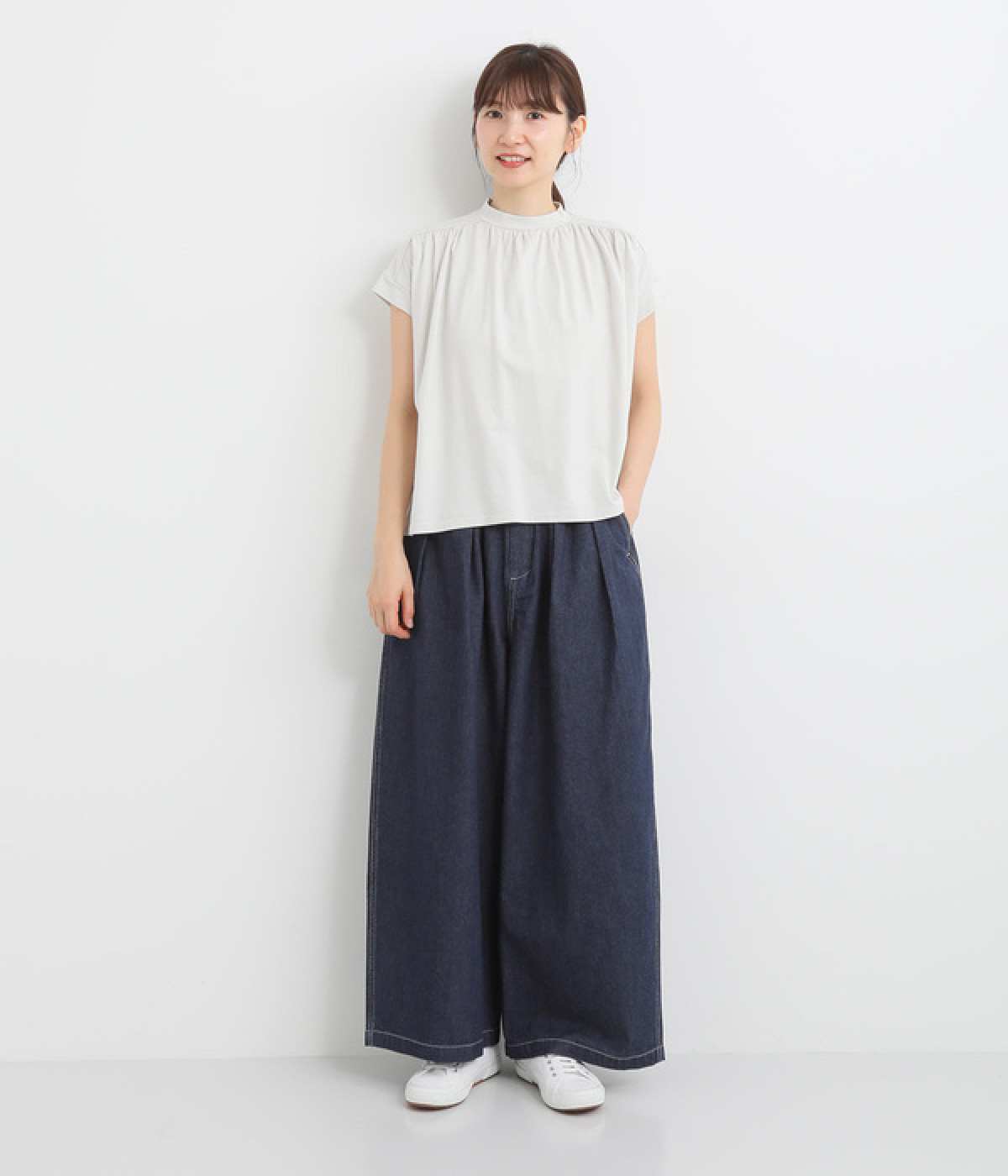 ウエストにタックをほどこし、たっぷり贅沢に生地を使用したワイドパンツ。生地が肉厚すぎないので重くなく軽やかにはけてスタイリングバランスも◎。ウエストはフィット感のいいオールゴムに調整紐を通しました。