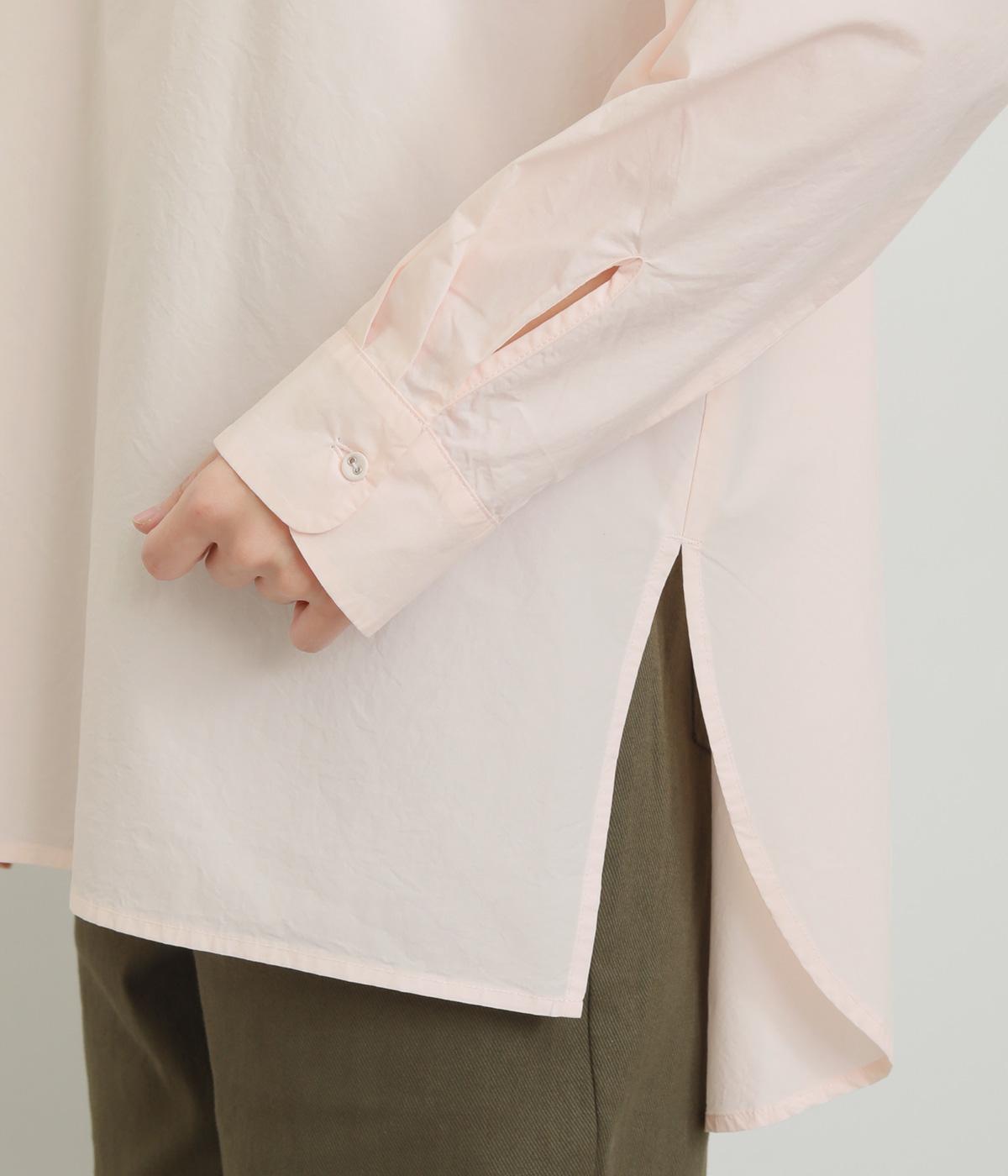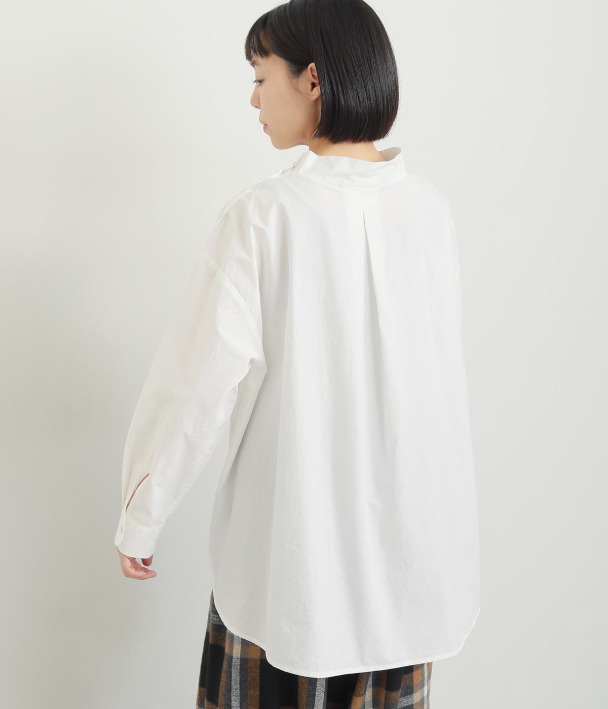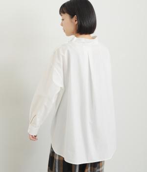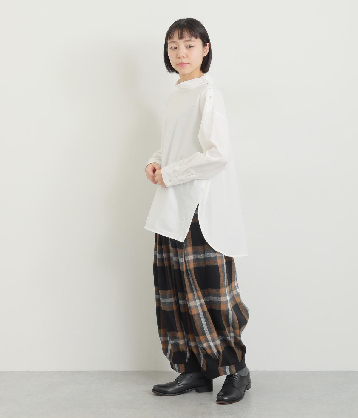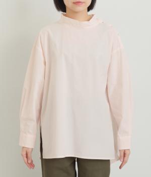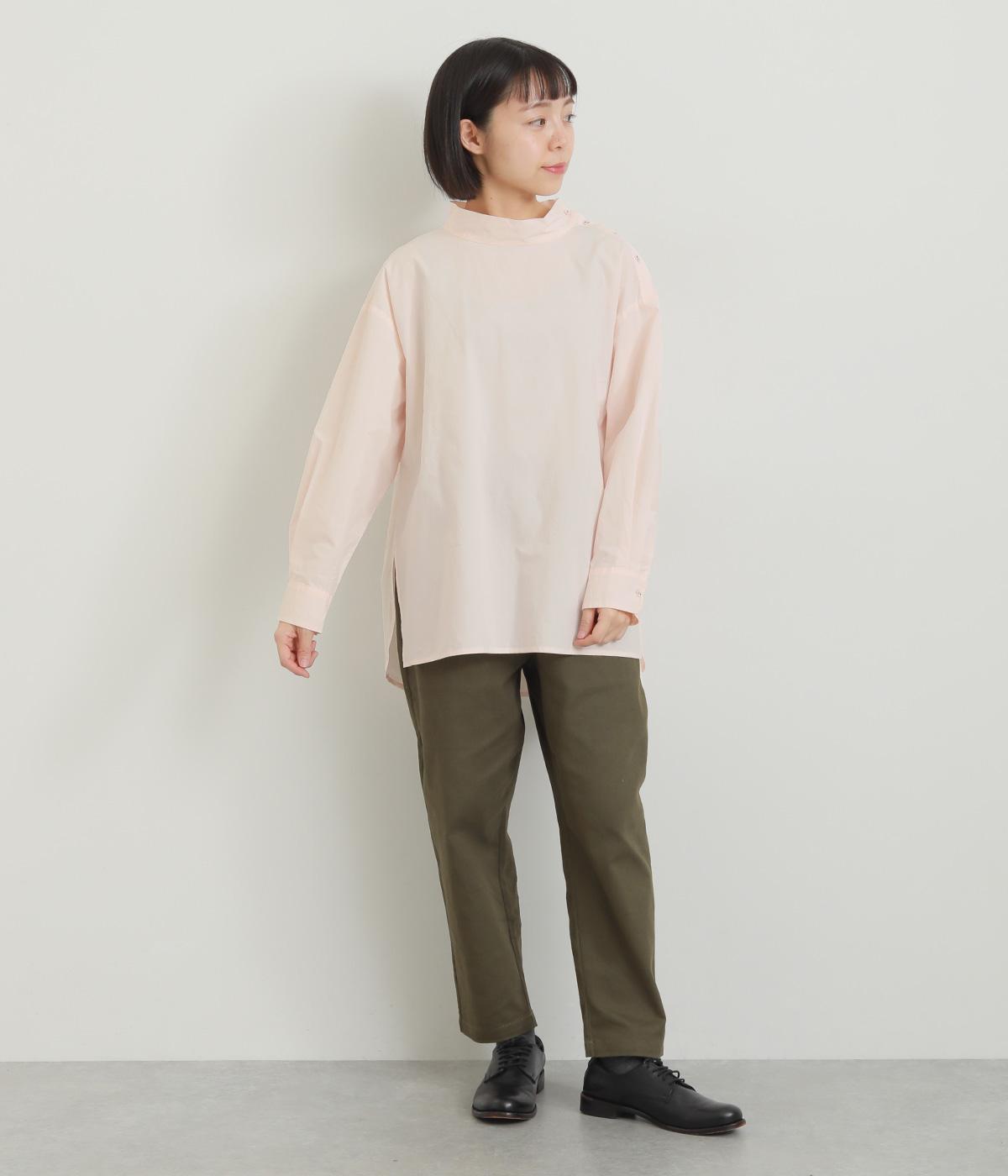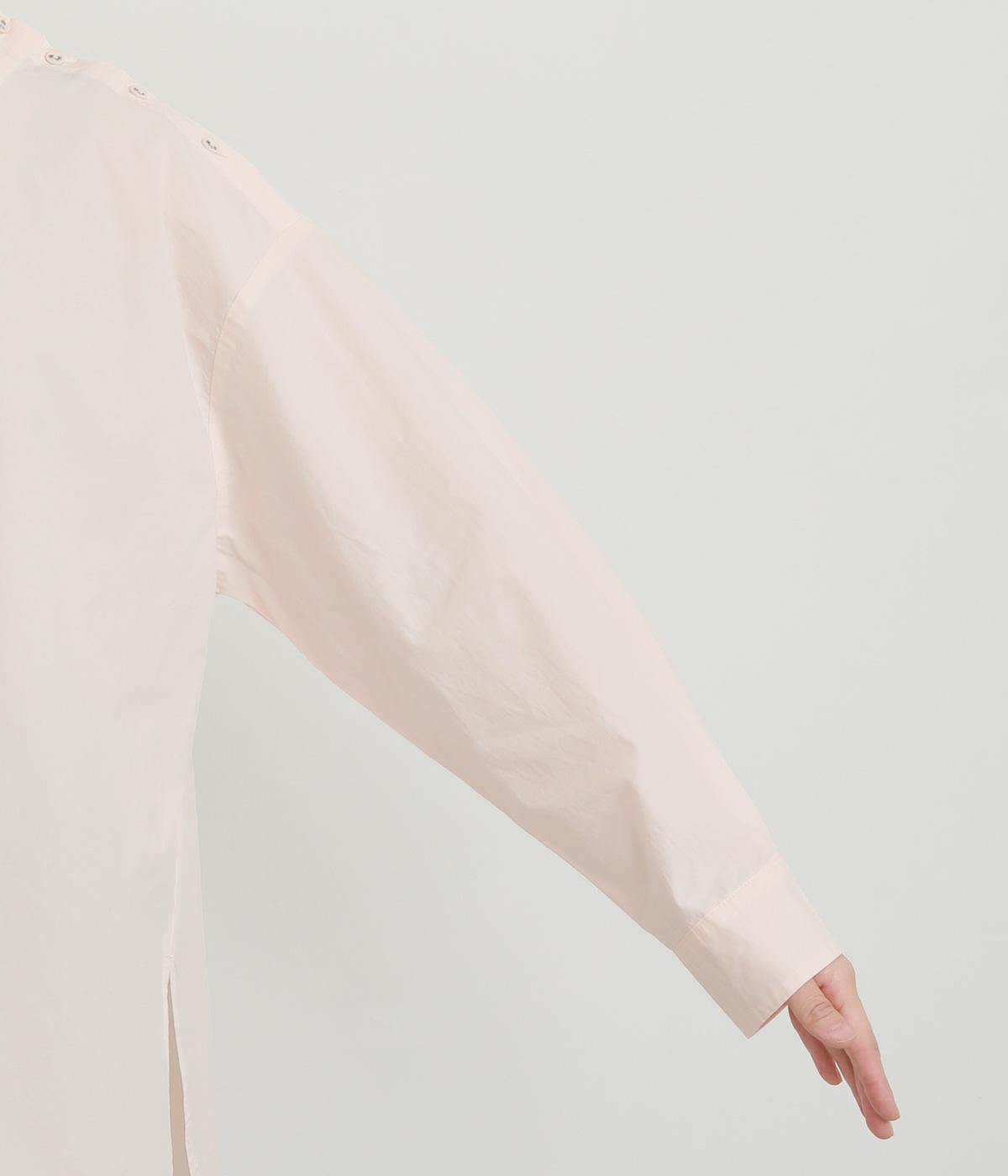 肩ボタンやスタンドネックでデザイン性を取り入れつつ、すっきりシンプルにまとめたロングシャツ。前ヘムラインはスクエアに、後ろはラウンドさせて変化を持たせ、横姿も印象的に魅せてくれます。サイドスリットでボトム合わせもきれいに。