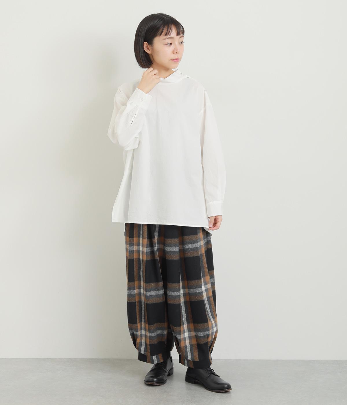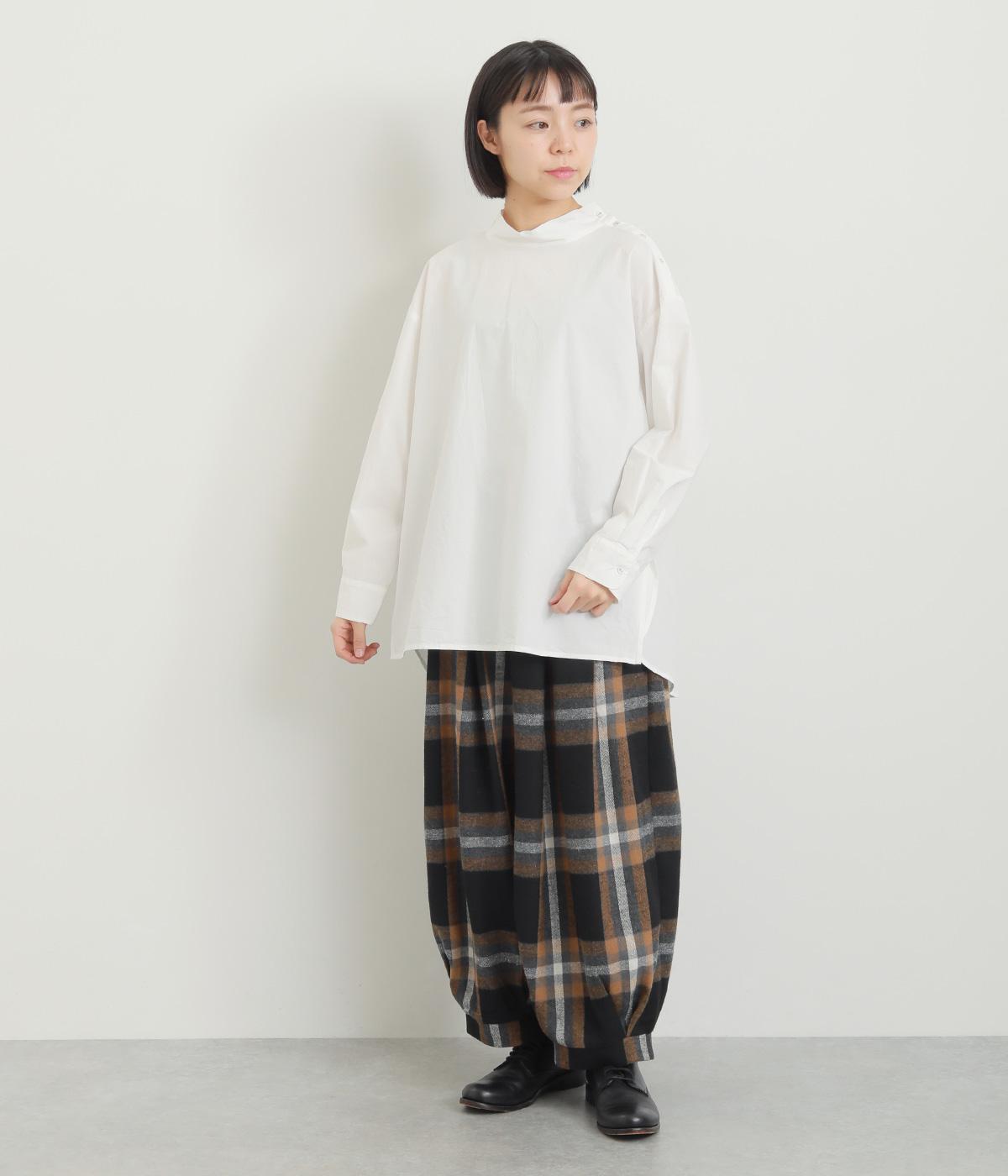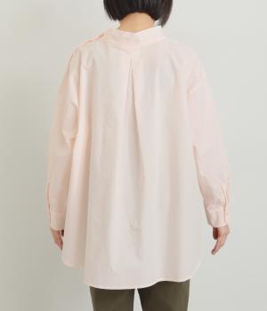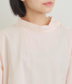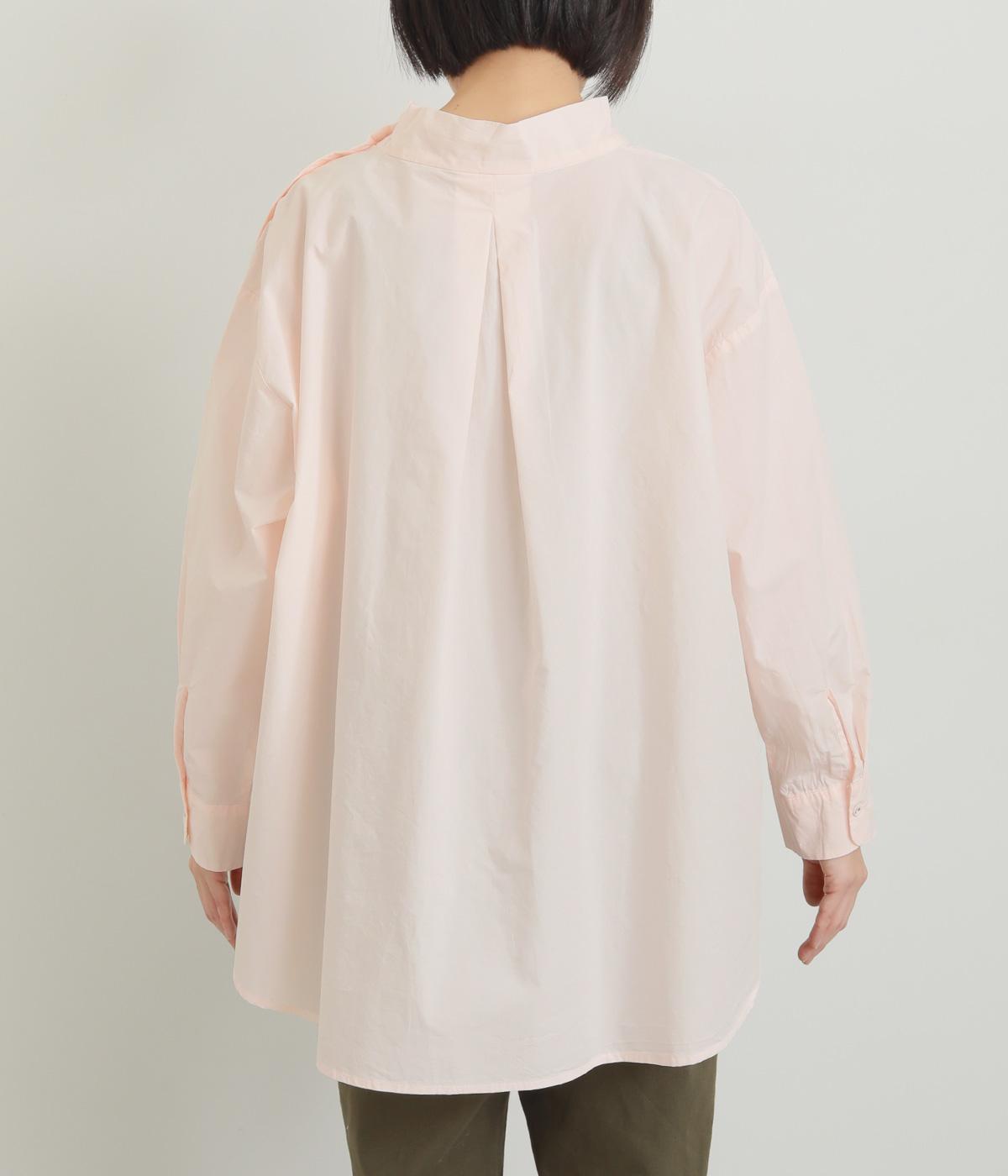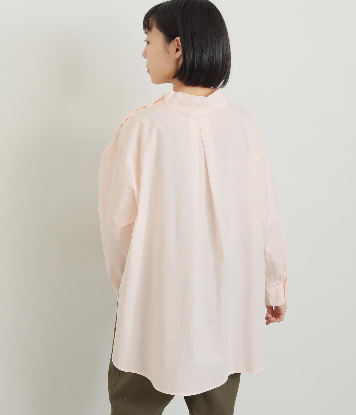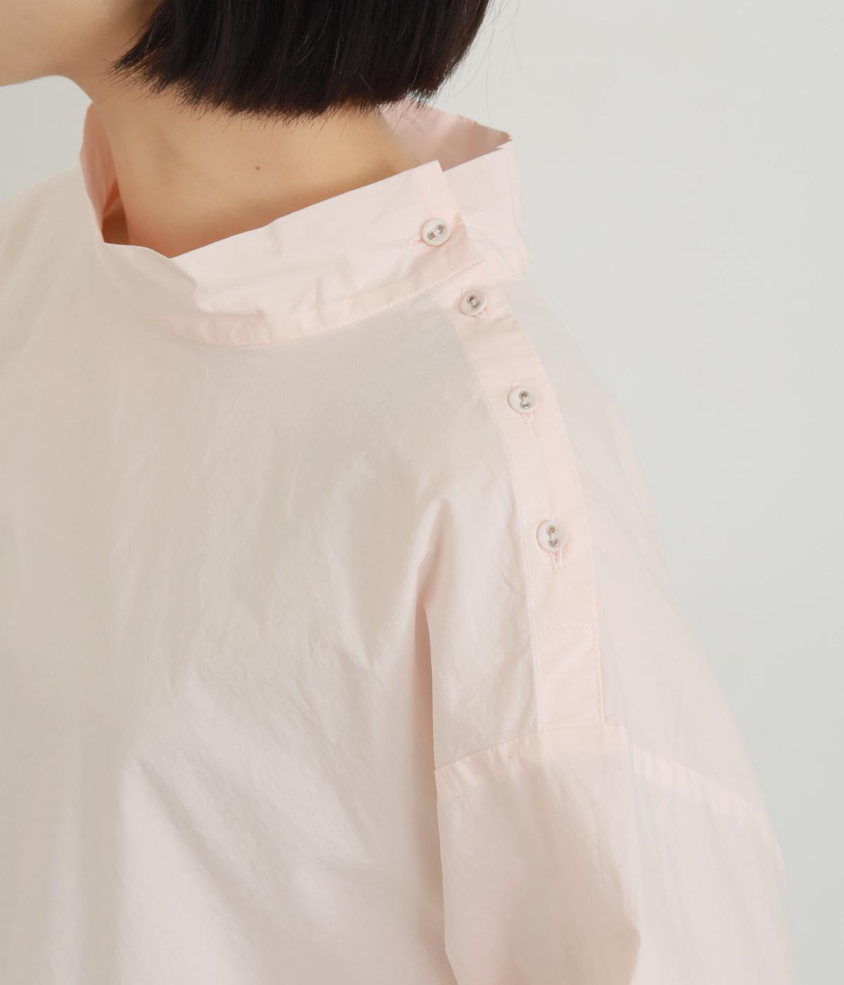 肩ボタンやスタンドネックでデザイン性を取り入れつつ、すっきりシンプルにまとめたロングシャツ。前ヘムラインはスクエアに、後ろはラウンドさせて変化を持たせ、横姿も印象的に魅せてくれます。サイドスリットでボトム合わせもきれいに。