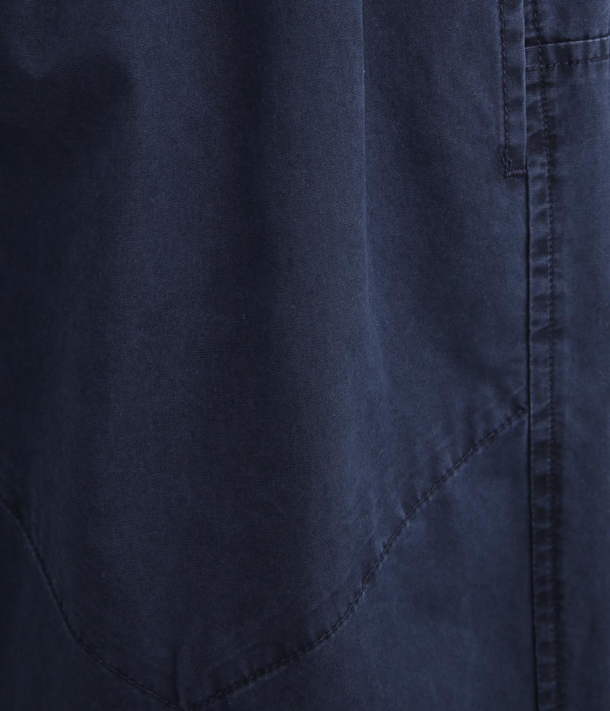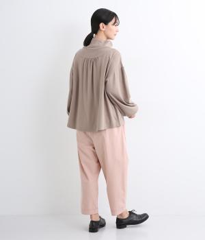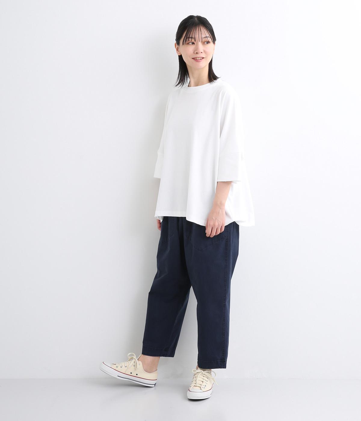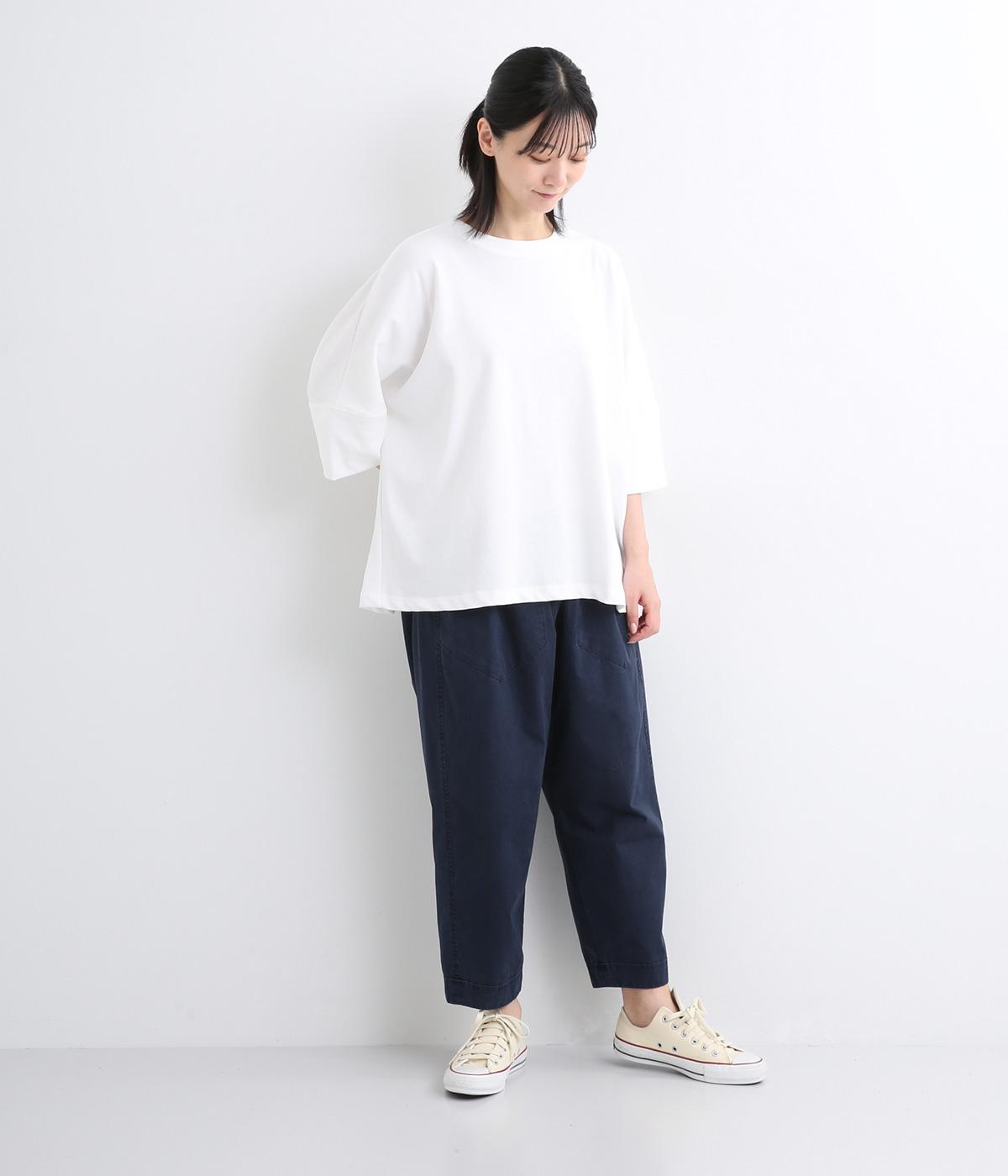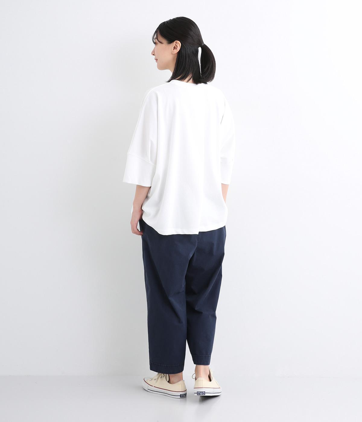洗い加工を施し、色あせたような風合いが特徴。ハリのある生地が立体感を生み、綺麗なシルエットを保ちます。透けにくくさらっとしたコットンは肌触りも良く、1枚でも安心感のある着心地です。