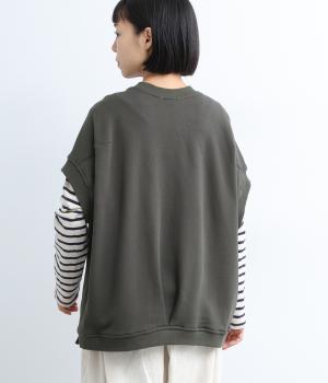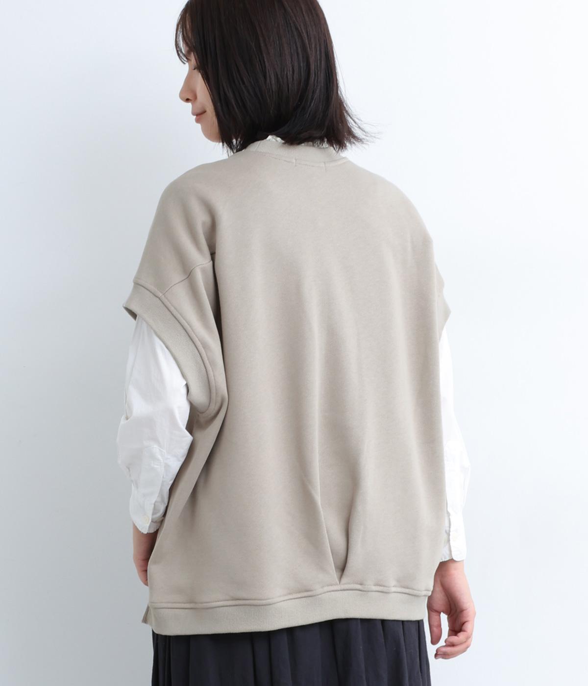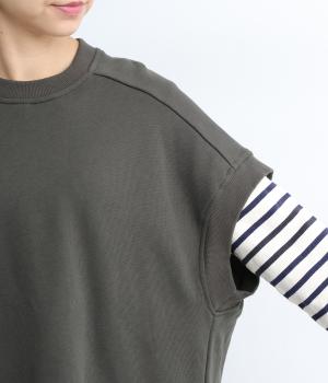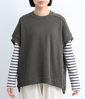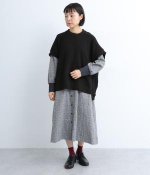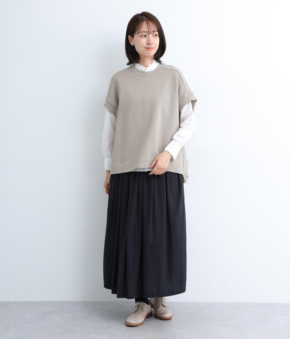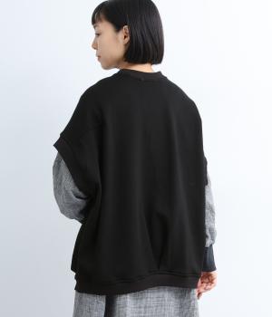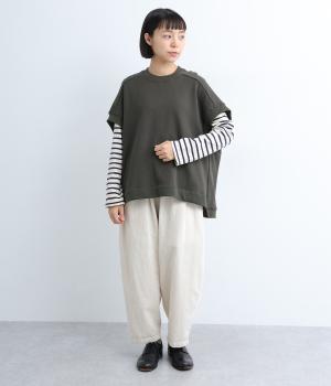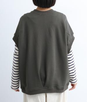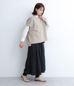 襟ぐり・袖ぐり・裾のワイドリブが特徴のワイドシルエットのベストです。裾に前後差を持たせ、背面に入れたタックが自然な落ち感をつくり、女性らしさを演出します。カジュアルでリラックス感がありながら、大人っぽい着こなしにも◎。