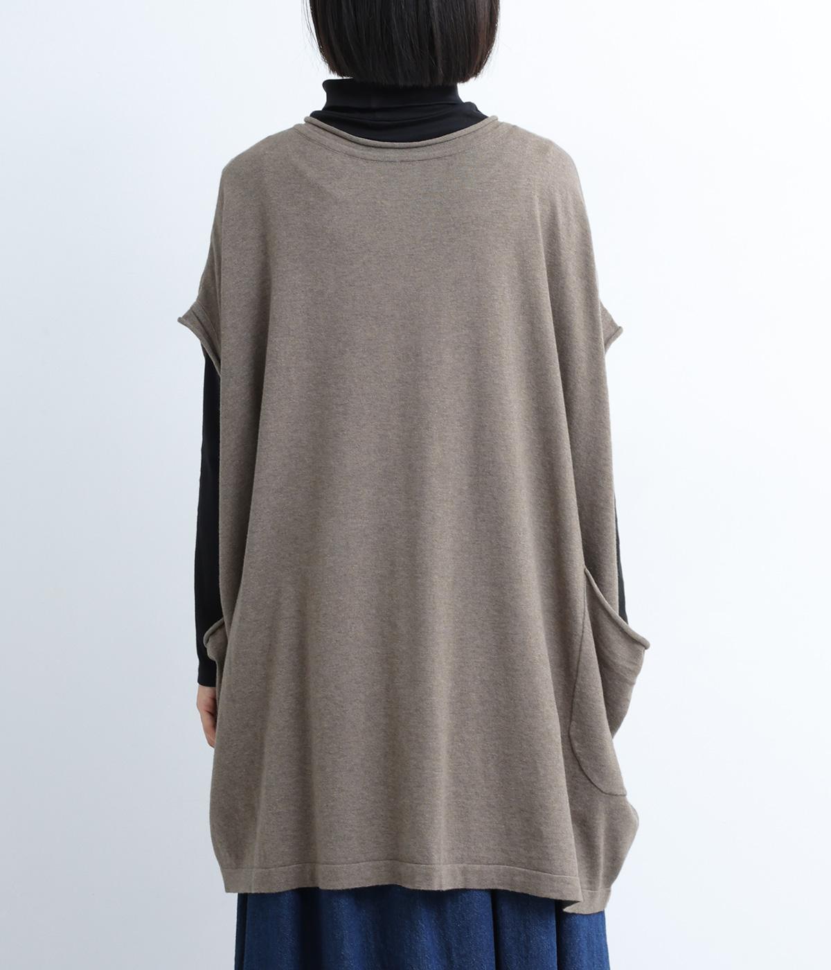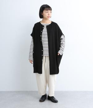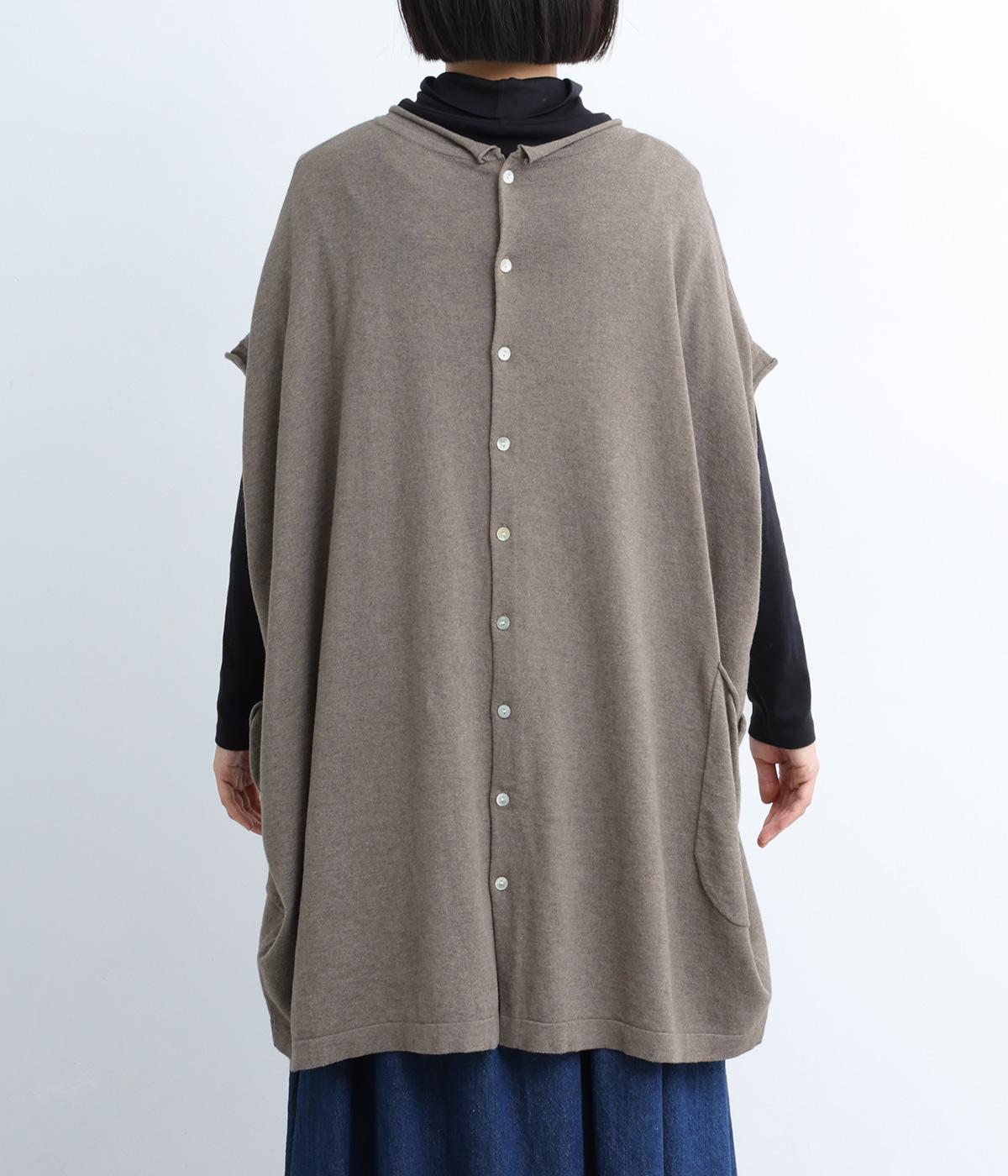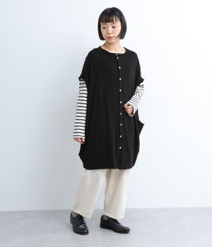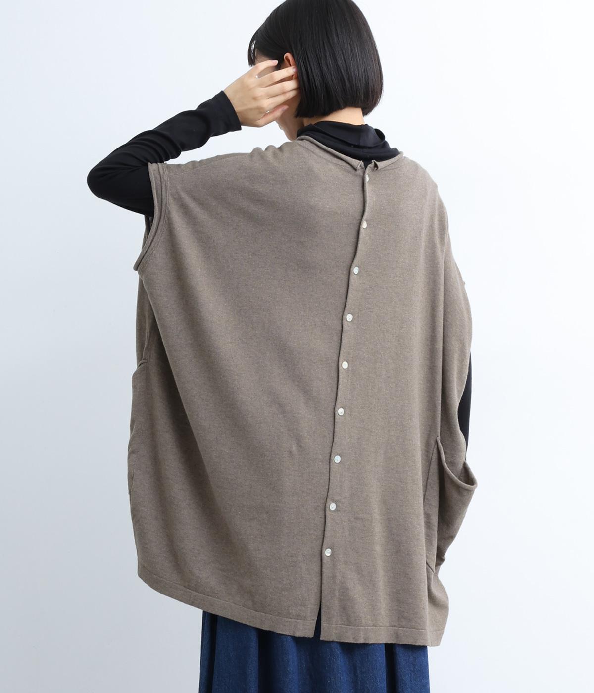前開きボタンとプルオーバーの2wayで着られるベストです。たっぷりの身幅がかわいらしいシルエットをつくり、体のラインを拾わずリラックスした着心地です。ルーズな肩のラインは二の腕カバーにも◎。