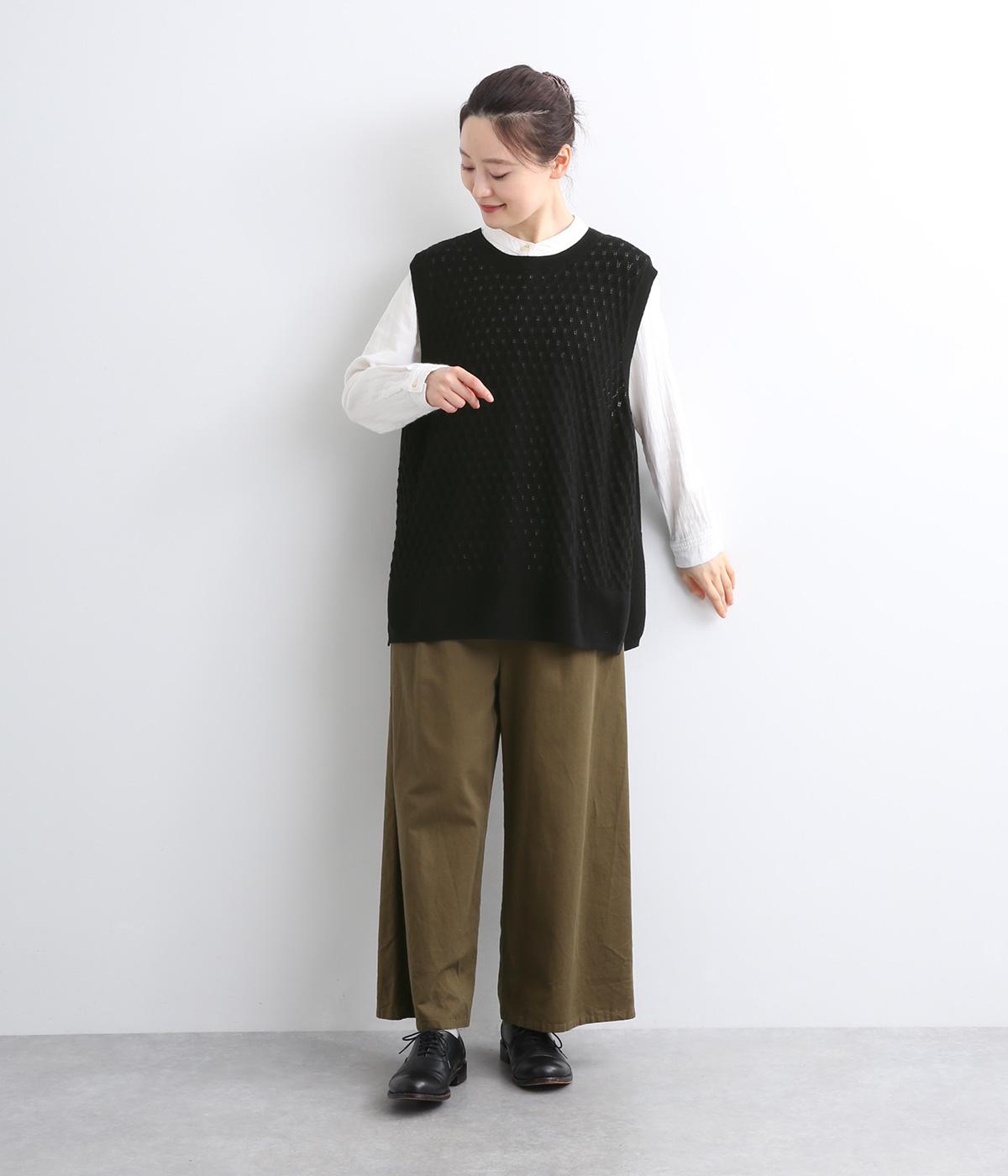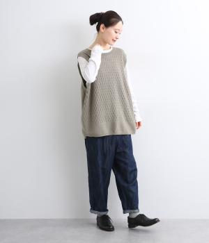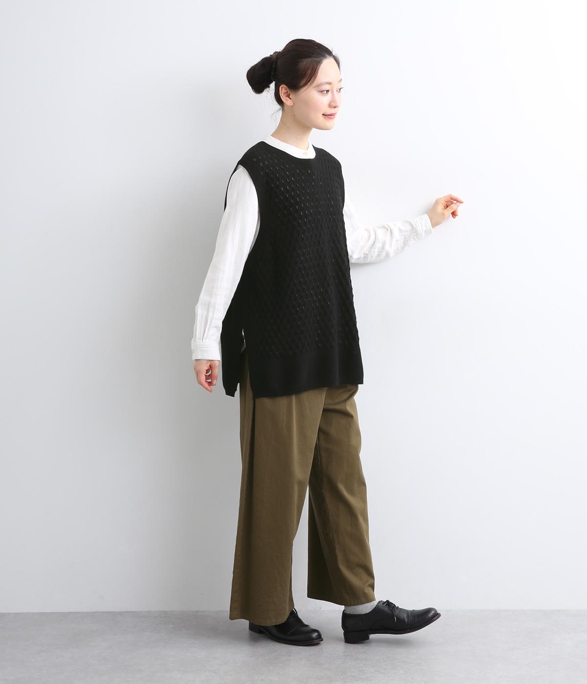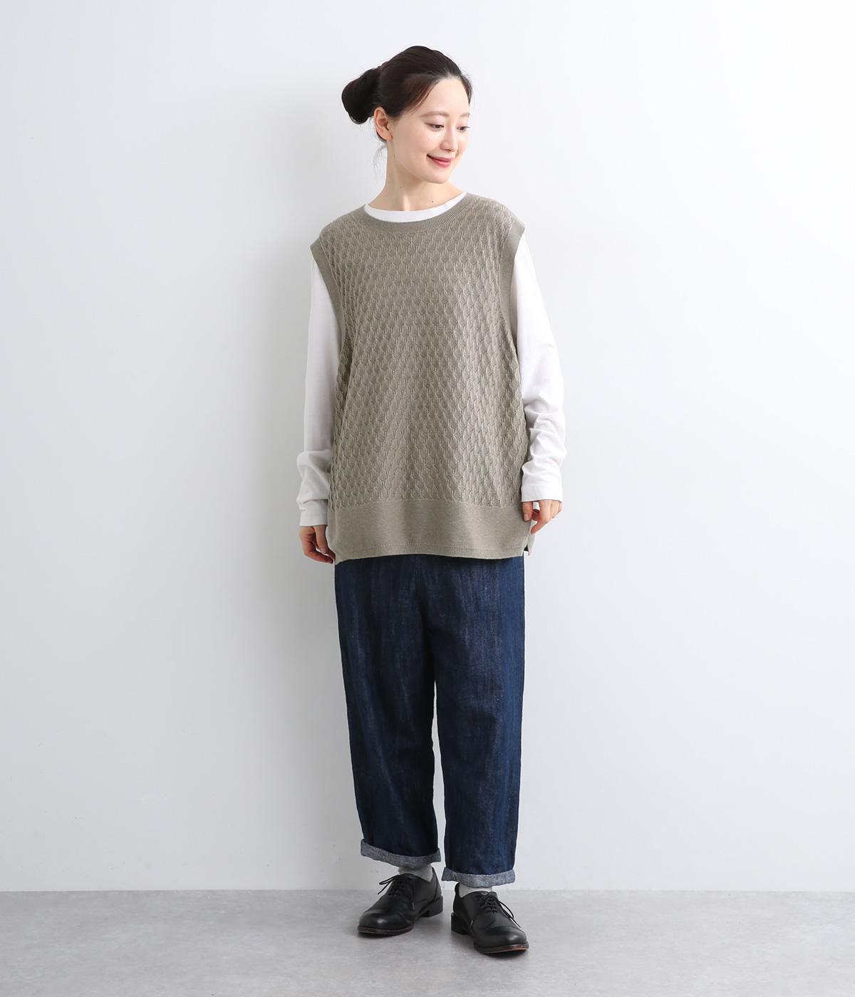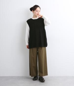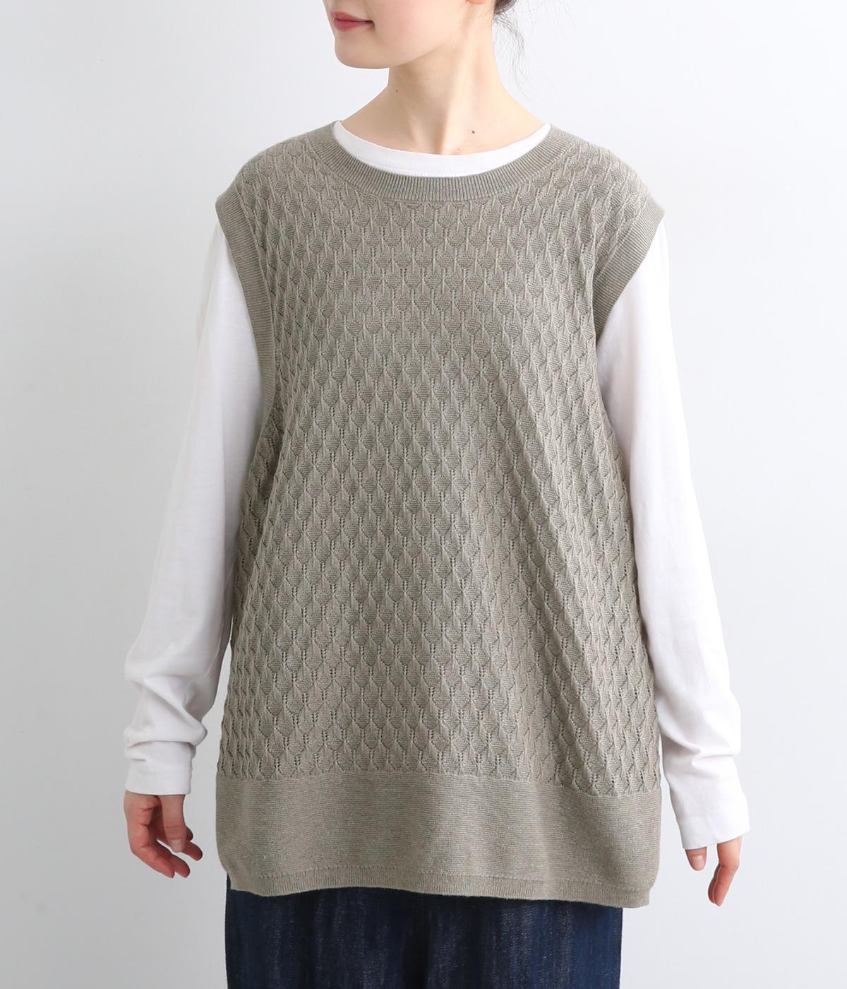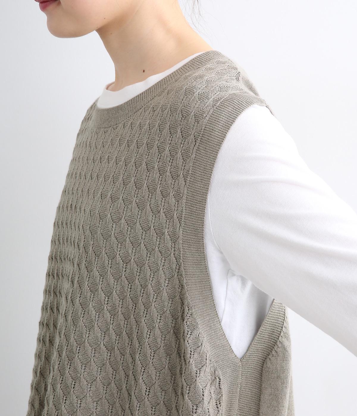 立体感のある透かし編みをフロントにあしらったニットベスト。ゆとりのあるシルエットで、アームも広く取られているのでさまざまなトップスに重ねやすいです。ヒップが隠れる丈感でさりげなく体型カバーも叶います。