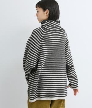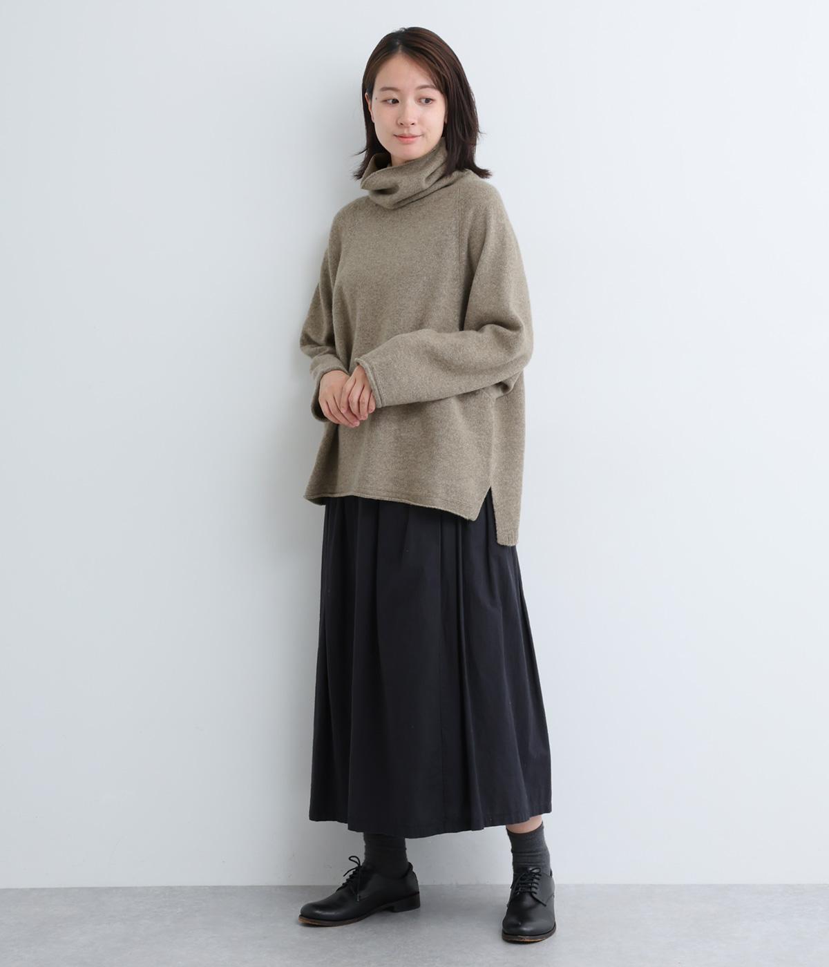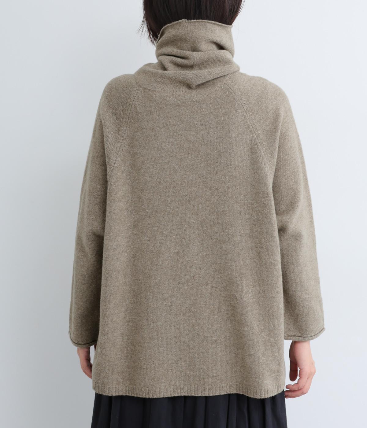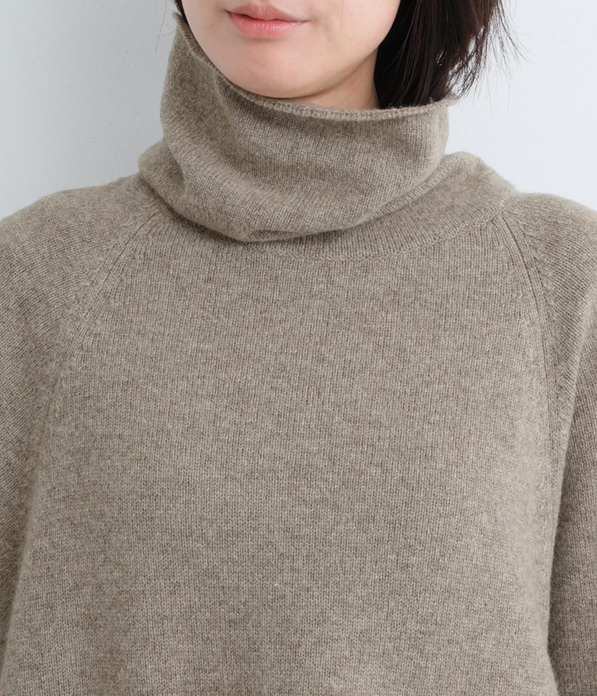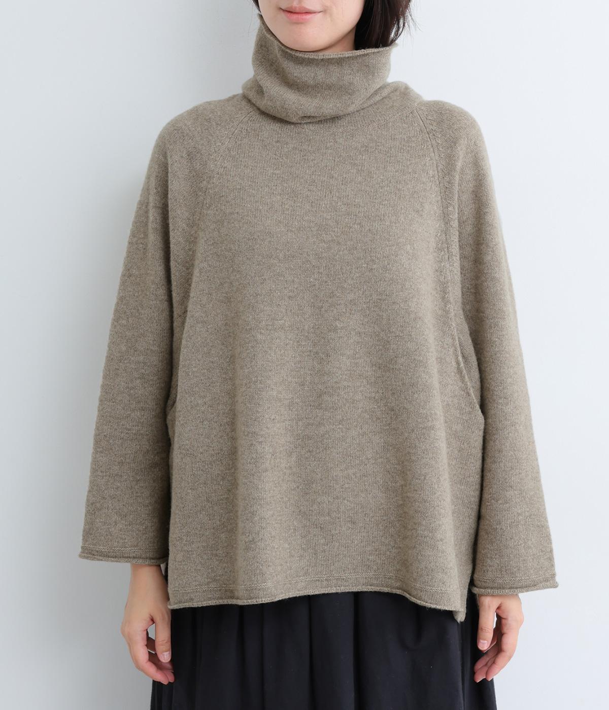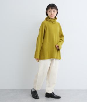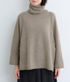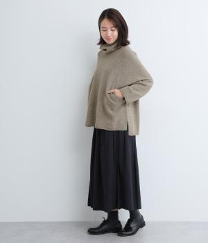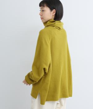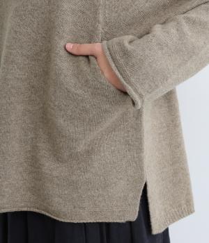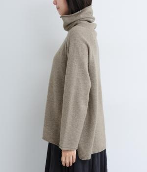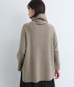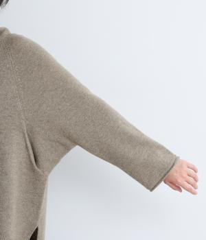 くしゅっとたるむハイネックが顔まわりにボリュームをもたせ、シンプルながらも着こなしのポイントになる一枚。ゆったりとしたラグラン袖につながるサイドポケットもユニークなポイント。スリット入りでボトム合わせもすっきりまとまります。