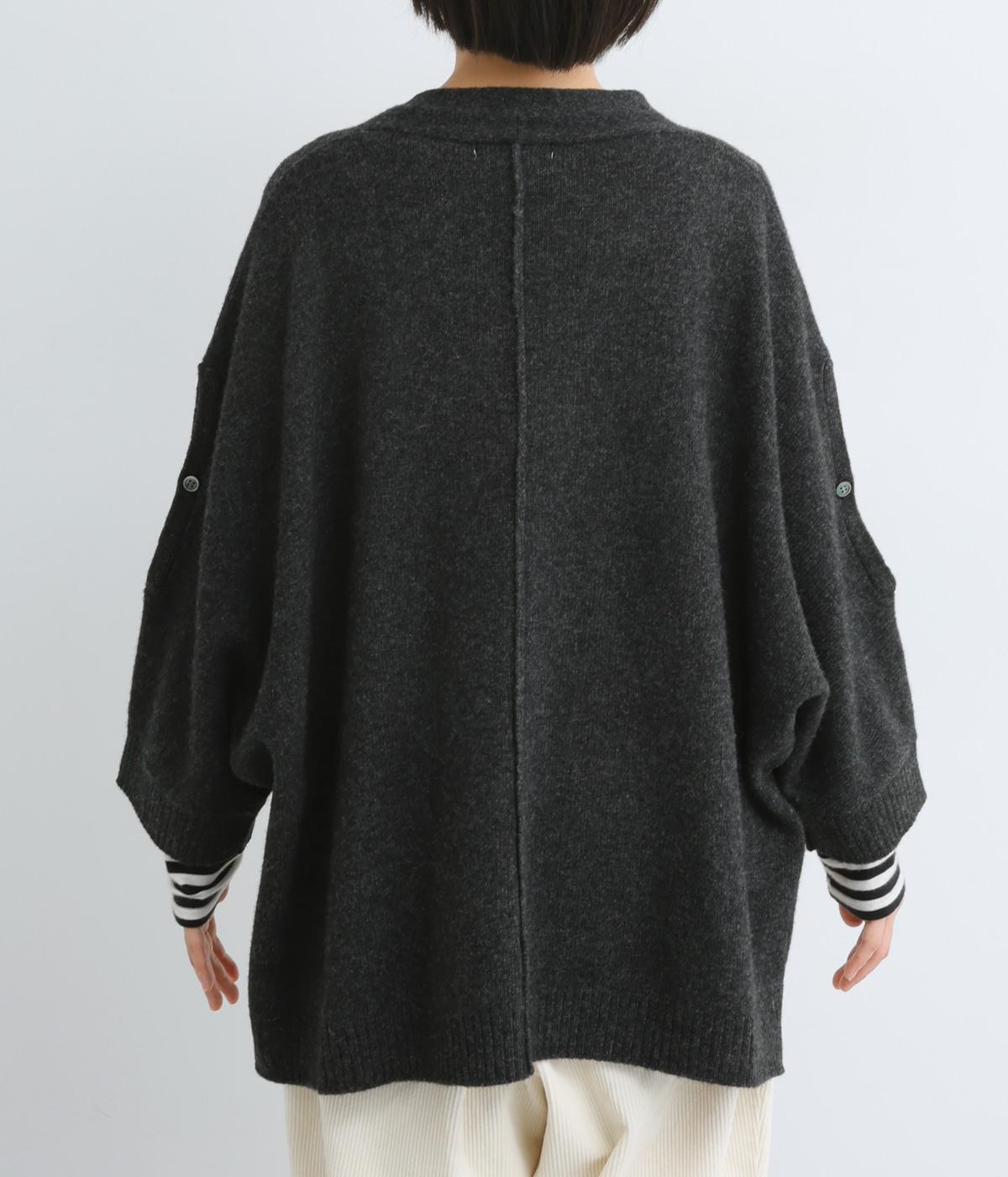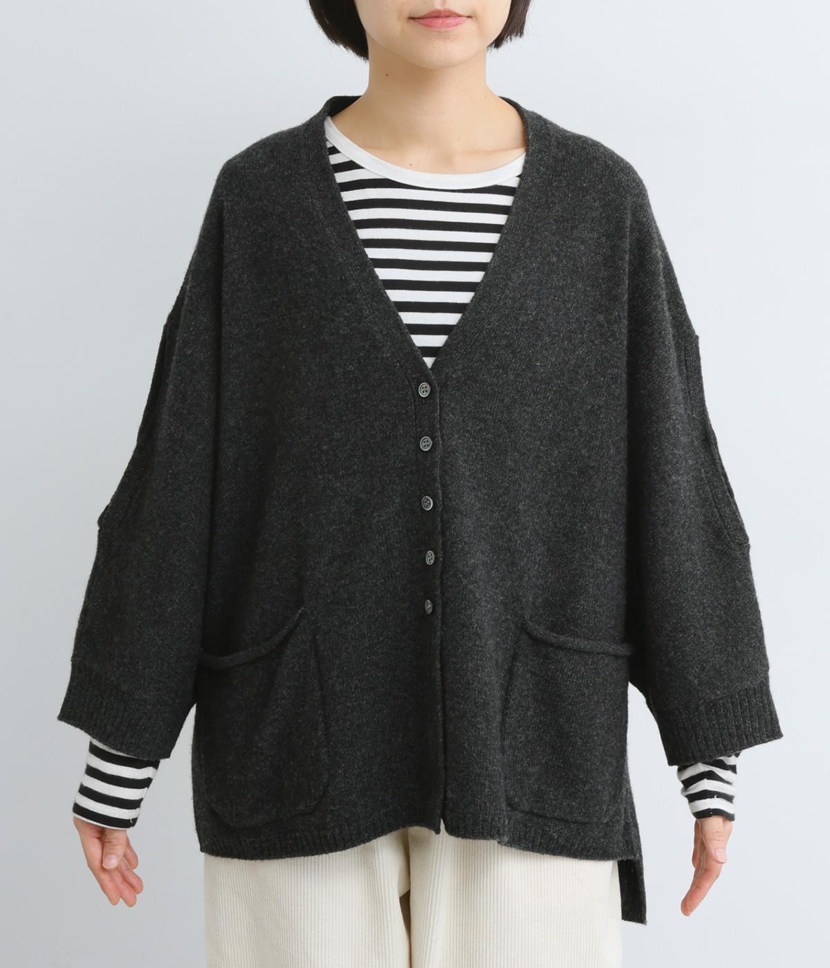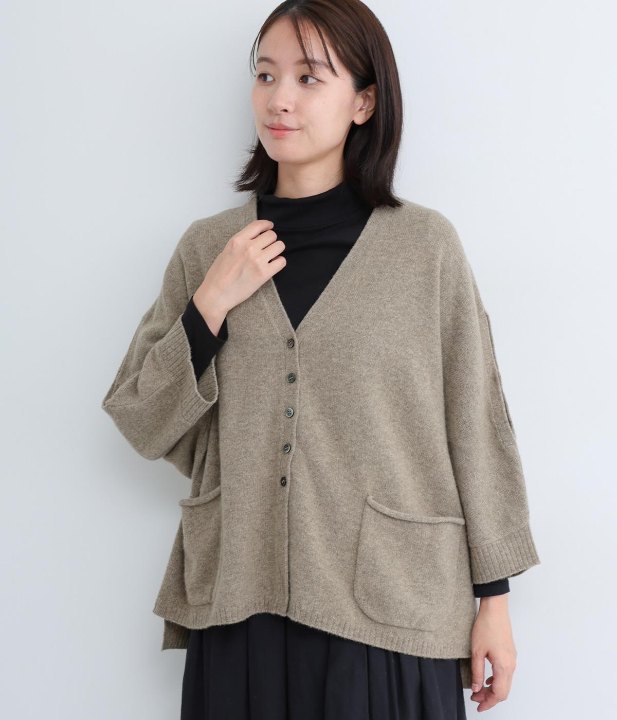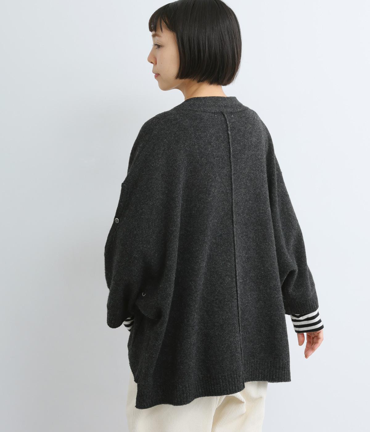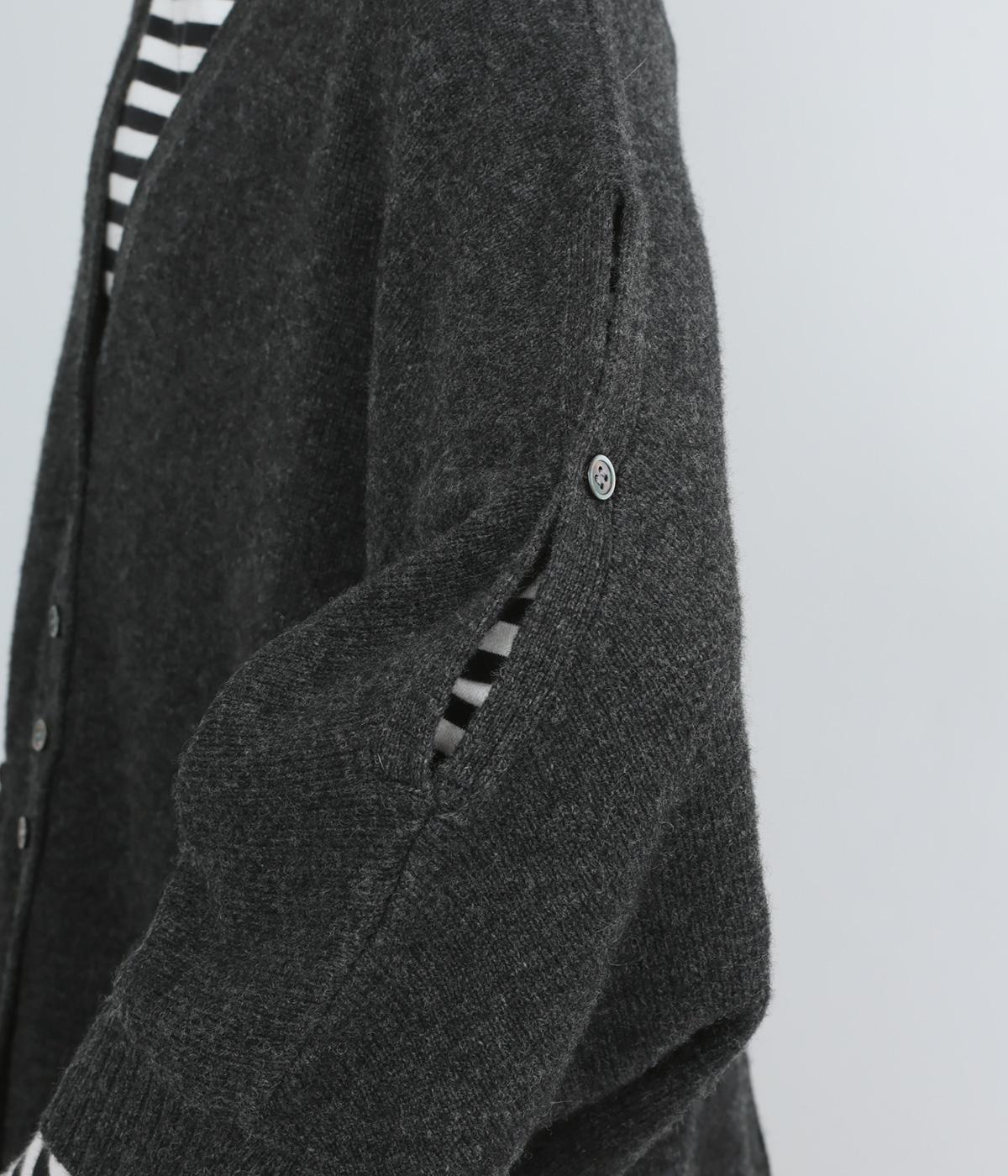 ゆったりとしたVネックのカーディガンは、ベーシックなドルマンスリーブとしても、袖の中央のホールから腕を出してベスト感覚でも着こなせる2way仕様。ユニークなデザインが他にはなく、一枚持っているとさまざまなスタイリングたたのしめます。