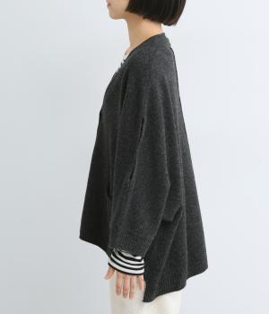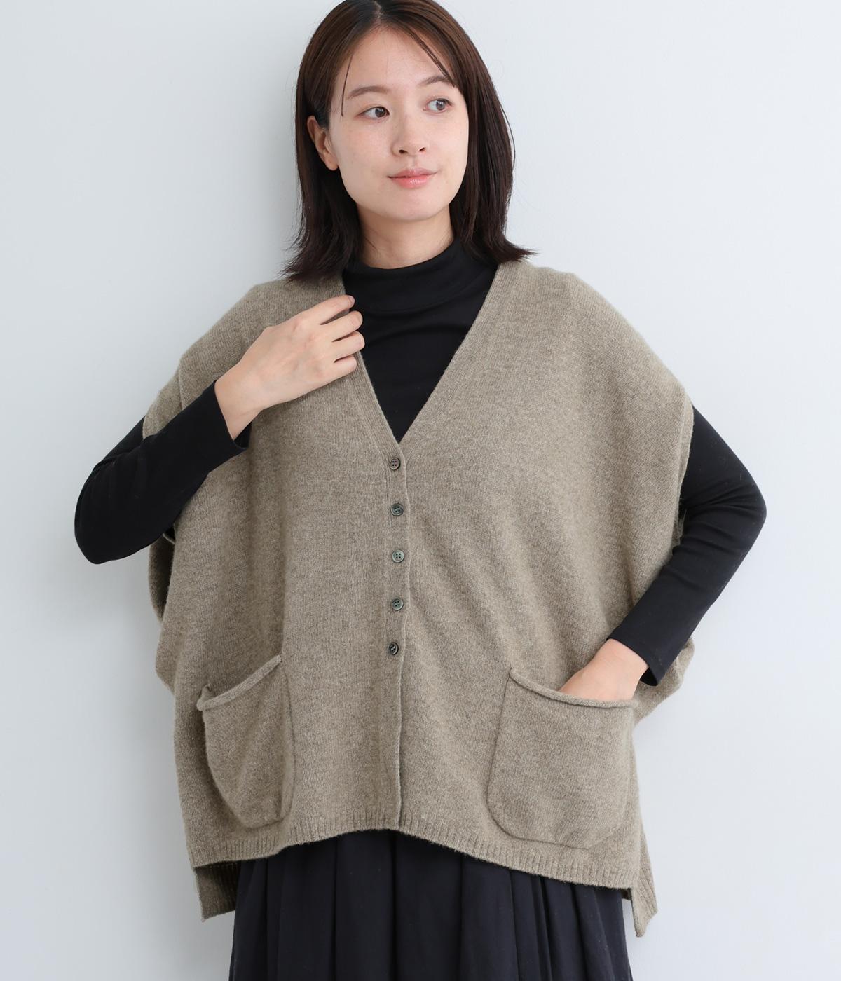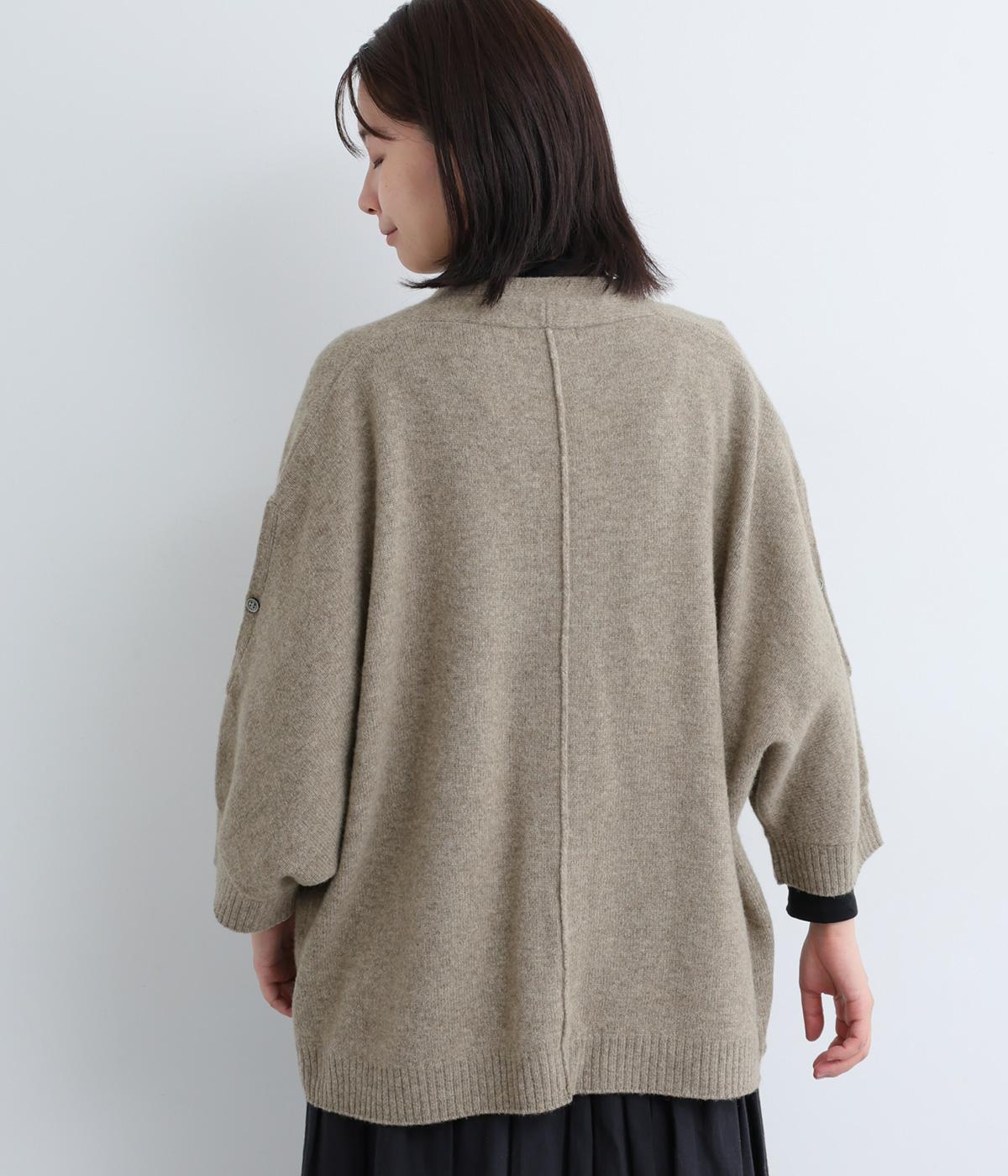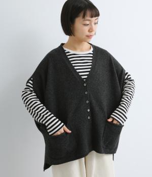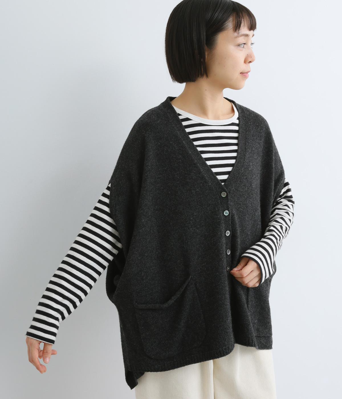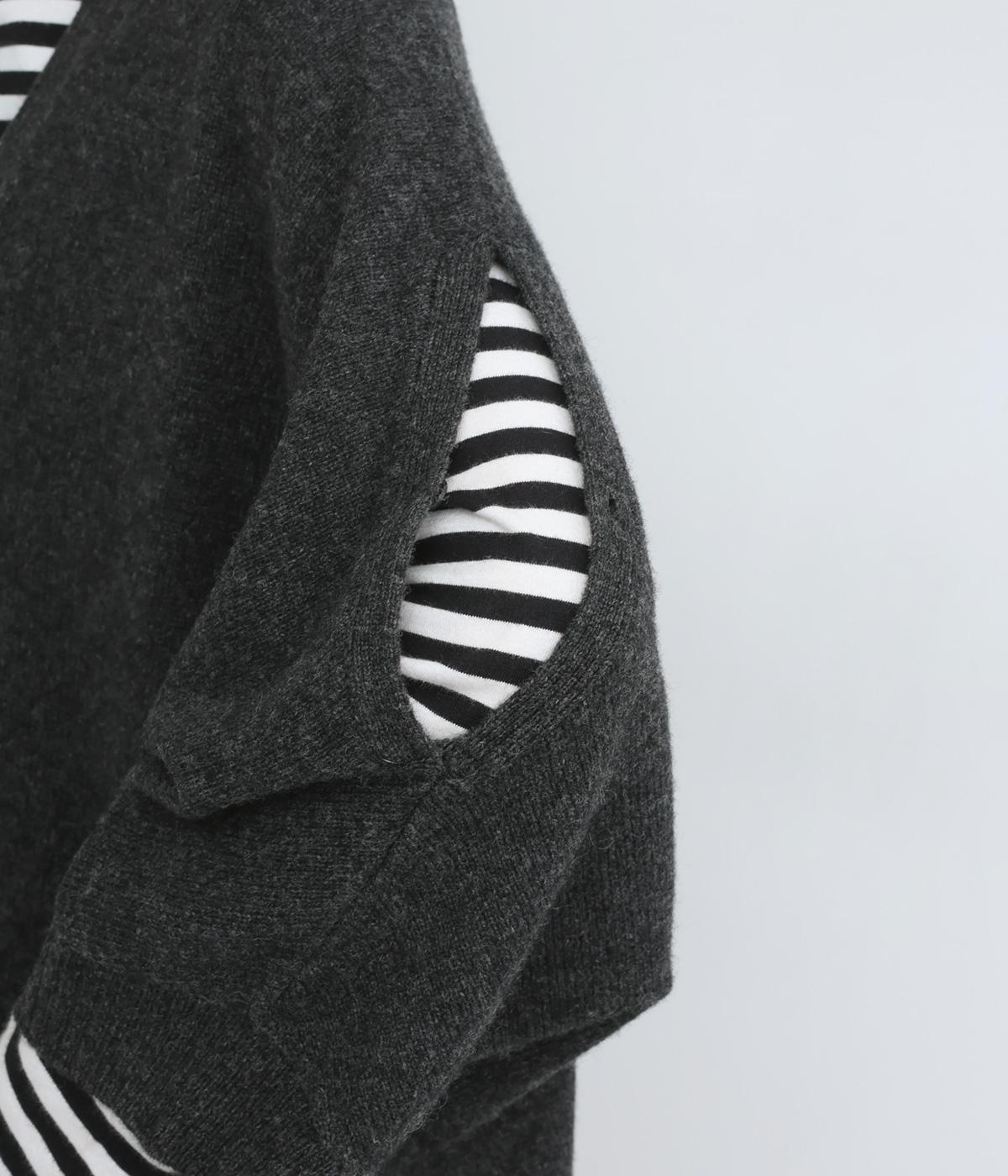 ゆったりとしたVネックのカーディガンは、ベーシックなドルマンスリーブとしても、袖の中央のホールから腕を出してベスト感覚でも着こなせる2way仕様。ユニークなデザインが他にはなく、一枚持っているとさまざまなスタイリングたたのしめます。