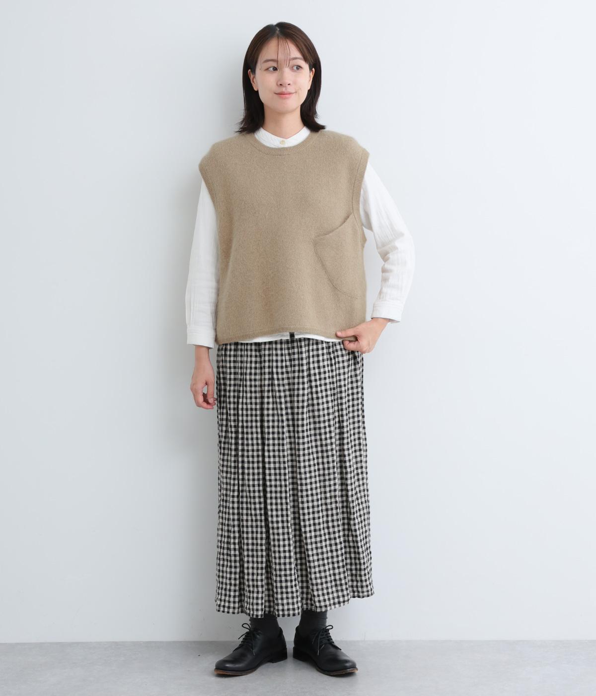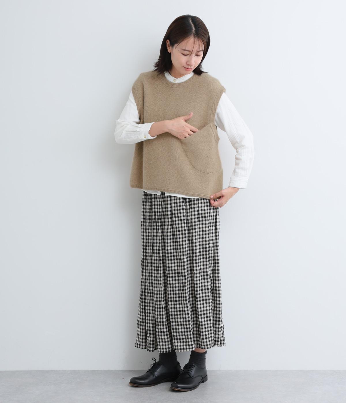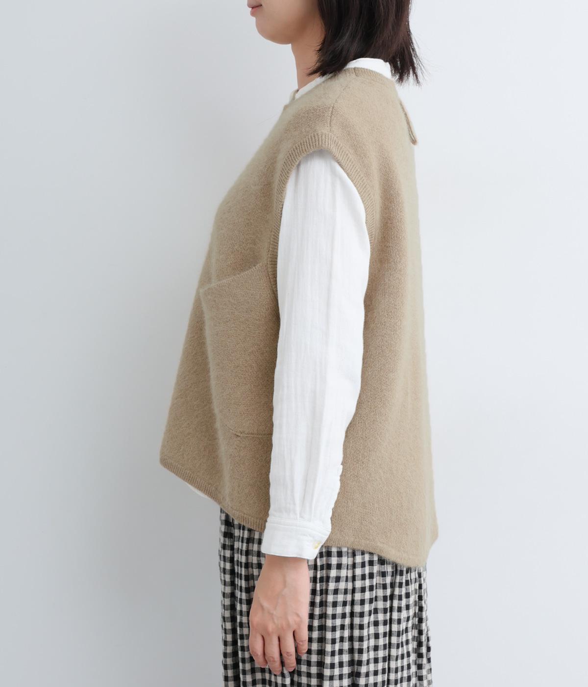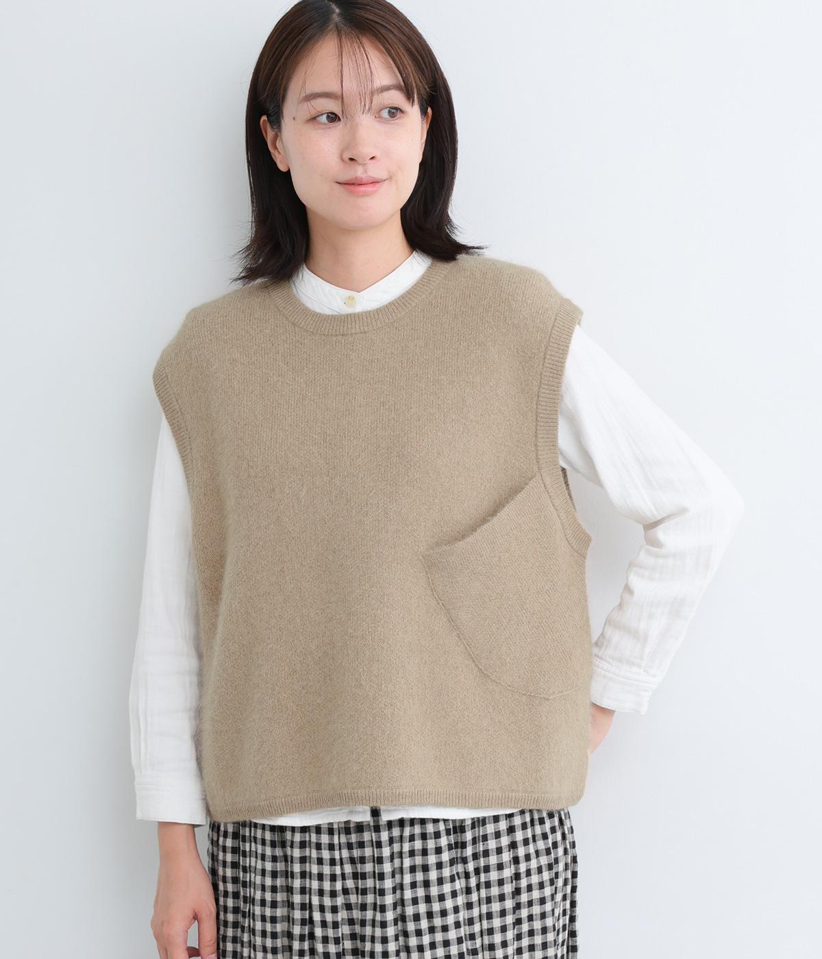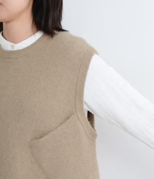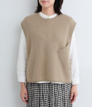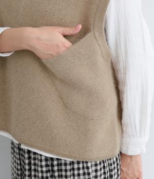 大きなポケットをななめにつけたアシンメトリーなデザインが印象的なベスト。品のいい素材感とアソビのある仕立ての絶妙なバランスが魅力で、大人のデイリースタイルのポイントになります。後ろ裾をラウンドさせているので横姿もきれい見え。