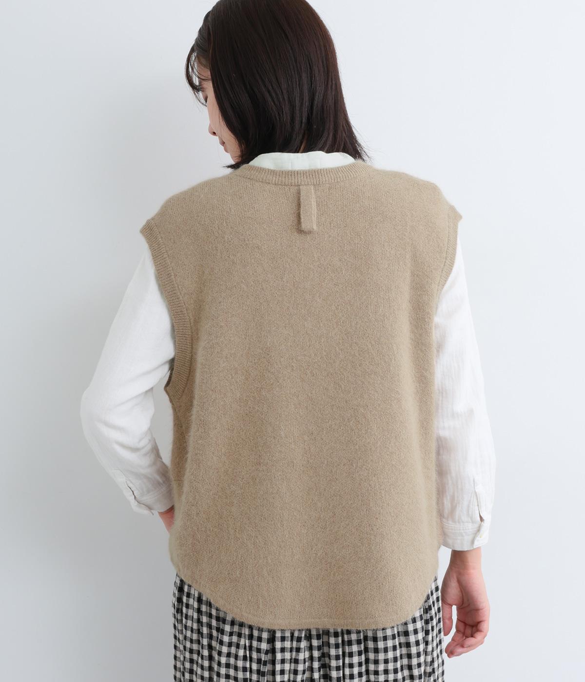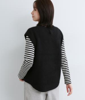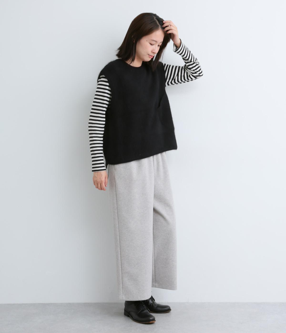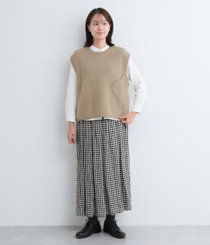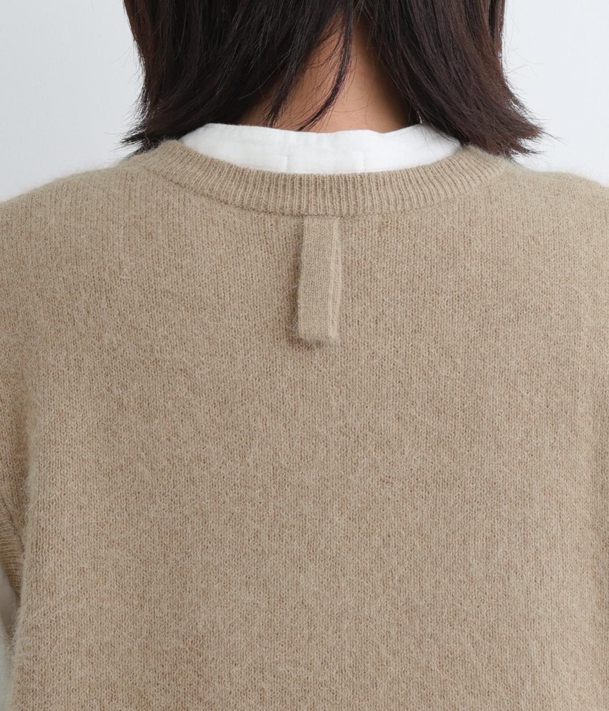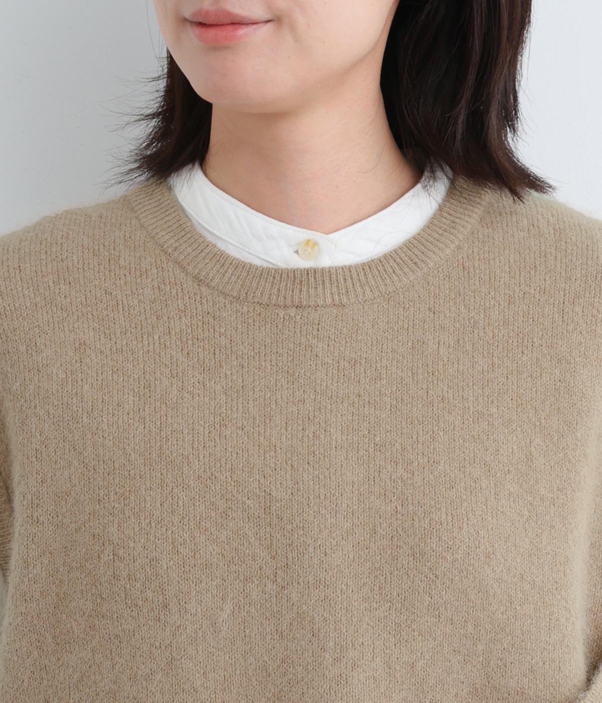 フォックスと羊毛をまぜた、ふわりとしたあたたかな表情が魅力のウールニットを使用。ナイロンやレーヨンもまぜているので、やわらかく自然な落ち感があります。