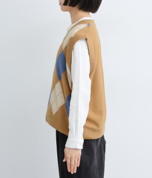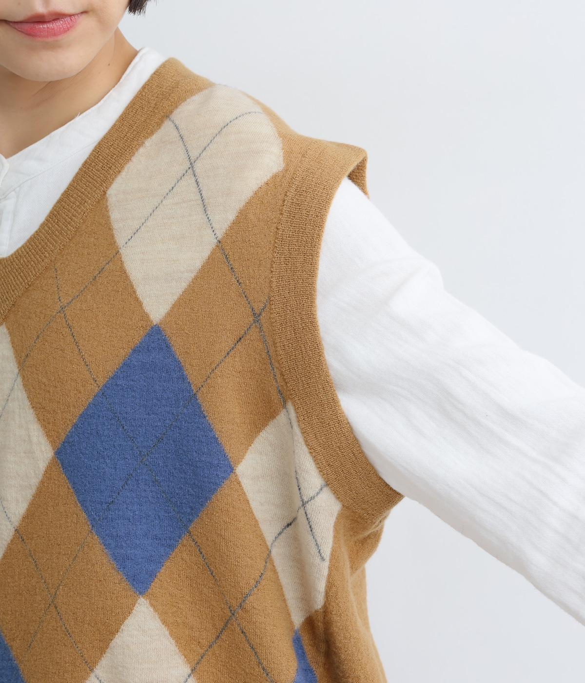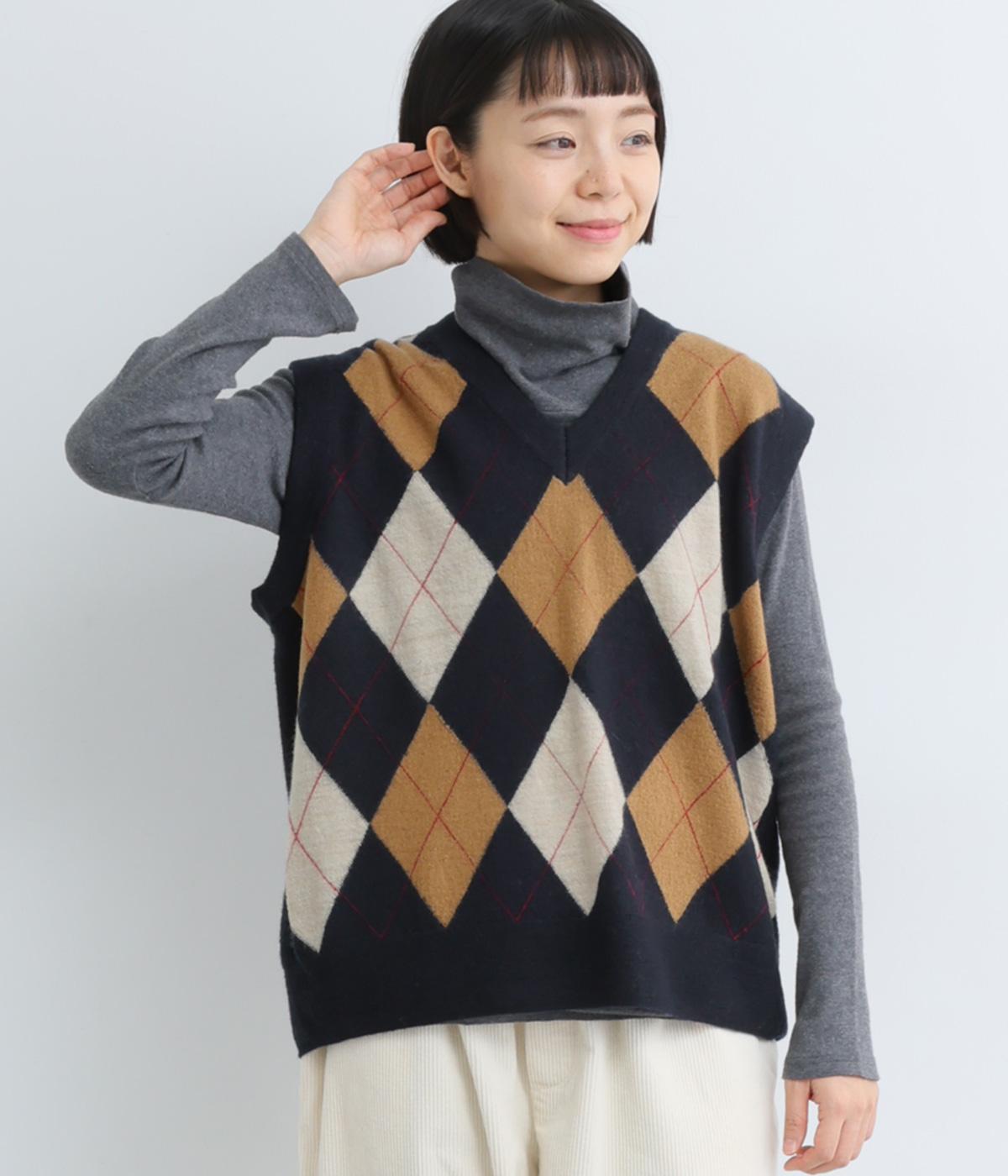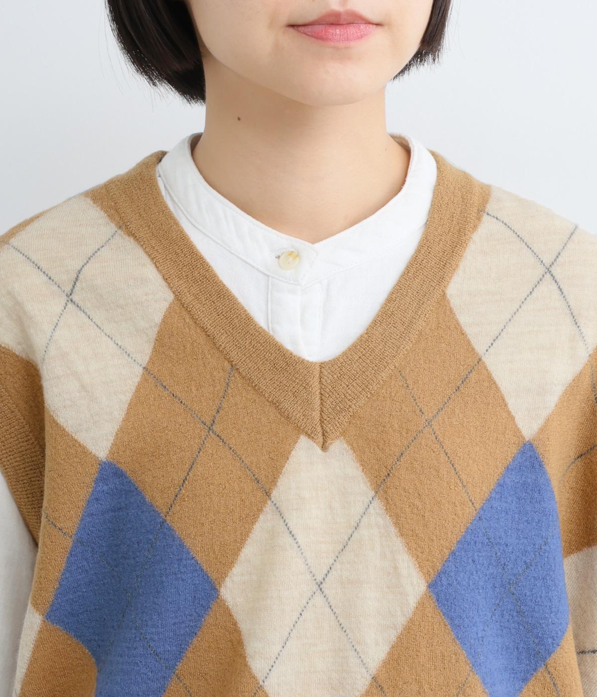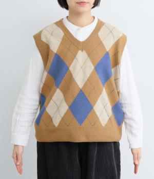 いつものスタイリングにプラウっするだけでトラッドファッションをたのしめる、アーガイル柄ニットベスト。肉厚すぎず、ゆとりのあるサイズ感でレイヤードしやすく仕上がっています。Vネックの抜け感もちょうどよく、襟つきトップスとも好相性です。