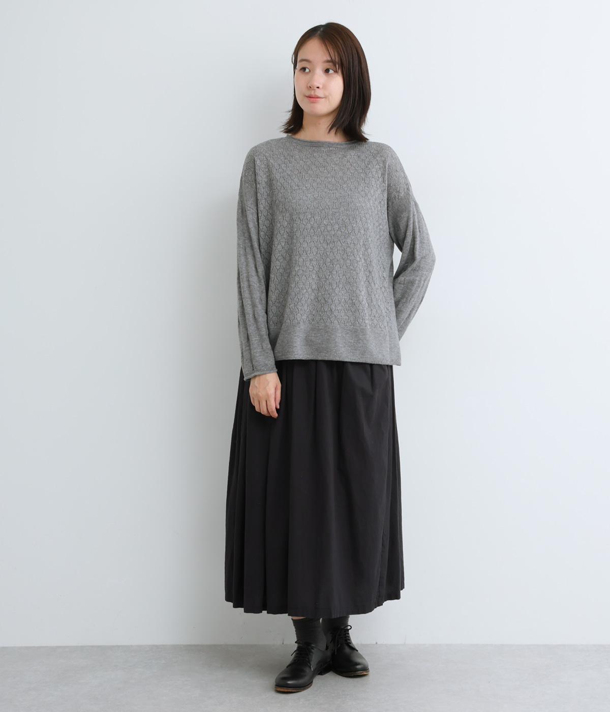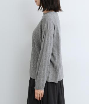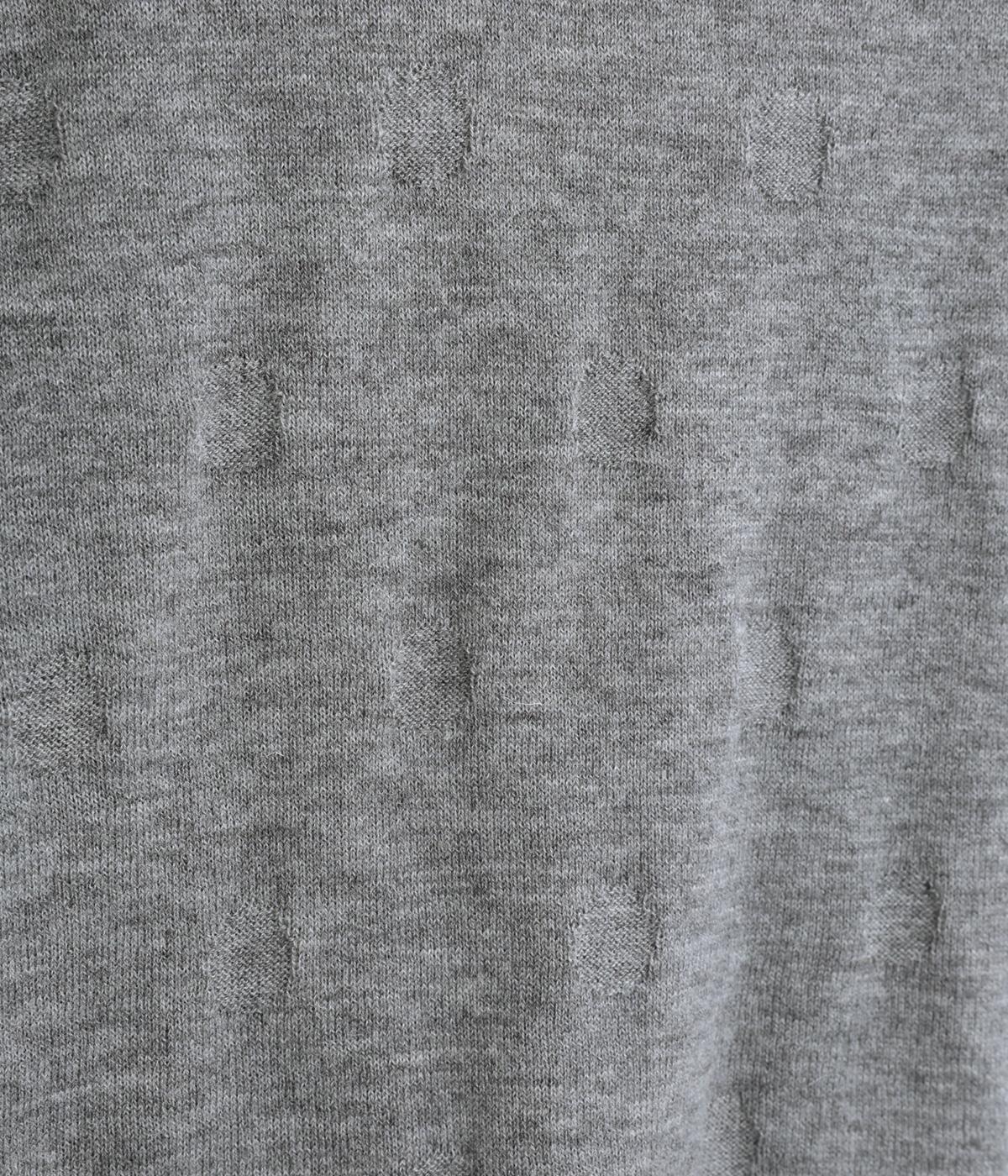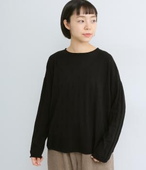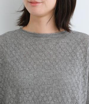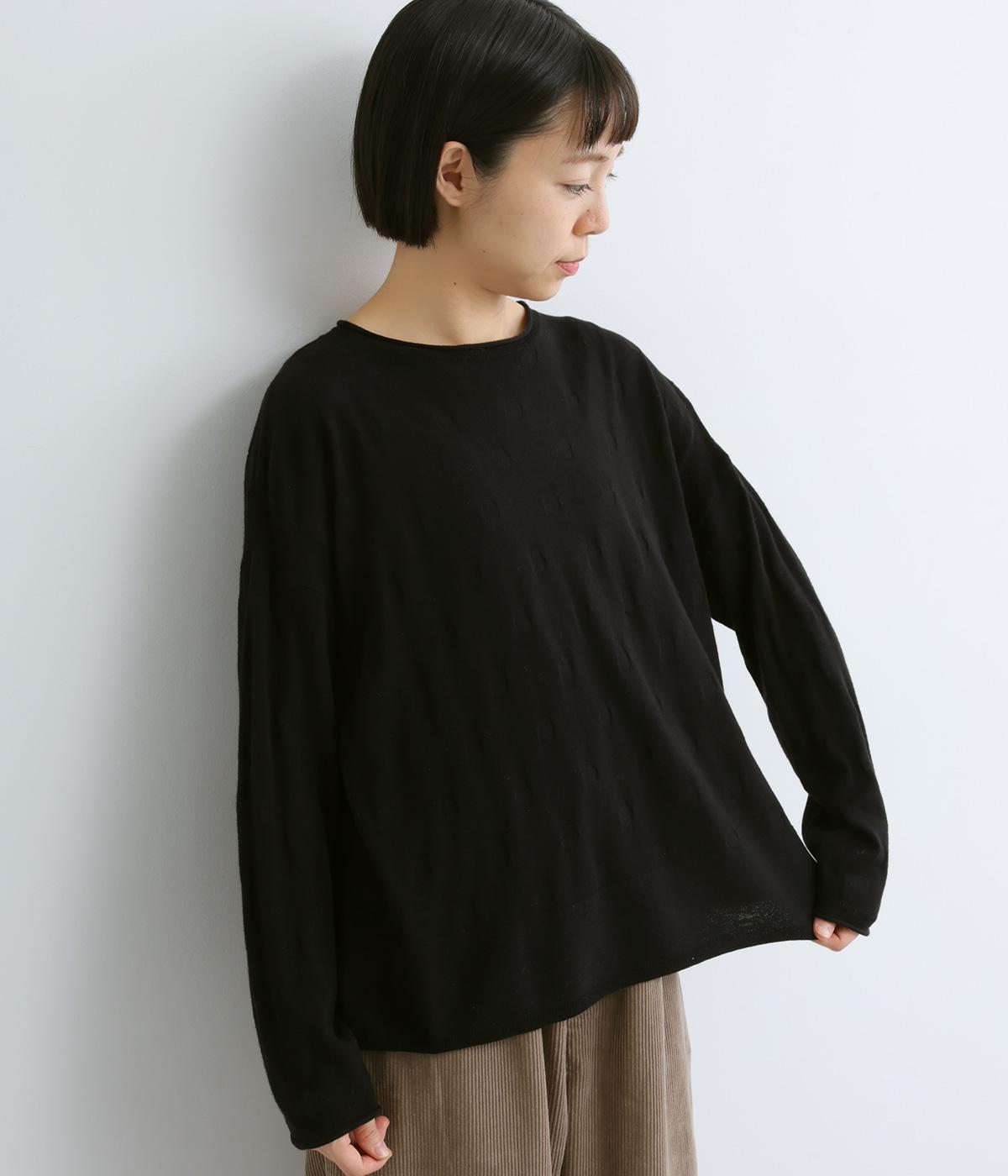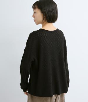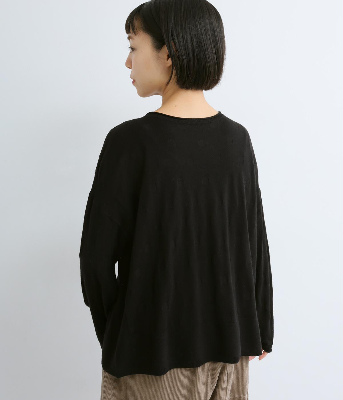 無地感覚で着やすいさり気ないドットジャカードとスカシ柄、どちらをメインにしてもたのしめる前後2wayのプルオーバーです。落ち感のあるやわらかな素材に適度なサイジングでスタイリングしやすい仕上がり。落ち着いた配色でデイリーに着まわせます。