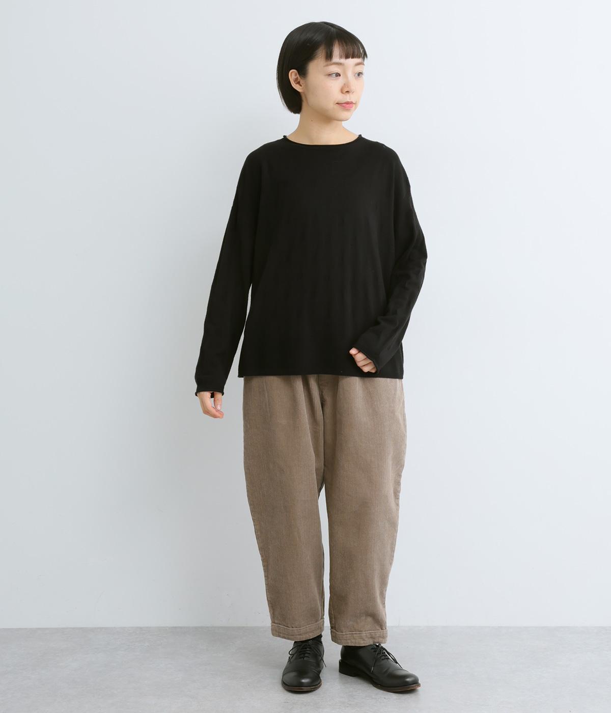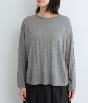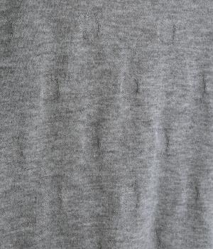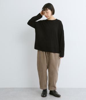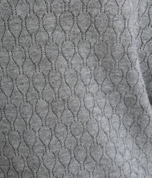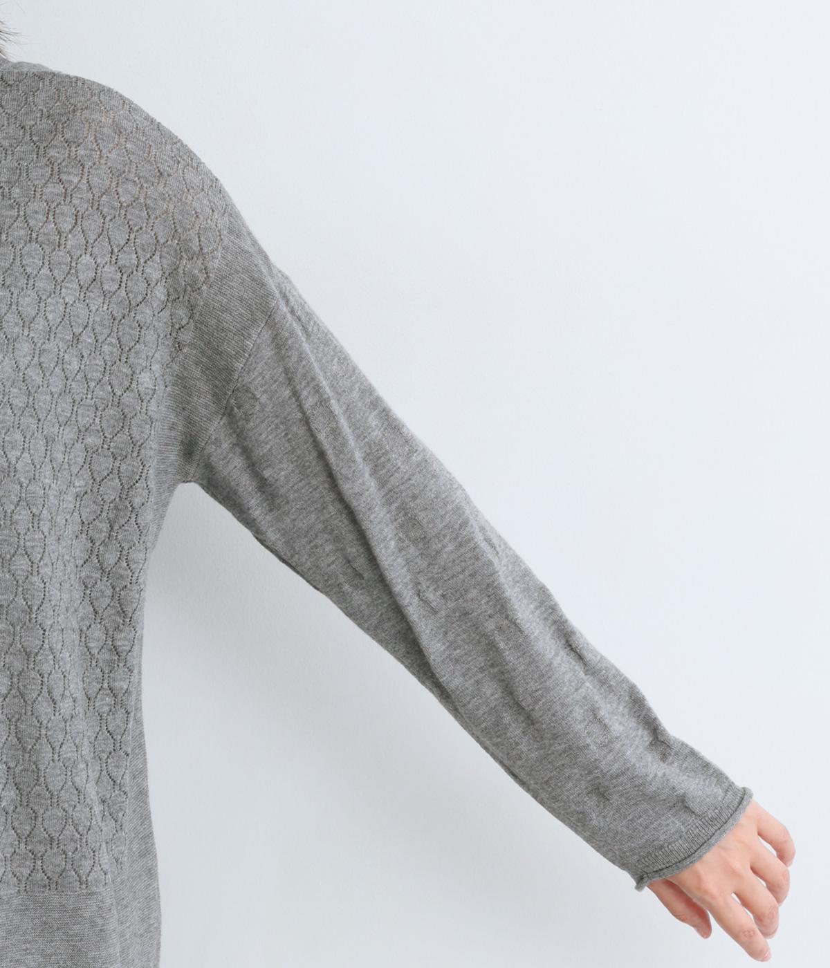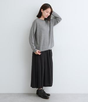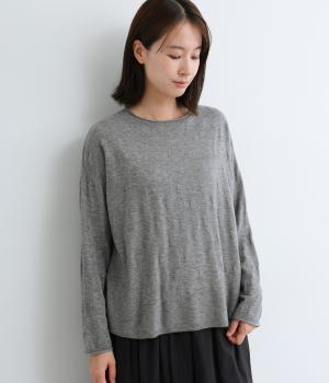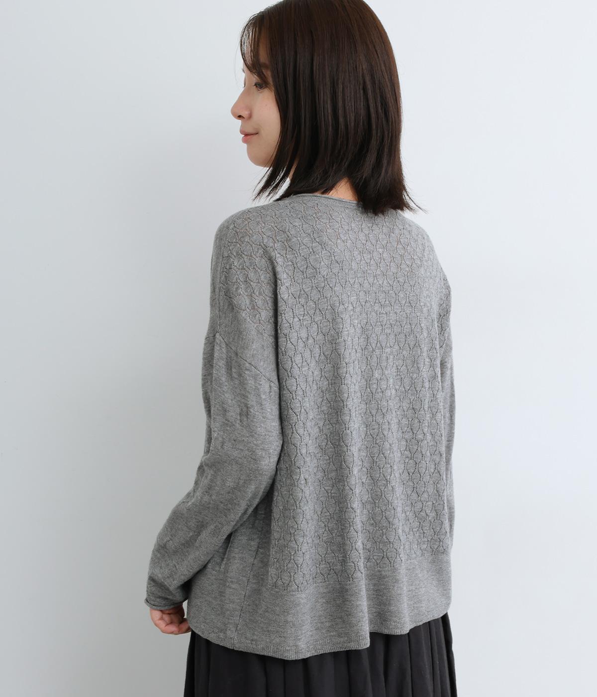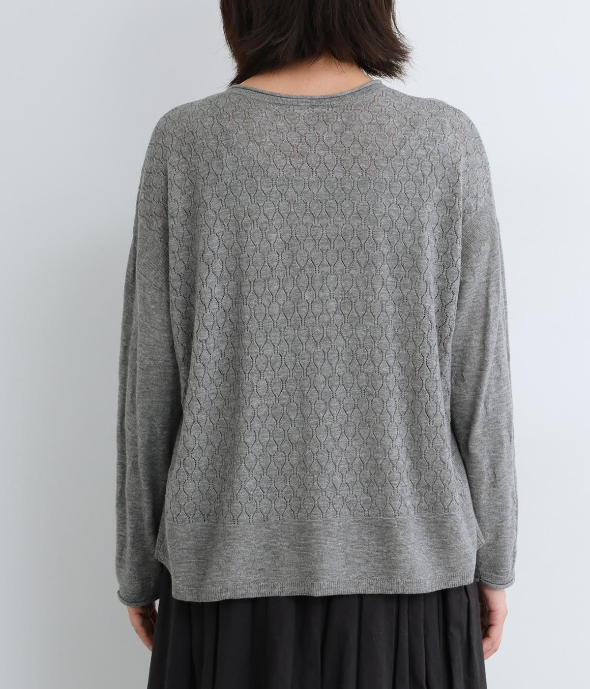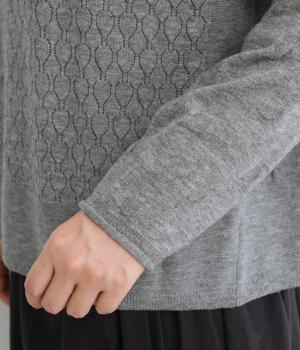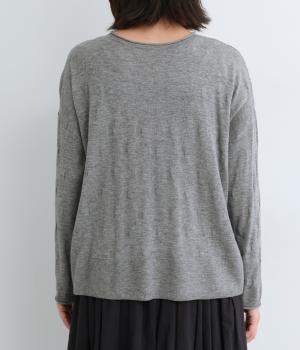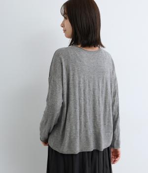 ウールであたたかみを持たせながらもナイロンやアクリルも混ぜて軽やかに編み上げました。繊細でやわらかな薄手素材で羽織りのインに着込みやすいニットになっています。