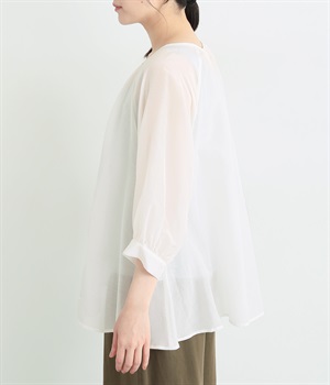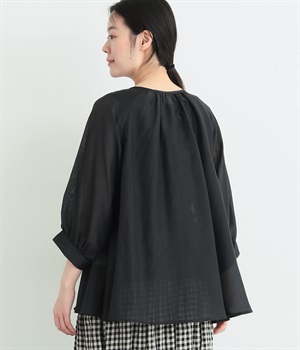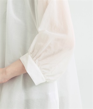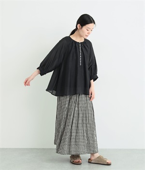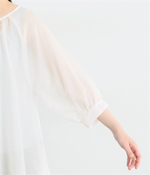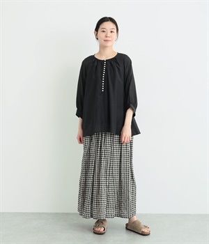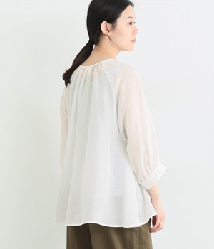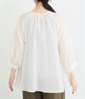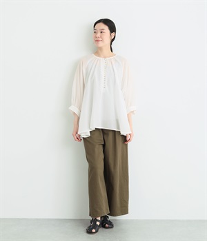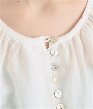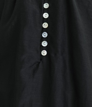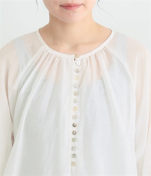 光沢のあるシェルボタンをたくさん並べたデザインが品のいいアクセントになっています。袖口や襟ぐりにたっぷりとギャザーを寄せて、全体的にふわりとやさしく優雅な雰囲気に仕上げました。ラグラン仕様で動きやすいのもグッドポイント。