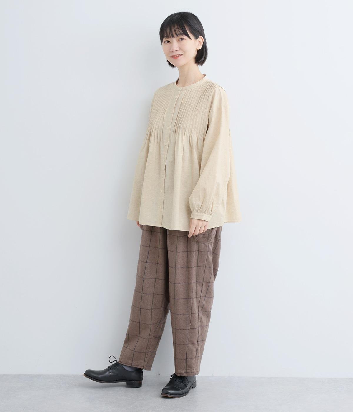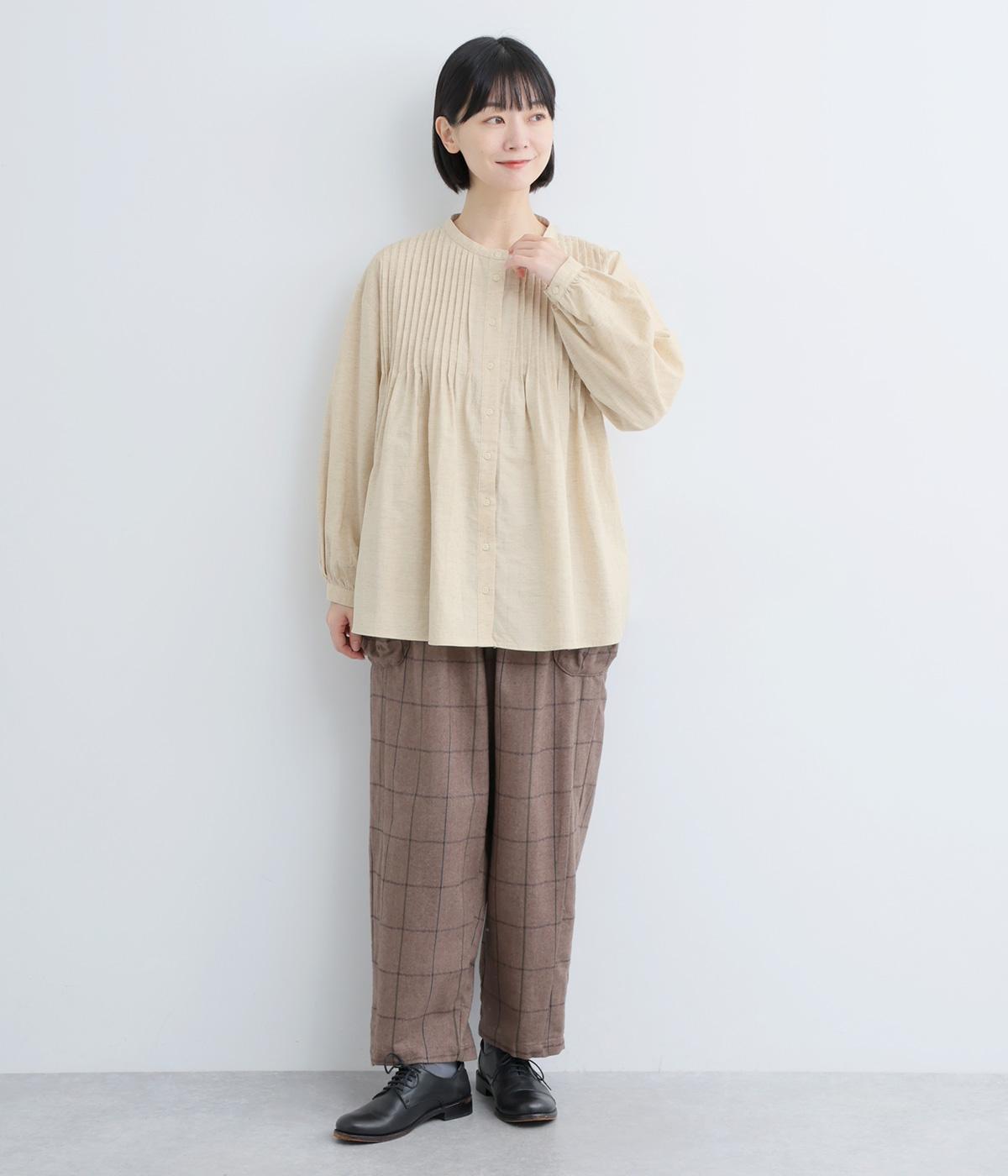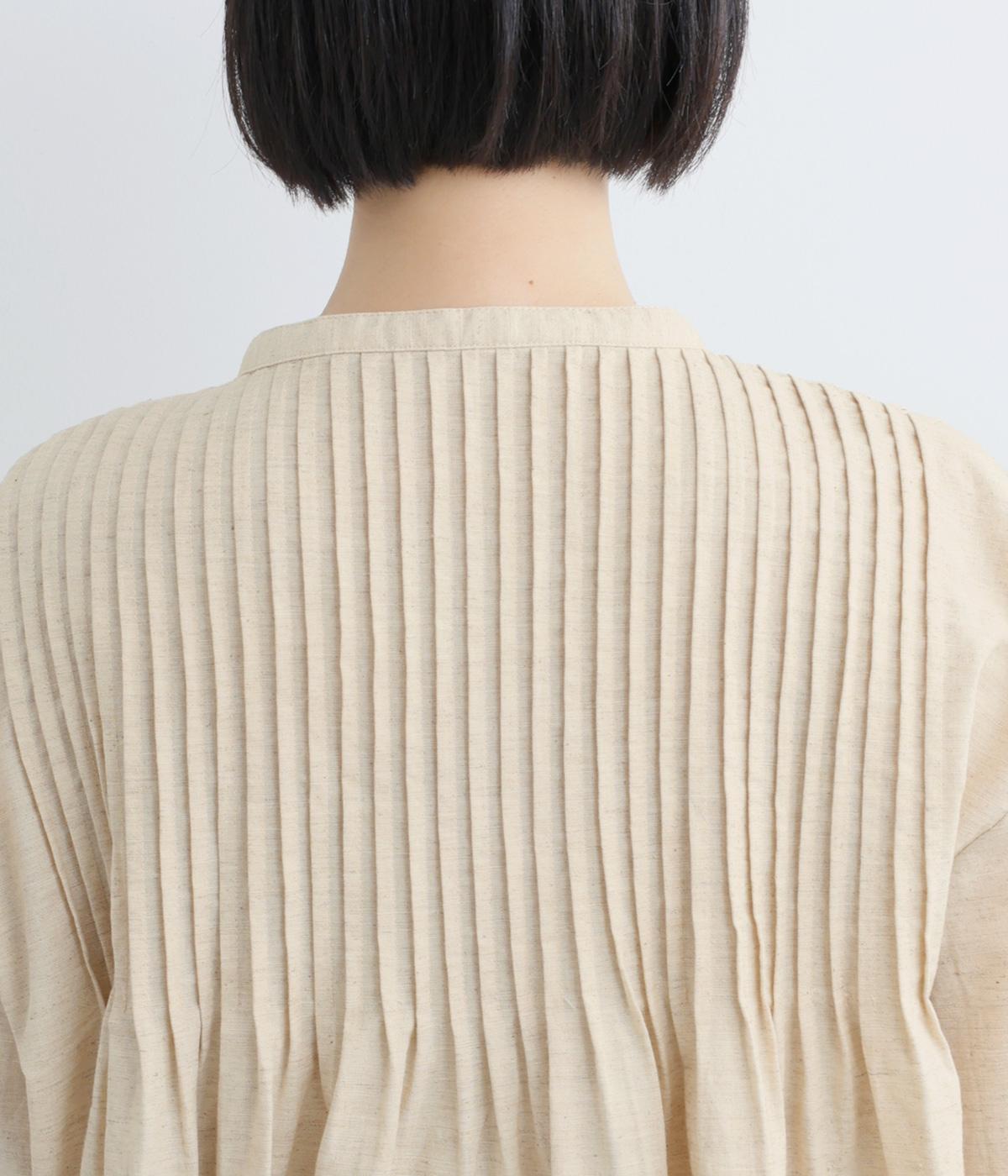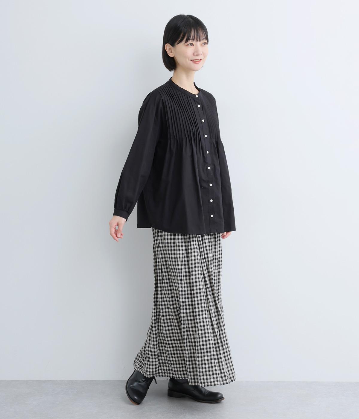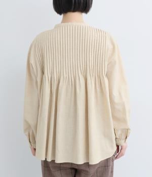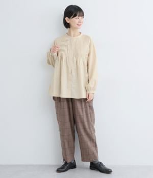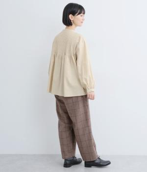 前見ごろと後身ごろには細やかなピンタックのあしらい。上品で華やかな雰囲気を感じさせます。裾にかけてやや大きめに広がるラインは可愛らしさと動きをプラスし、腰まわりもカバー。安心感も備えたブラウスです。