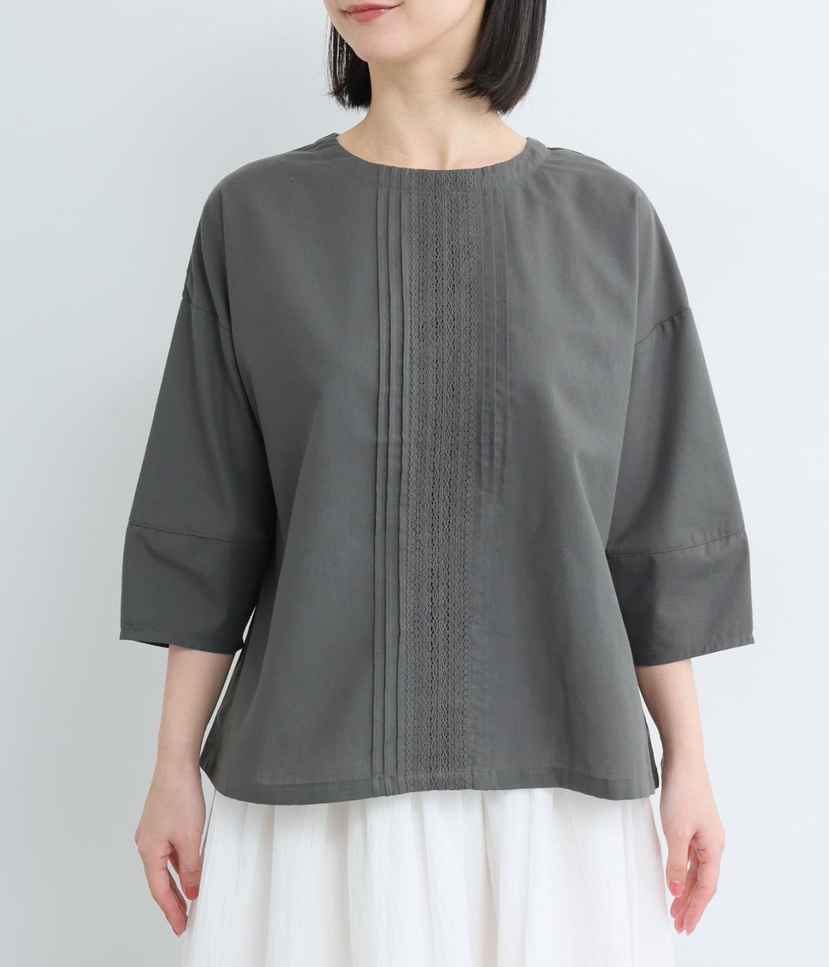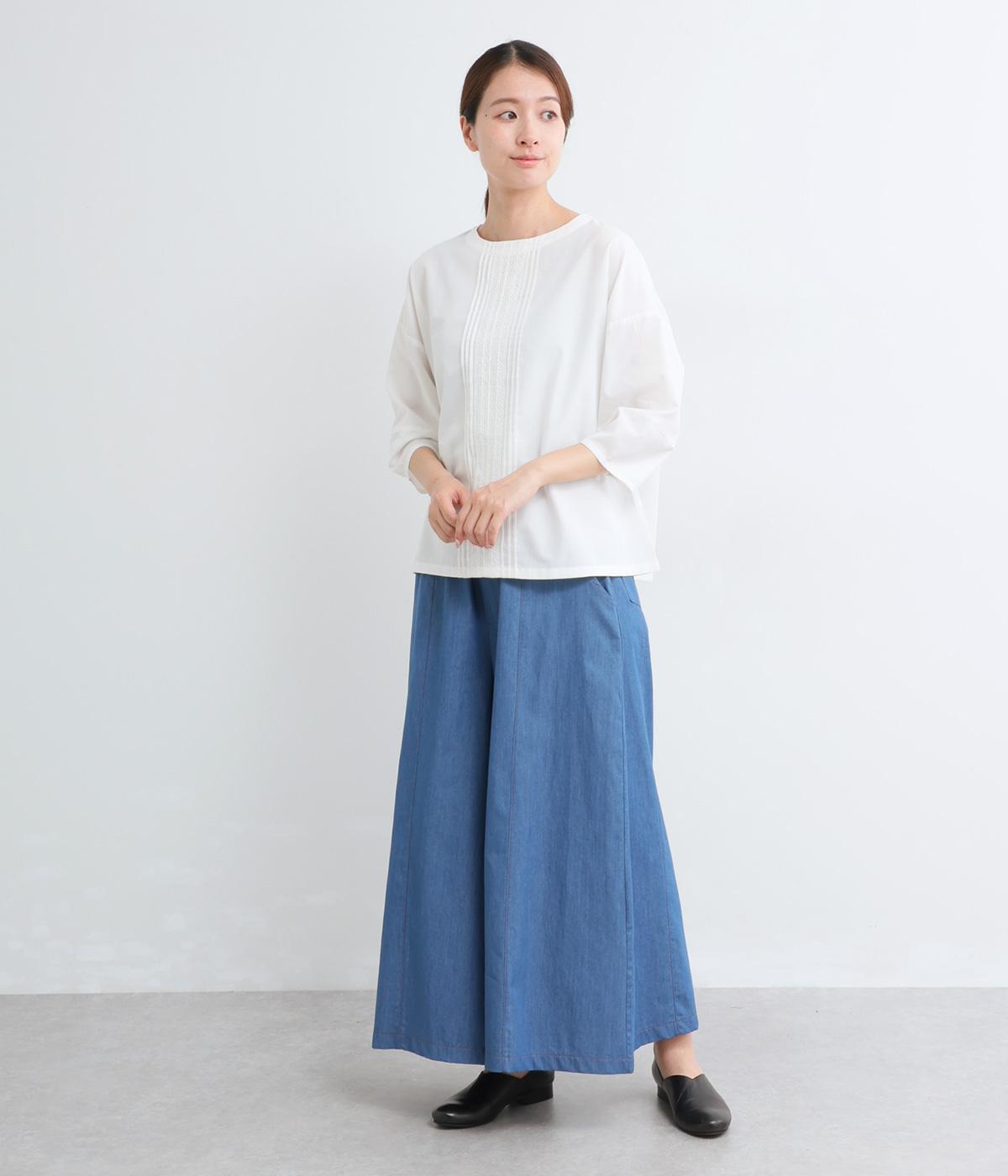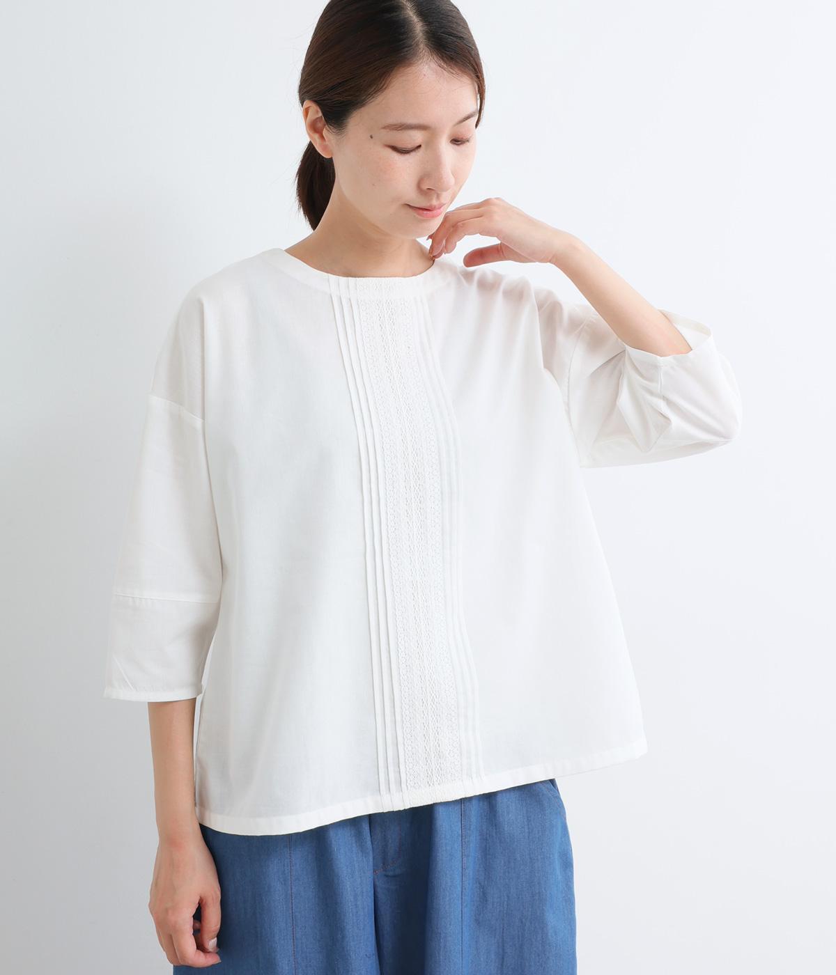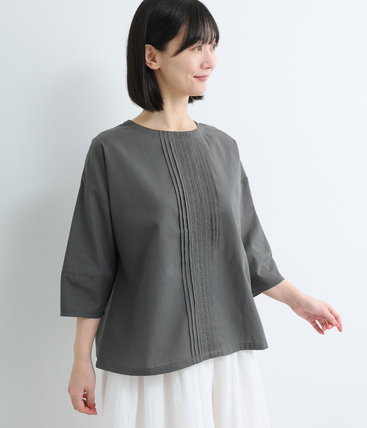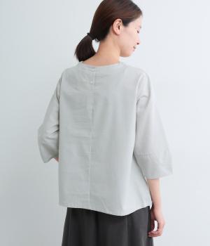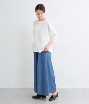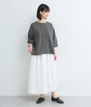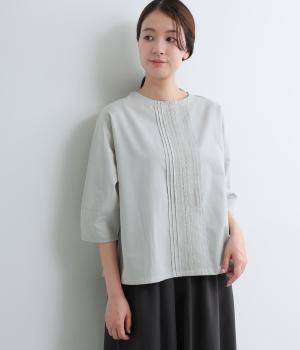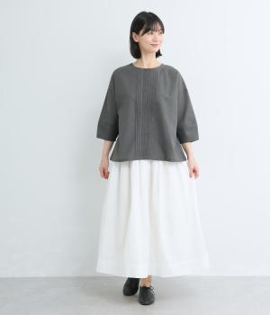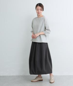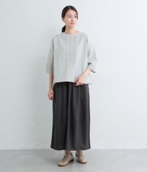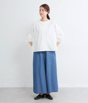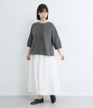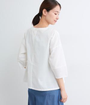 センターのピンタックや切り替えを入れたランタン袖が女性らしさを添える一枚。体のラインを拾いにくいゆったりめのボックスシルエットで着こなしやすく、パンツにもスカートにも合わせやすくなっています。