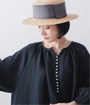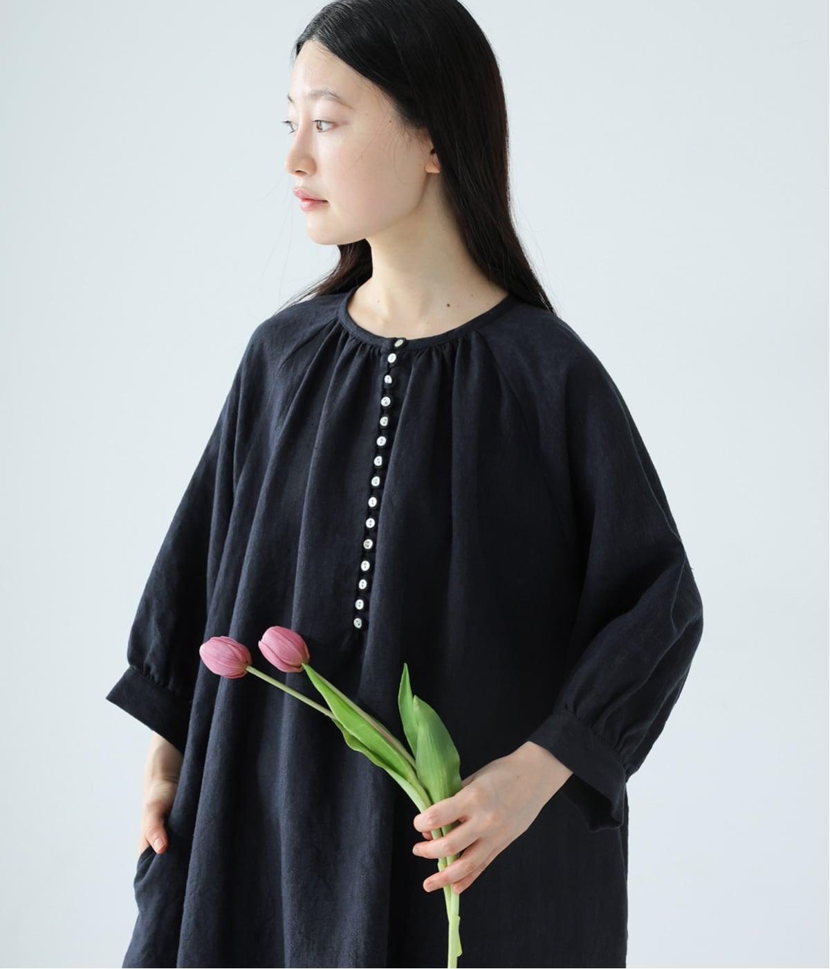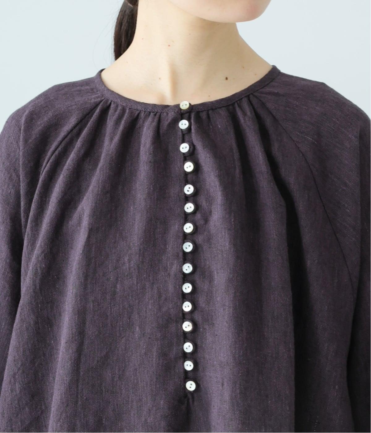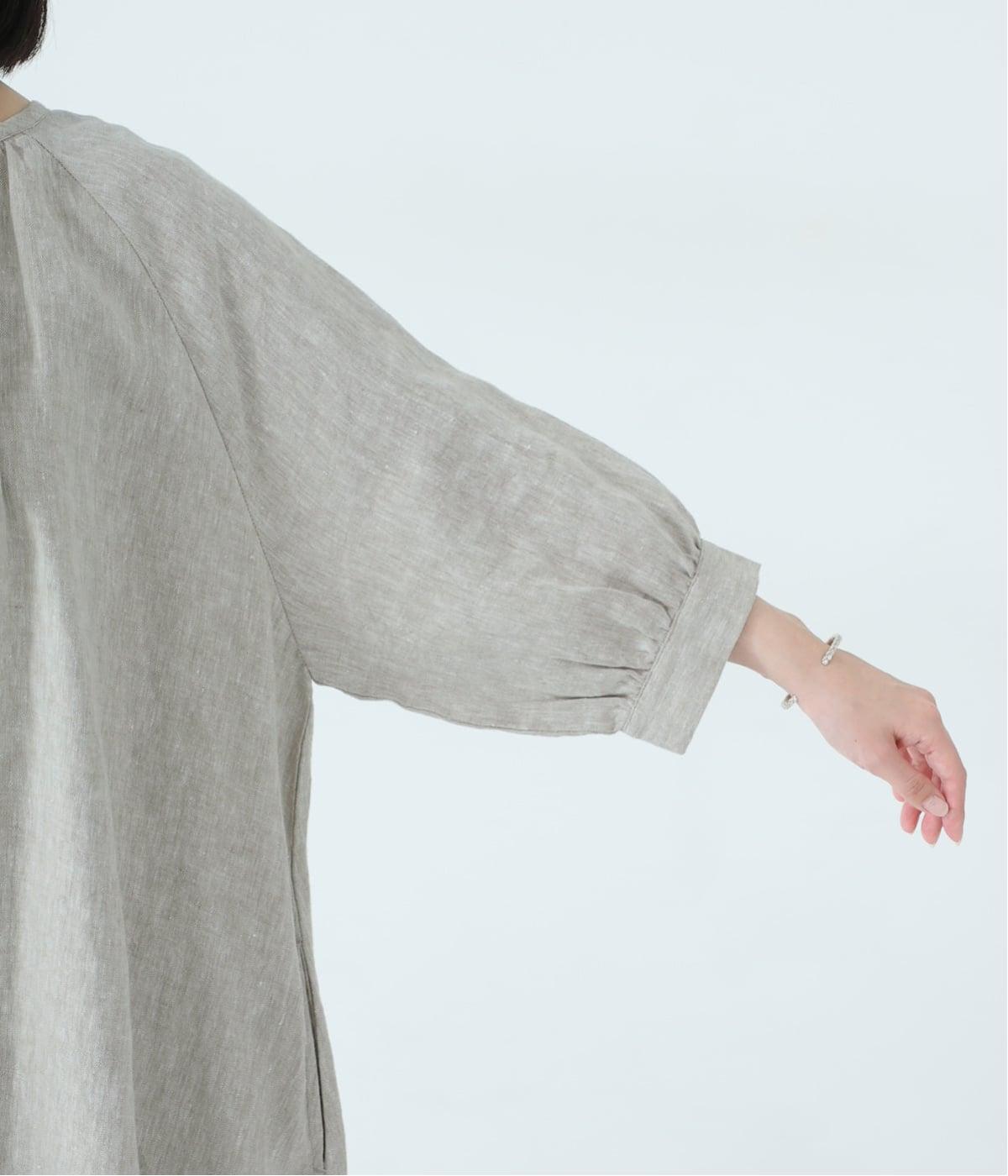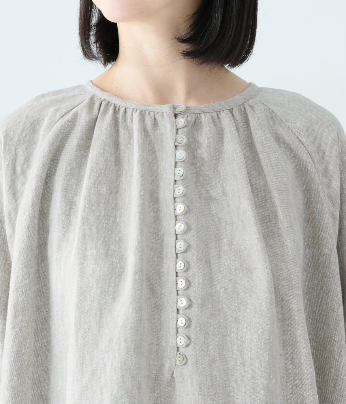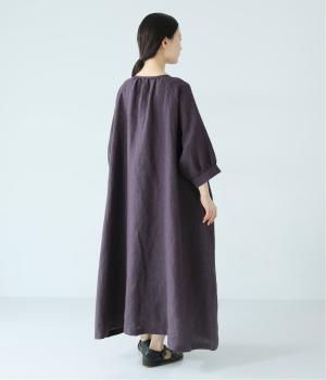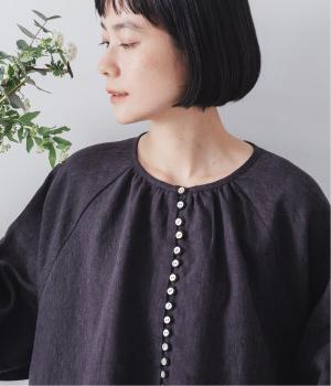 落ち感のあるリネン生地で、ゆとりがありながらもすっきりとした印象に。バックネックのギャザーが、後ろ姿にやさしい華やぎを添えます。