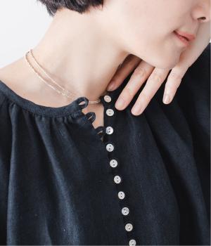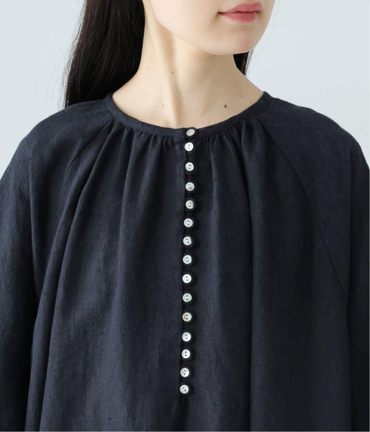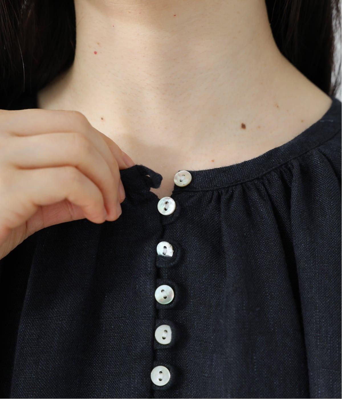 アクセサリーなしでも映える、縦に連なる貝ボタンのやわらかな光沢。控えめに寄せた首元のギャザーが、ほのかな立体感を生み出します。