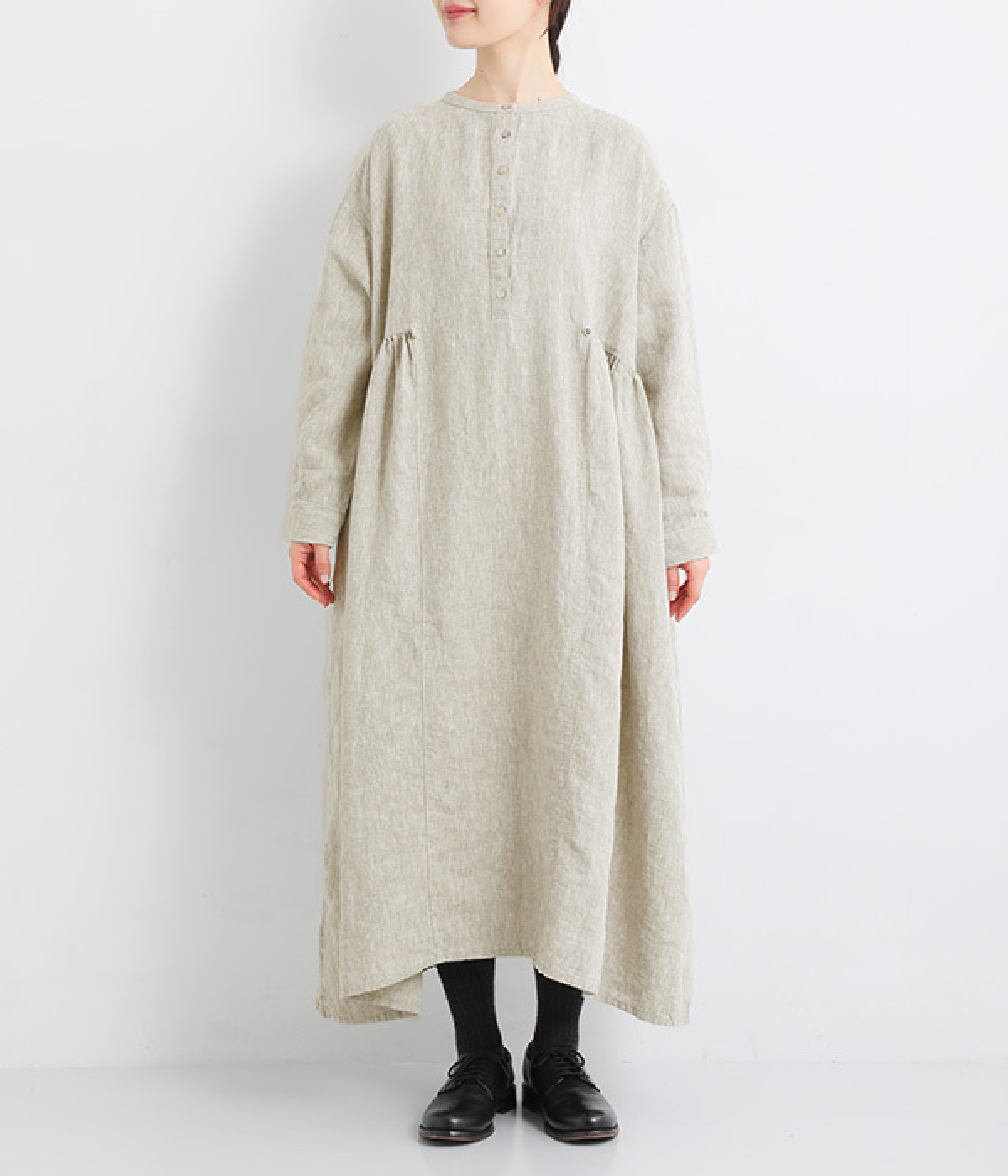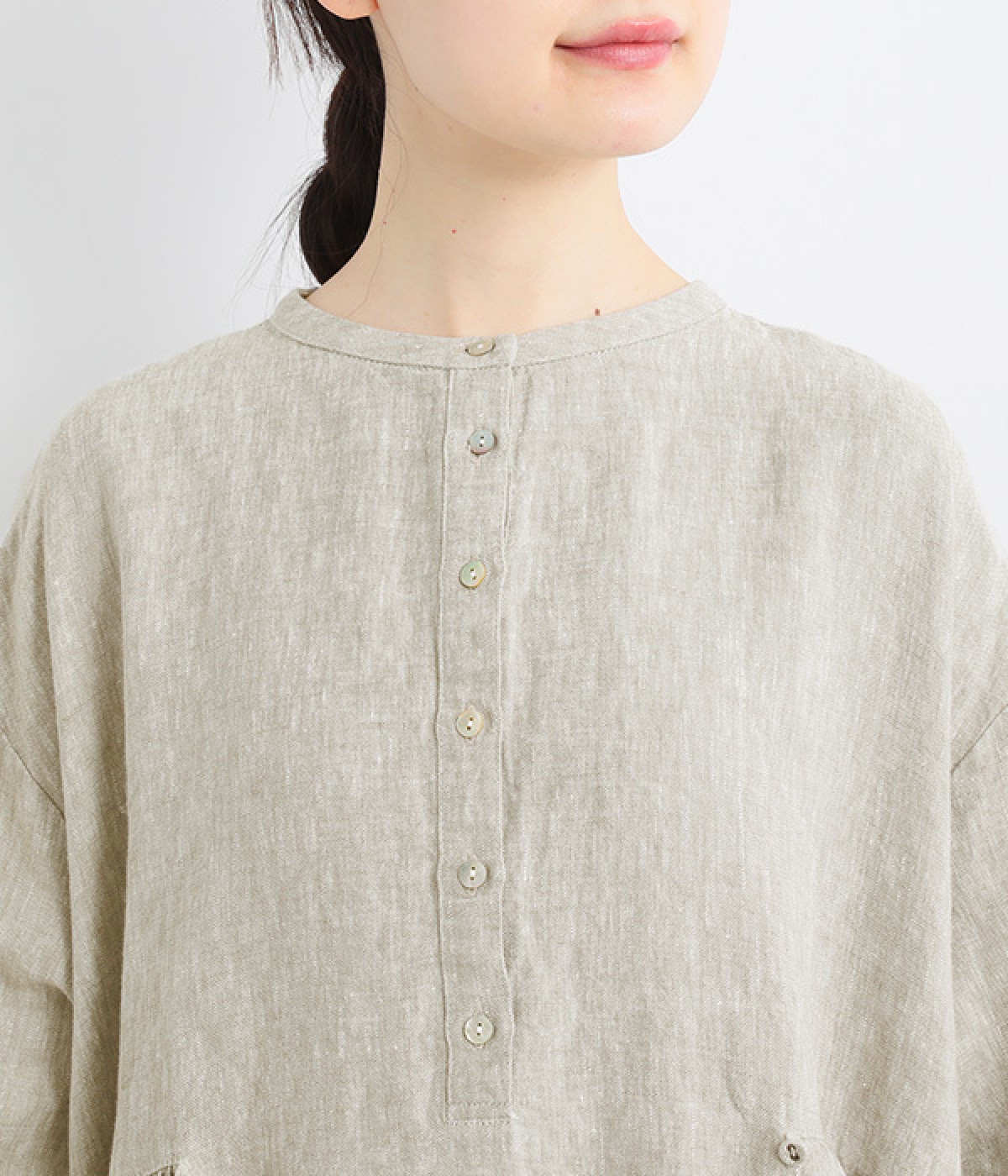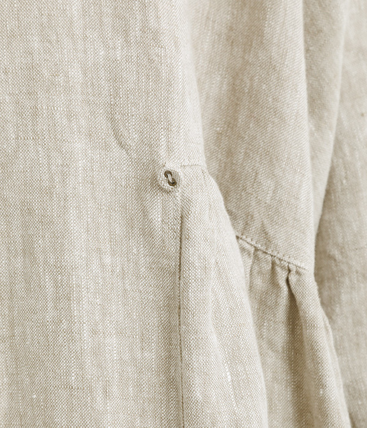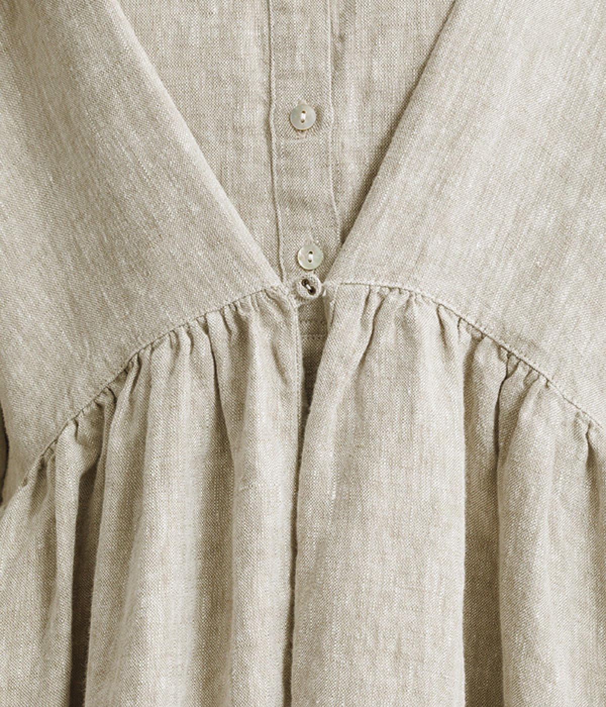 ウエスト脇のギャザーで分量をとった、ふんわり大きめのシルエットは着映え力抜群。腰のボタンを留めると、Vネック風のラインが浮き出て雰囲気が様変わりします。フロントはボタンが途中までついたヘンリー開きで、インナーをのぞかせる着こなしをしても◎。