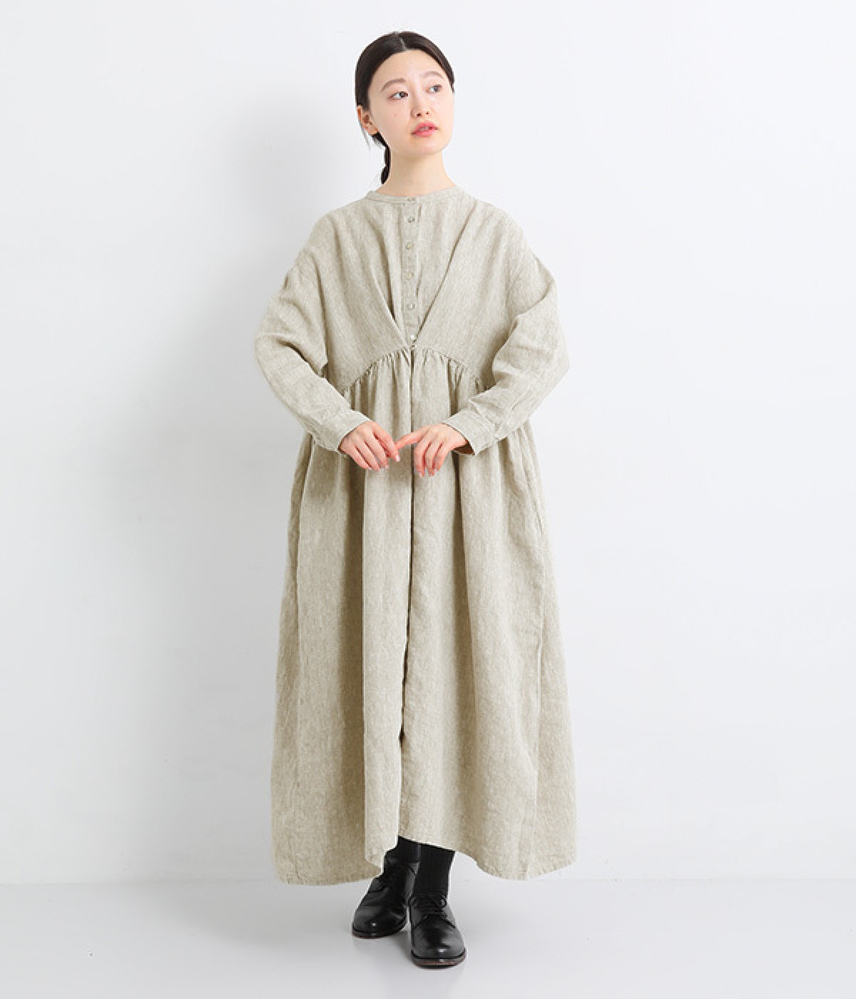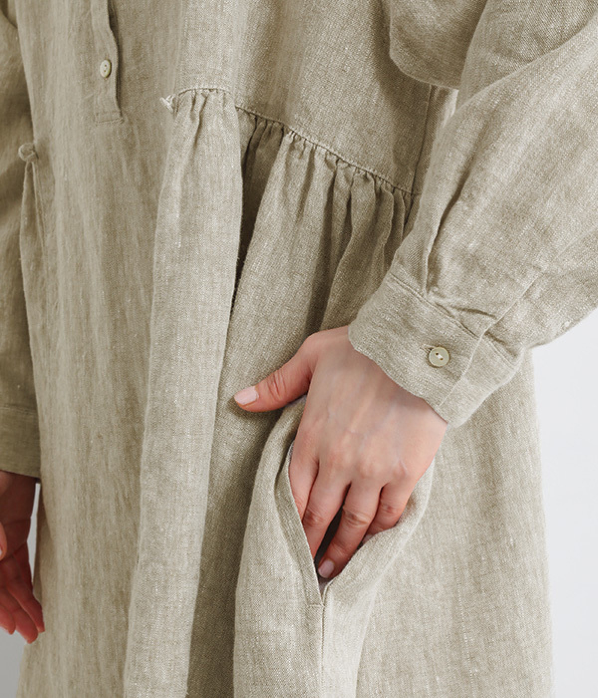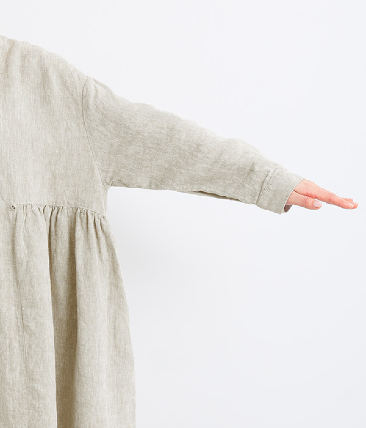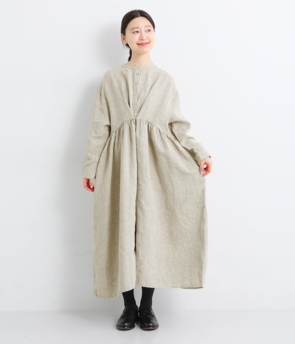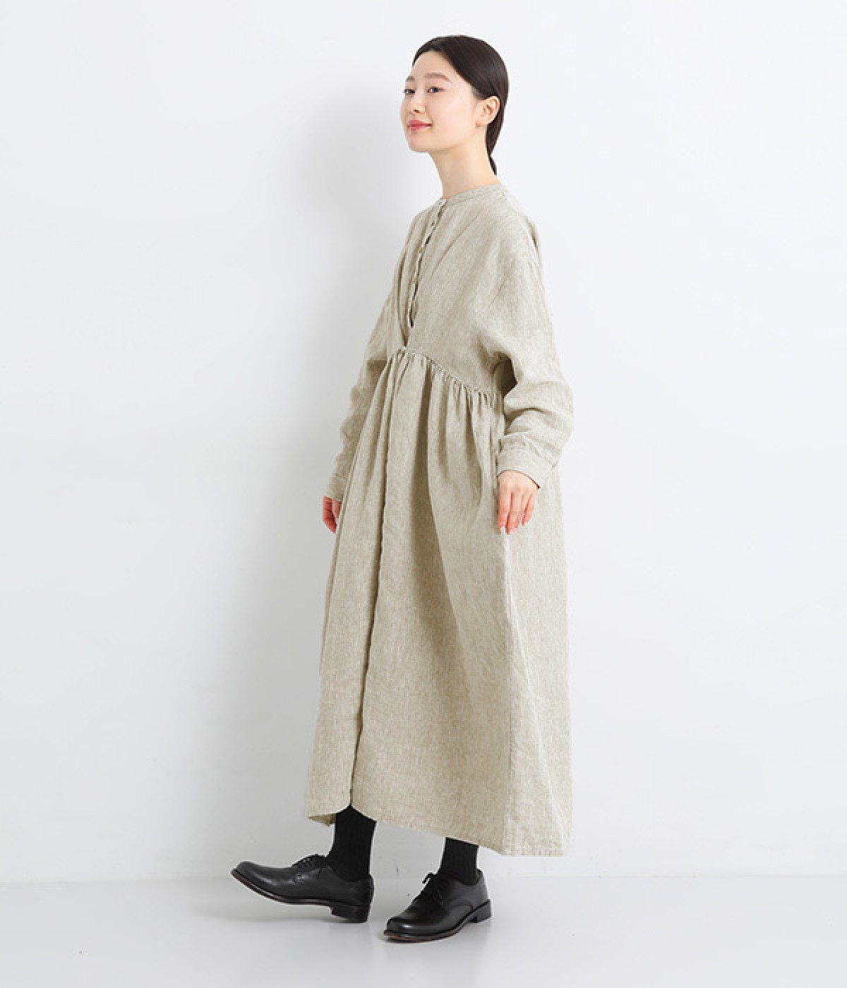 ウエスト脇のギャザーで分量をとった、ふんわり大きめのシルエットは着映え力抜群。腰のボタンを留めると、Vネック風のラインが浮き出て雰囲気が様変わりします。フロントはボタンが途中までついたヘンリー開きで、インナーをのぞかせる着こなしをしても◎。