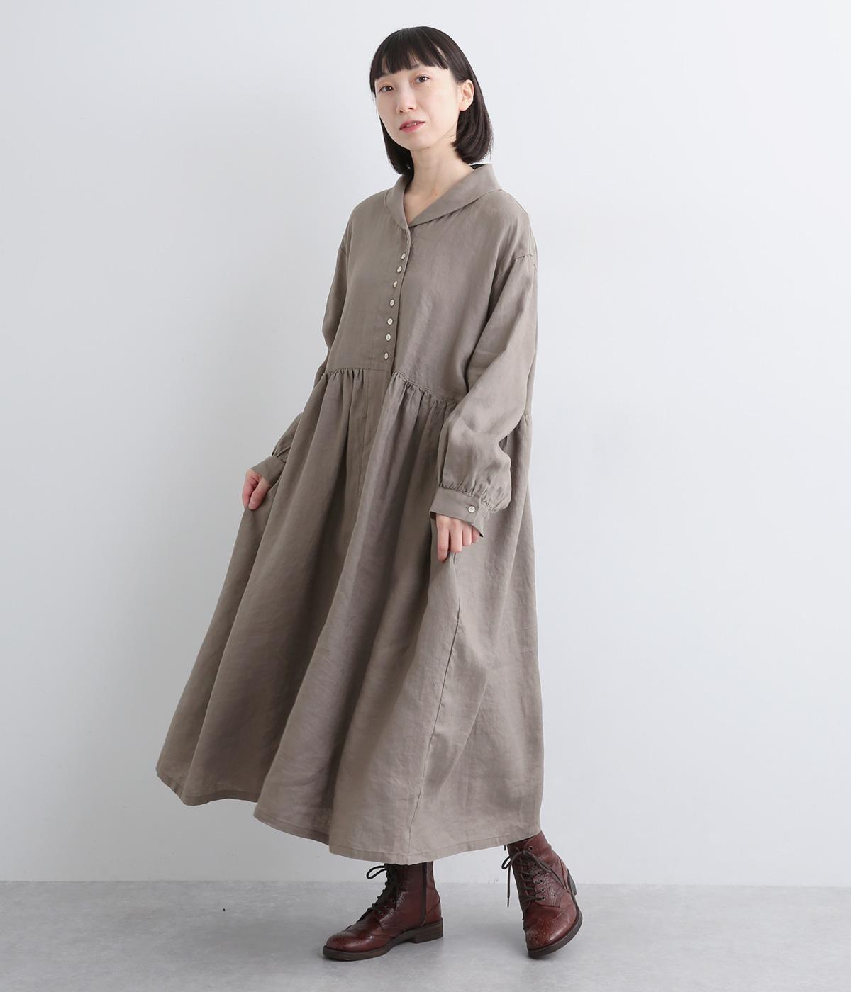 ラウンド襟が大人かわいい印象を与えるワンピースです。上半分は光沢のあるシェル素材の多ボタンをあしらい、スカート部分は比翼仕立てですっきりと仕立てました。切り替えのたっぷりギャザーがアクセントになり、スタイリングに動きを添えます。
