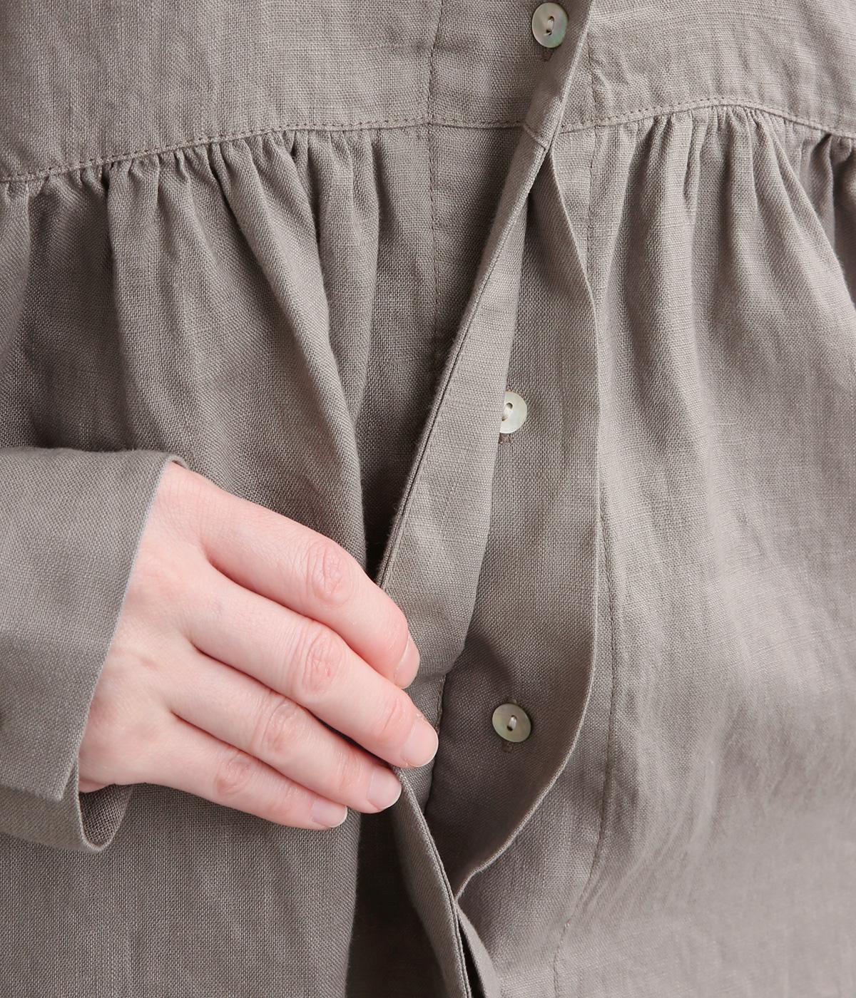 ほどよいシャリ感と、軽やかな着心地が特徴的なやや薄手のリネン素材です。着て洗うを繰り返すことで、やわらかさや風合いが増していくのも魅力に。