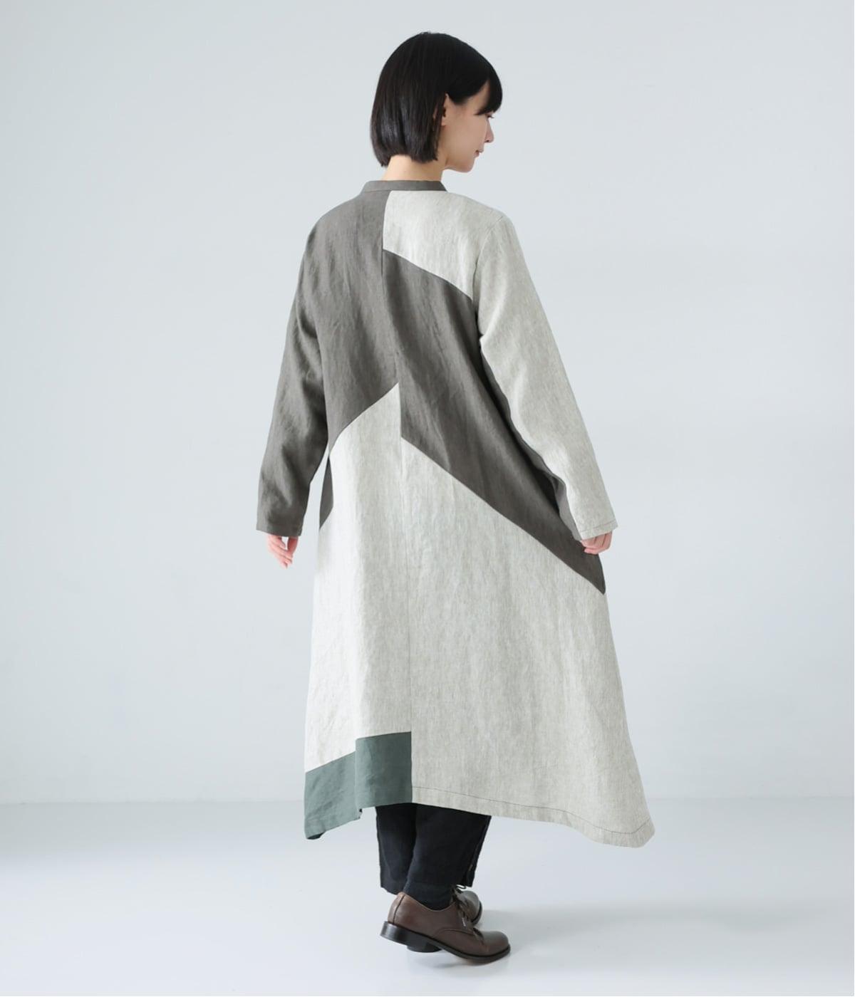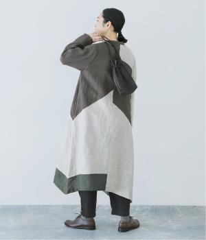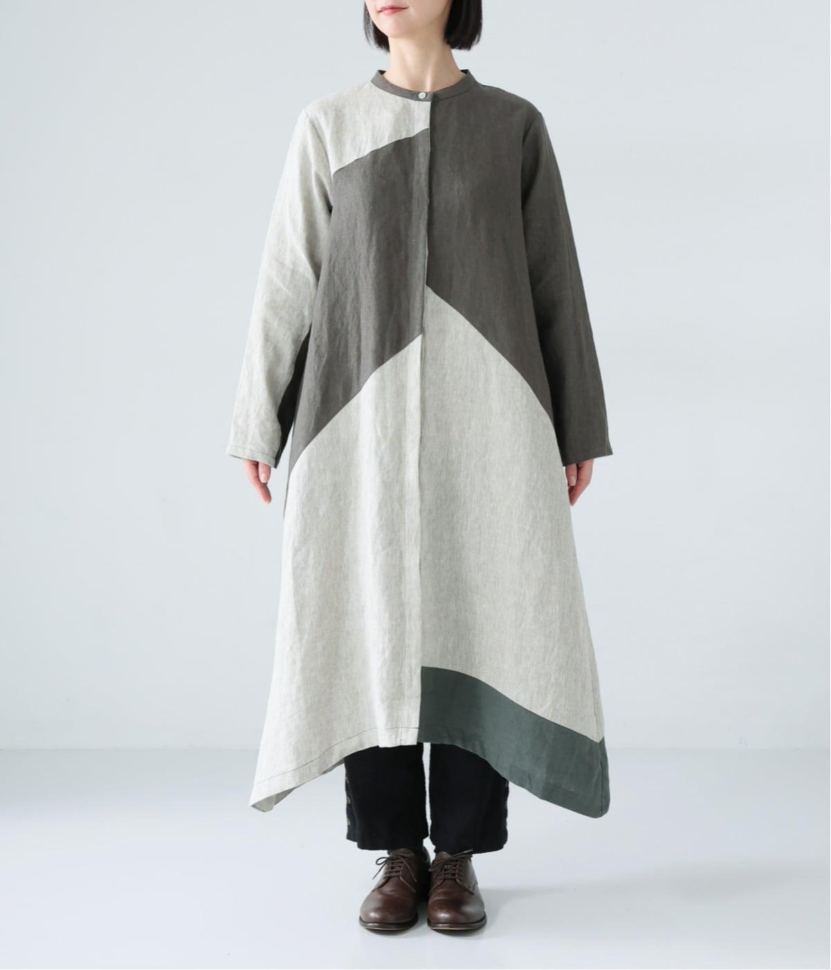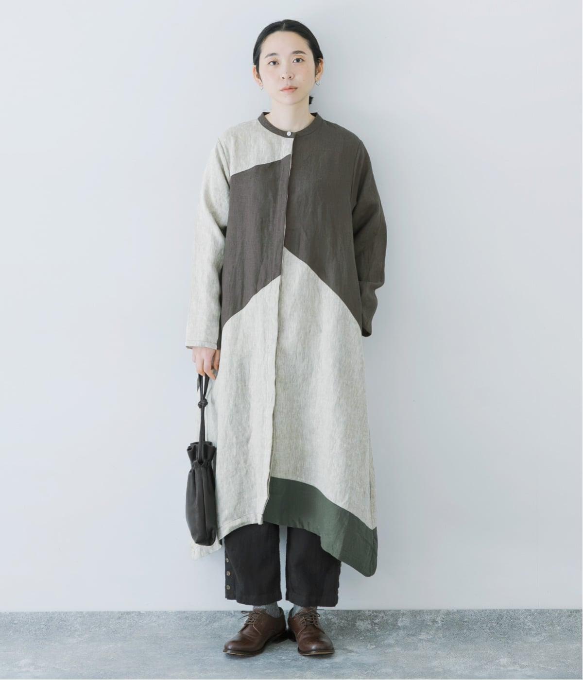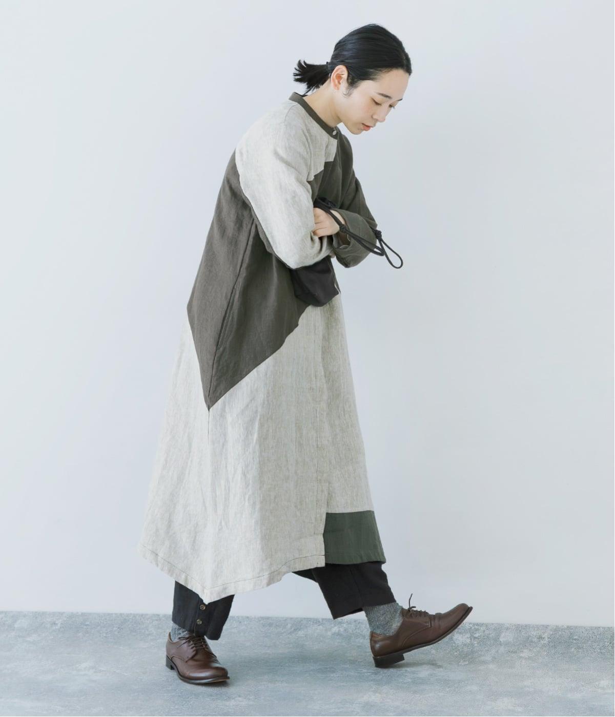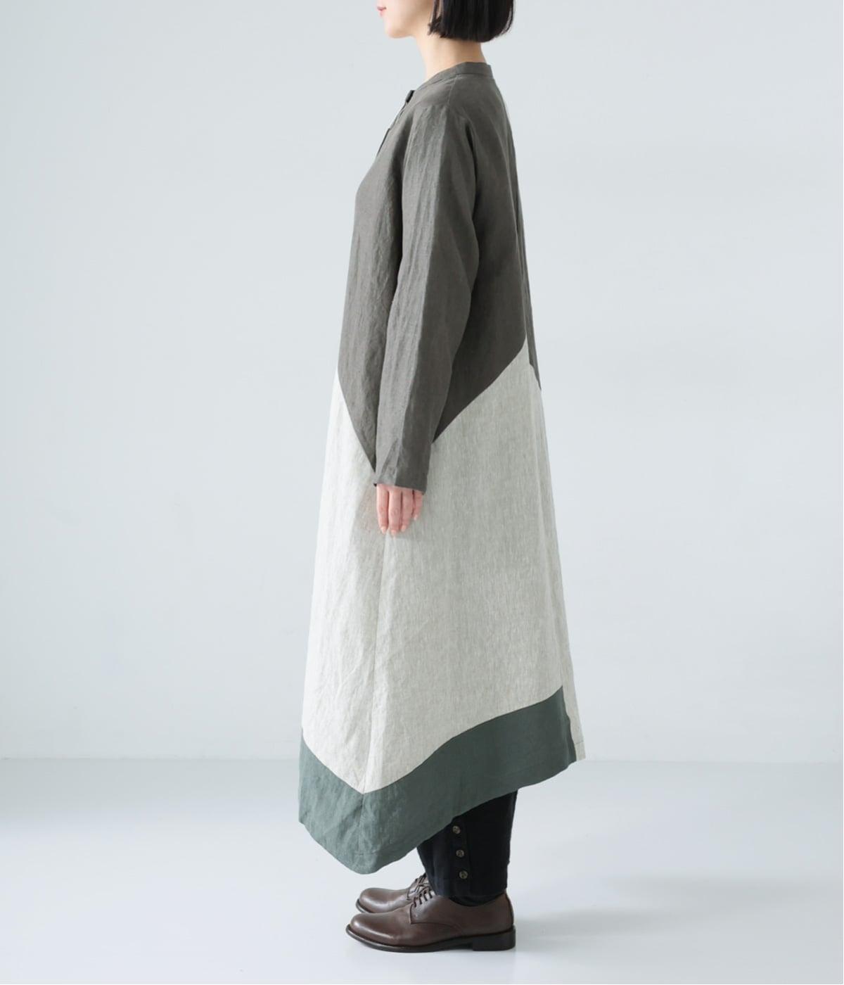 淡いグレージュに、あたたか味のあるチャコール、そして裾にはモスグリーンをあしらった、コントラストを楽しめる色合い。はっきりとした色の切り替えデザインなので、合わせるアイテムは無彩色で揃え、ワンピースを引き立てる着こなしに。