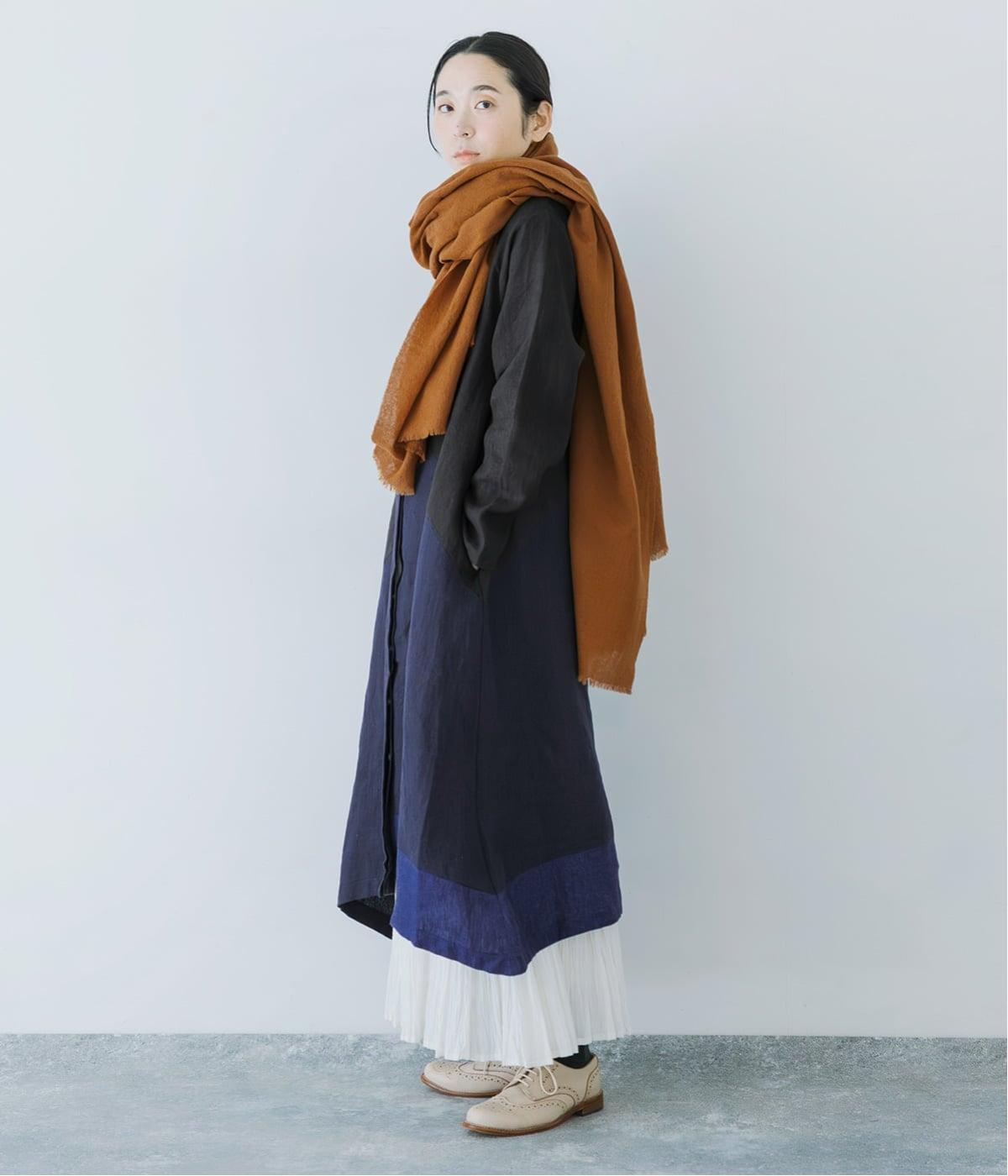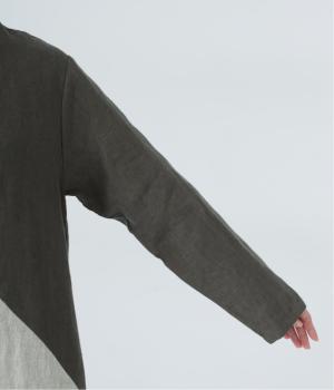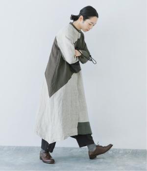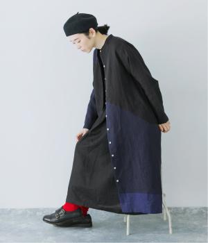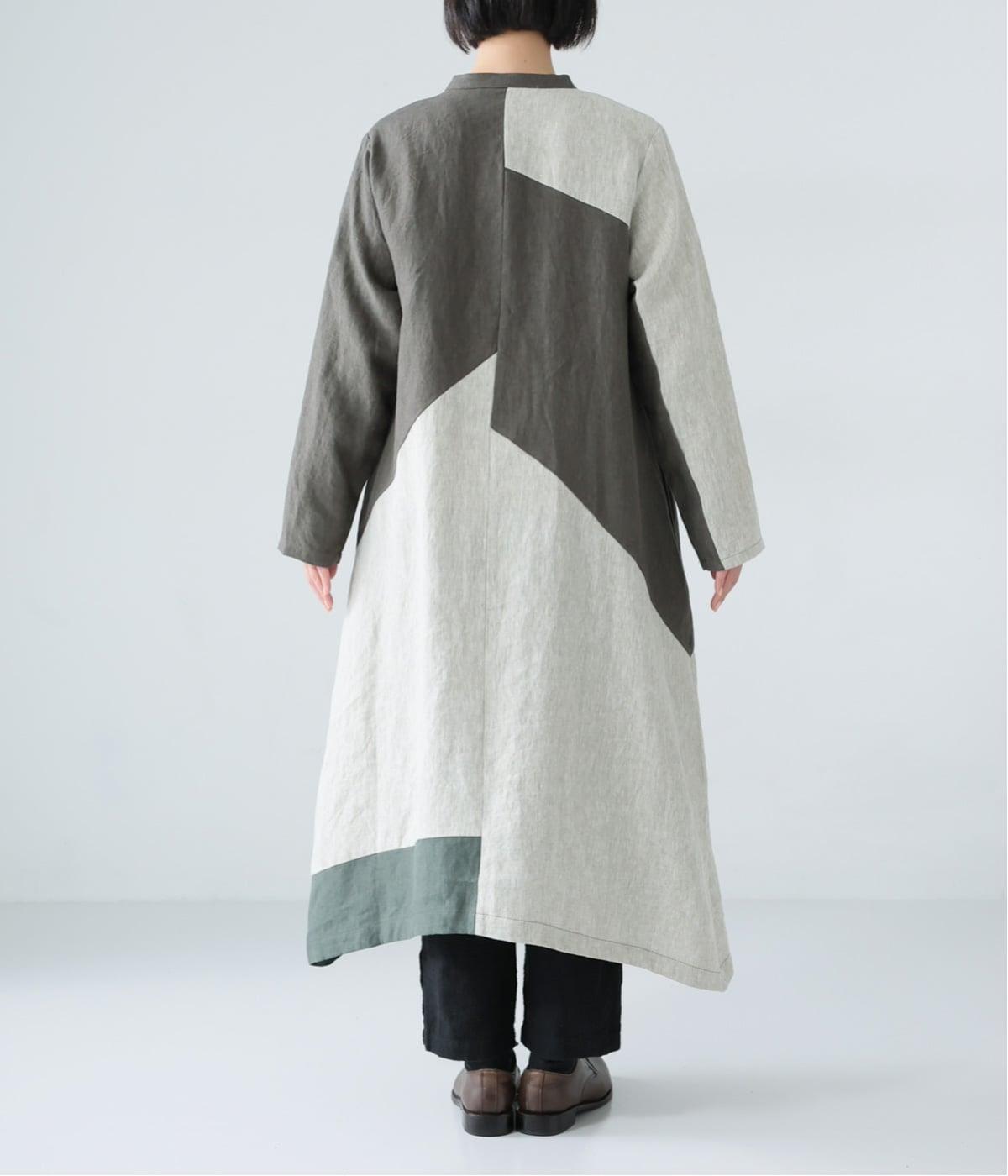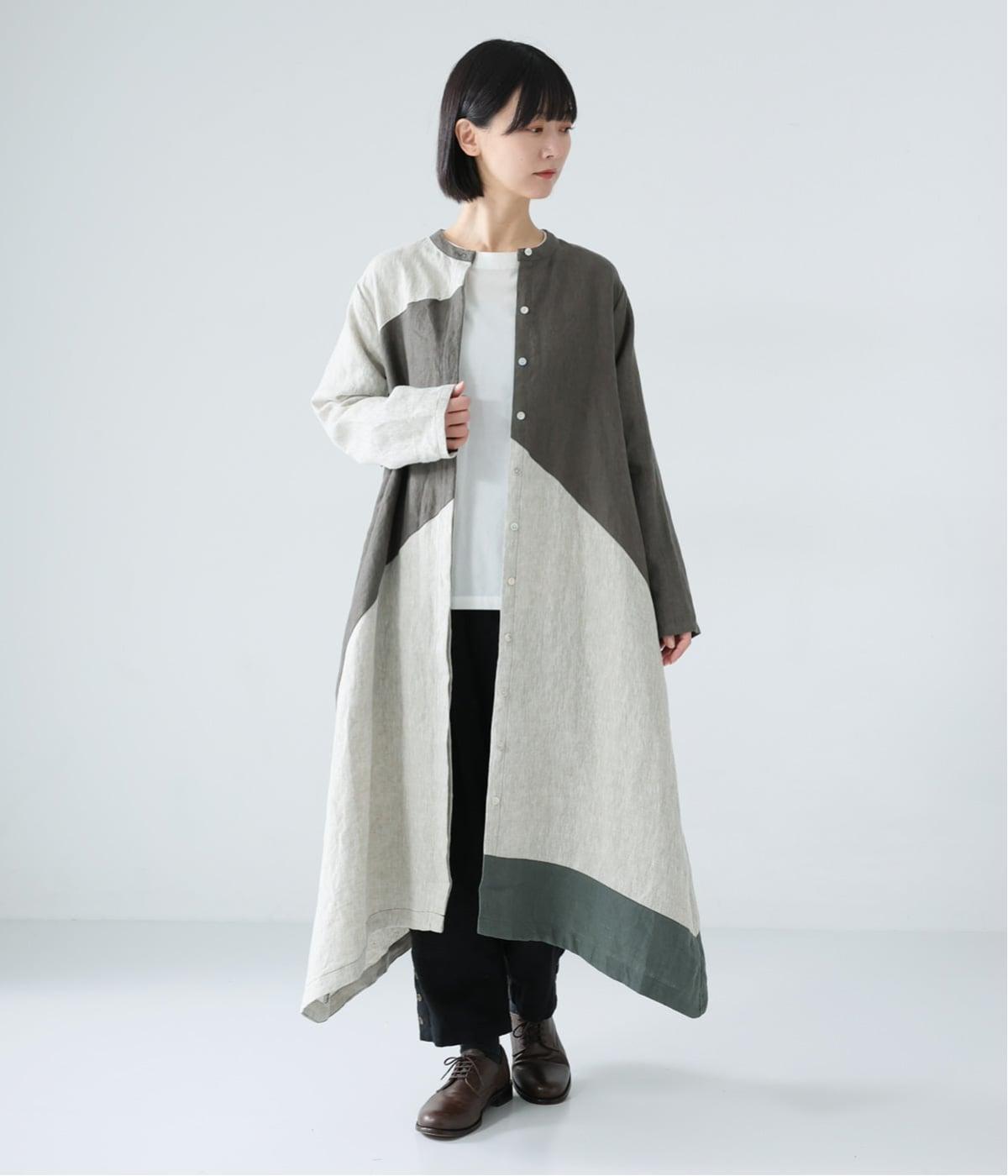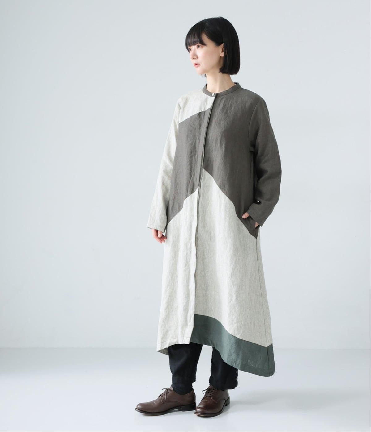 淡いグレージュに、あたたか味のあるチャコール、そして裾にはモスグリーンをあしらった、コントラストを楽しめる色合い。はっきりとした色の切り替えデザインなので、合わせるアイテムは無彩色で揃え、ワンピースを引き立てる着こなしに。