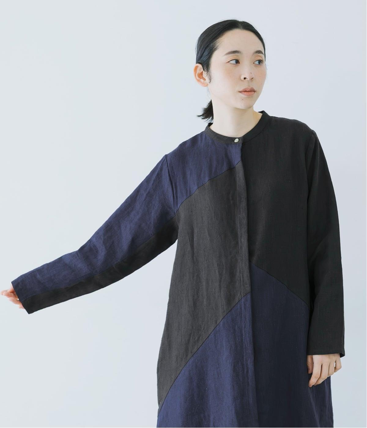 身頃はネイビーとブラックを組み合わせ、シャープな印象に。アシンメトリーなラインが、全体のシルエットを引き締めます。