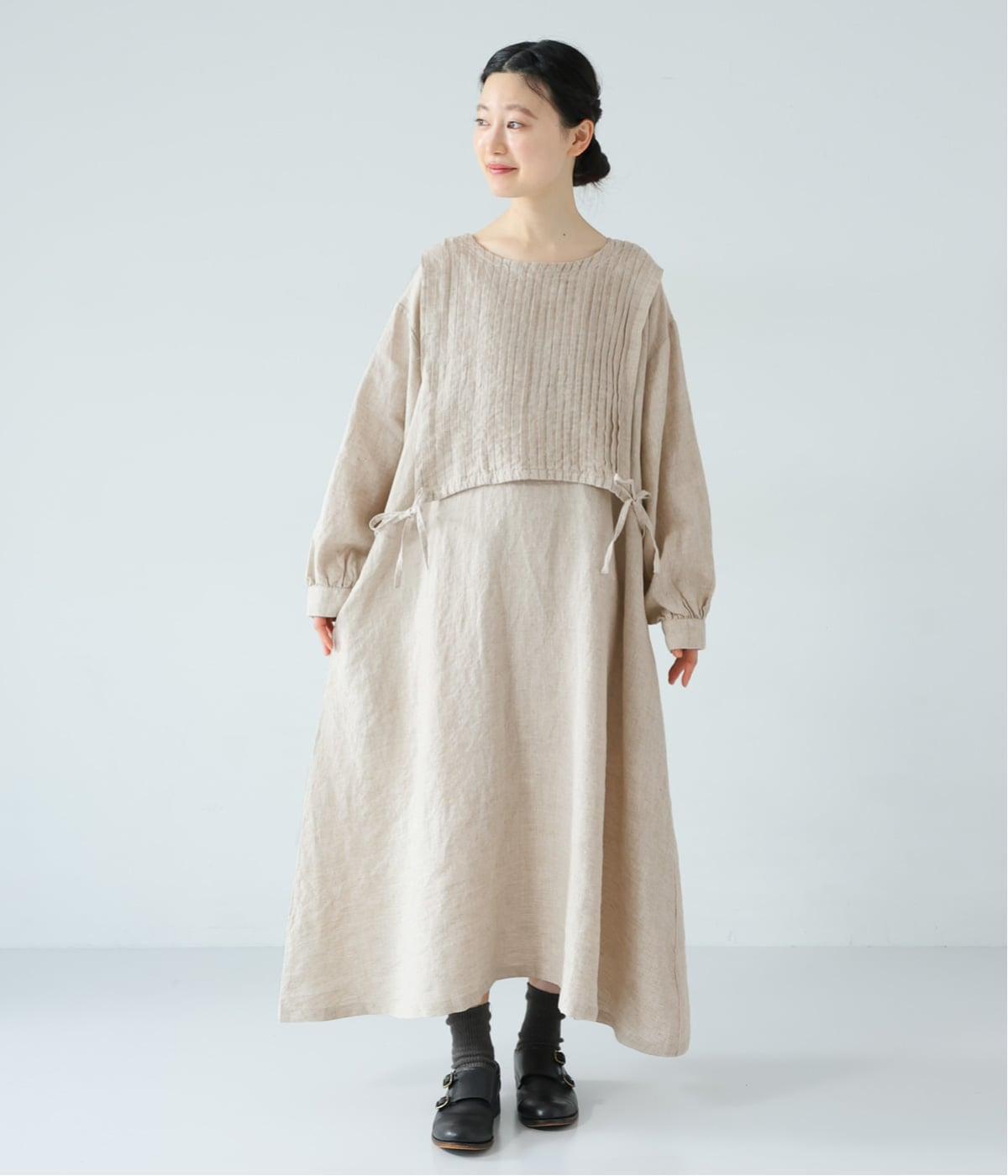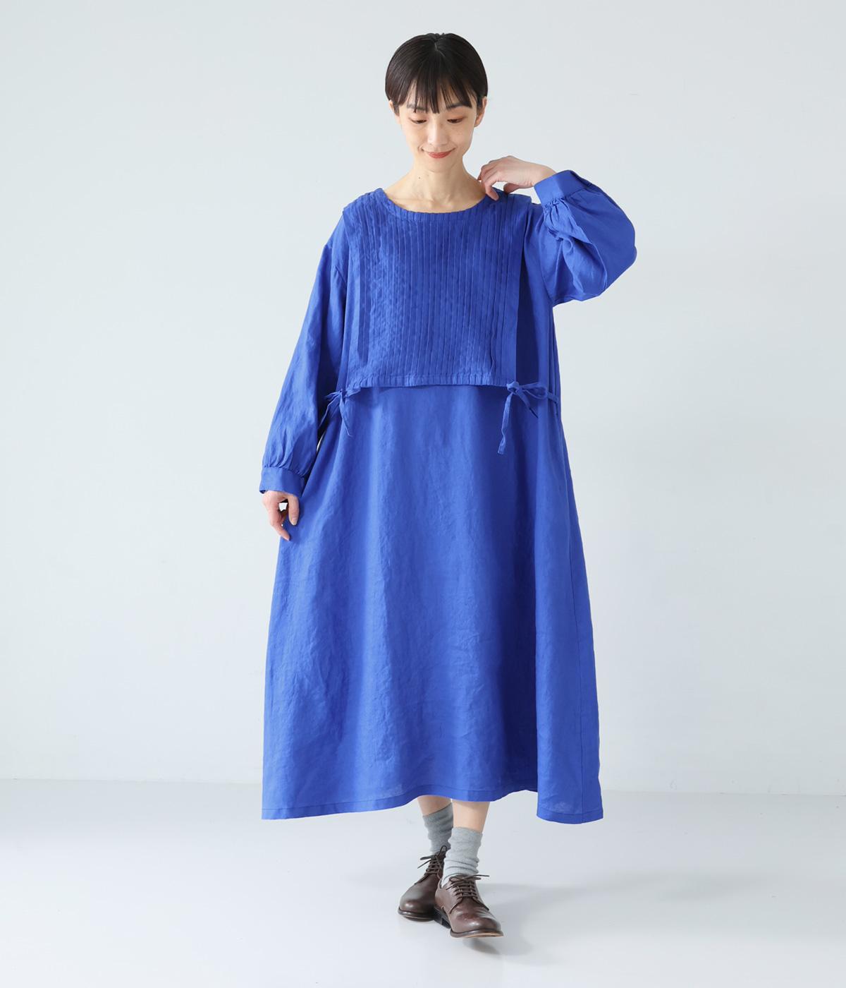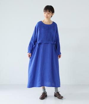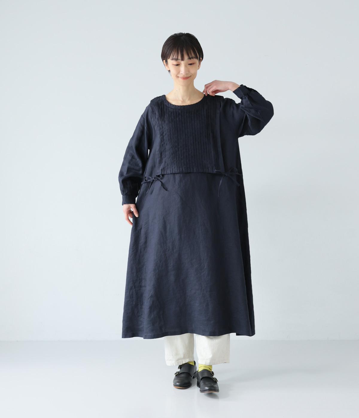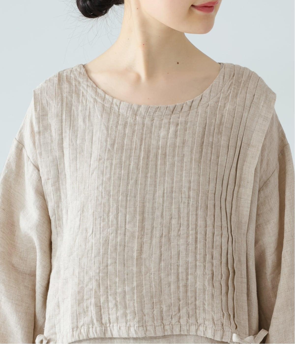 前身頃にピンタックをあしらった生地を重ね、ベストをレイヤードしたような着こなしを一枚でたのしめます。視線が上がるので、全体にゆとりがありながらもバランスのよい印象に。袖口にはたっぷりとギャザーをよせて愛らしさをプラスしました。