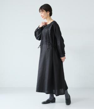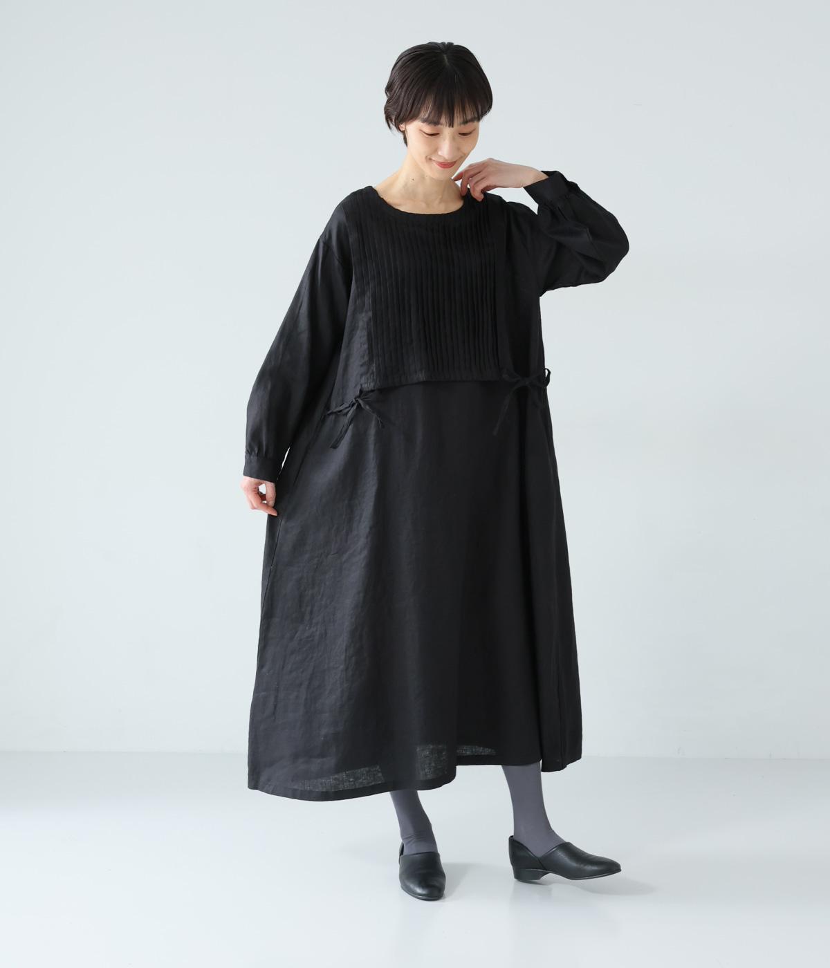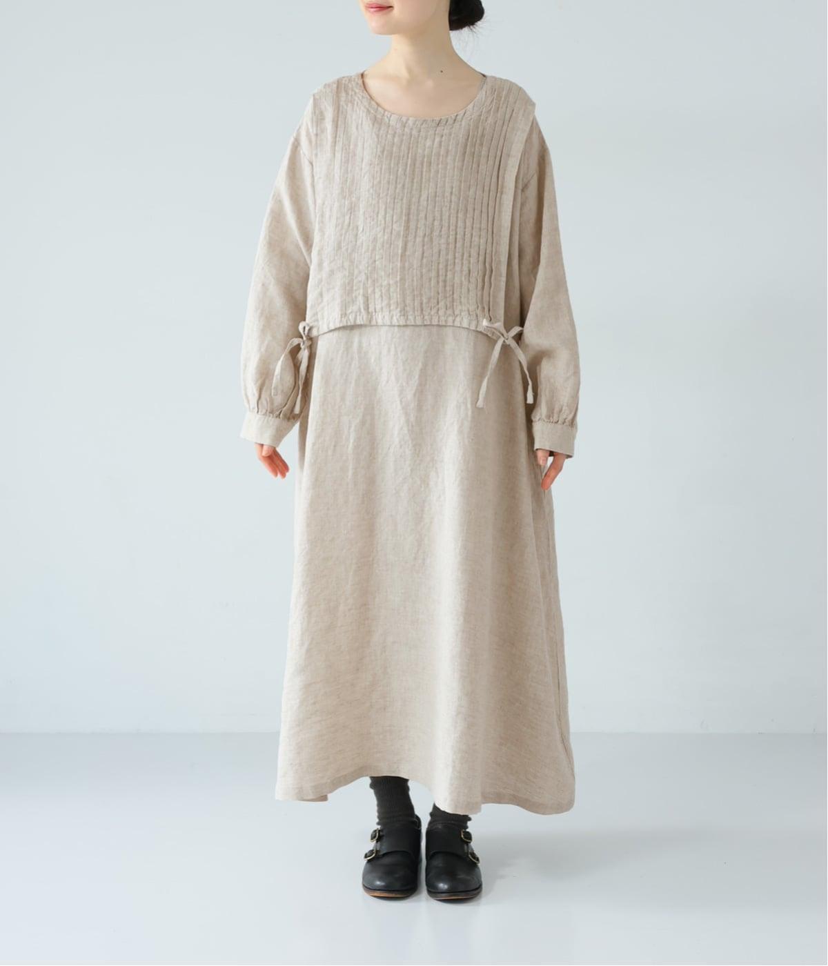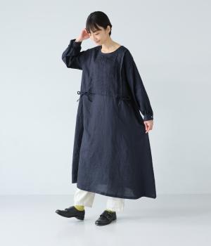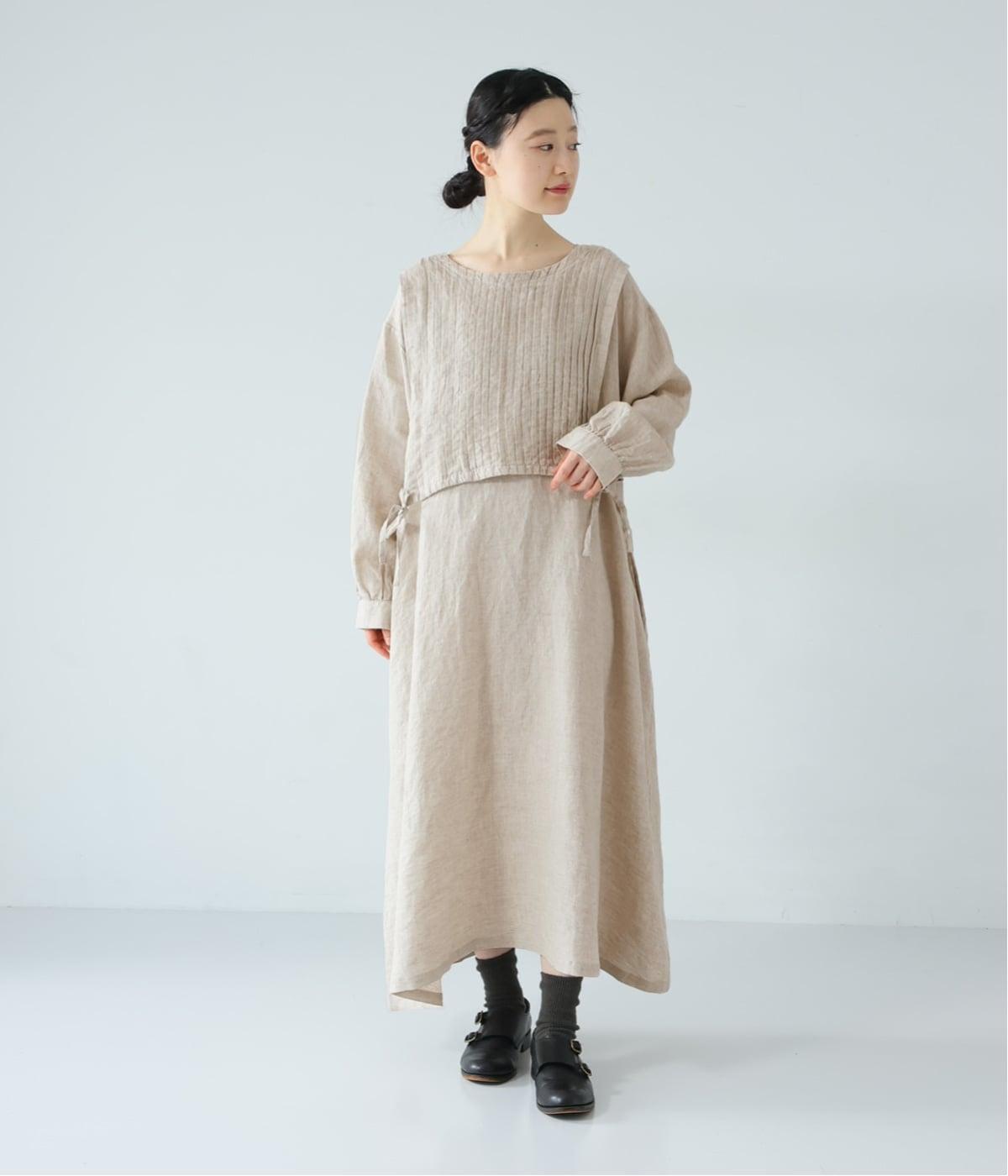 前身頃にピンタックをあしらった生地を重ね、ベストをレイヤードしたような着こなしを一枚でたのしめます。視線が上がるので、全体にゆとりがありながらもバランスのよい印象に。袖口にはたっぷりとギャザーをよせて愛らしさをプラスしました。