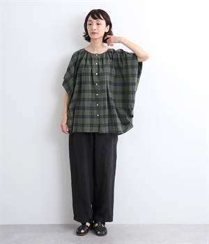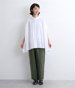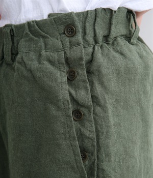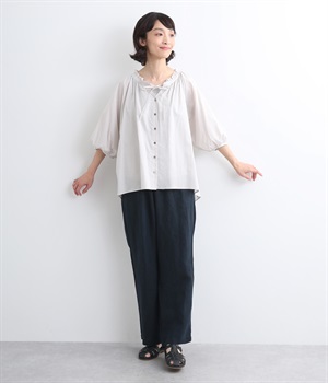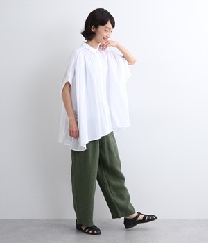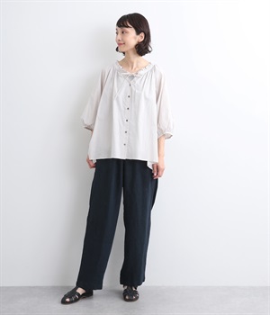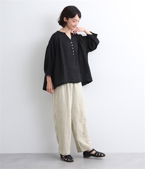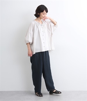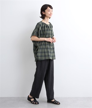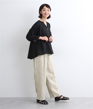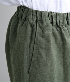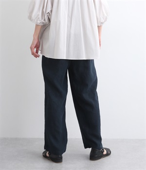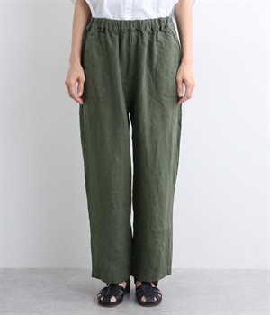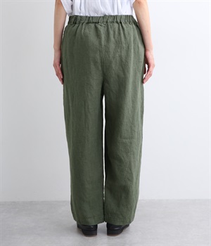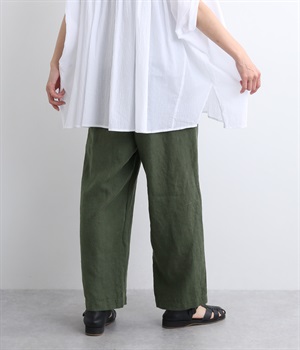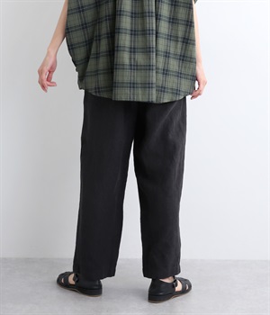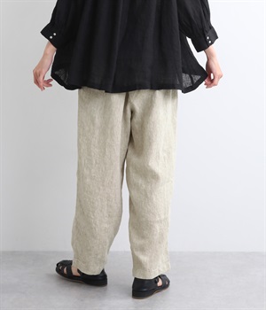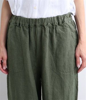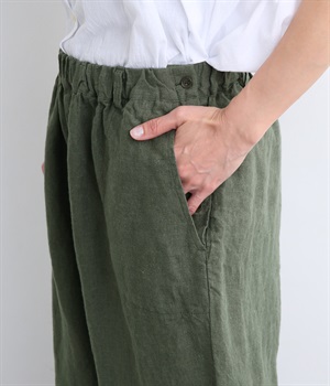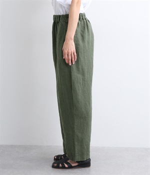 シャリ感があり、しっかりとした質感をもつリネン素材を使用しています。肌離れがよく、暑い時期でもさらっと穿けるのが特徴です。
