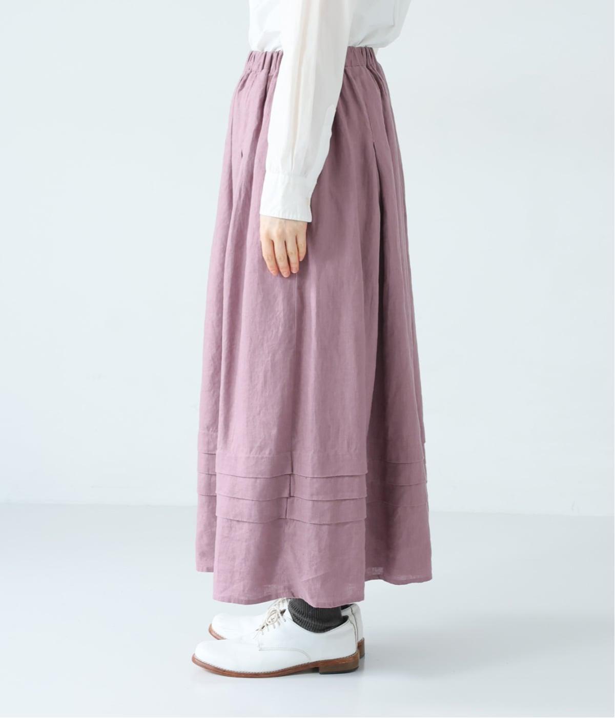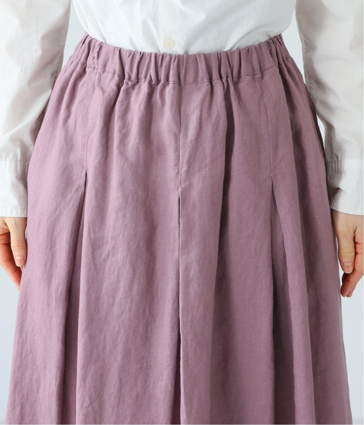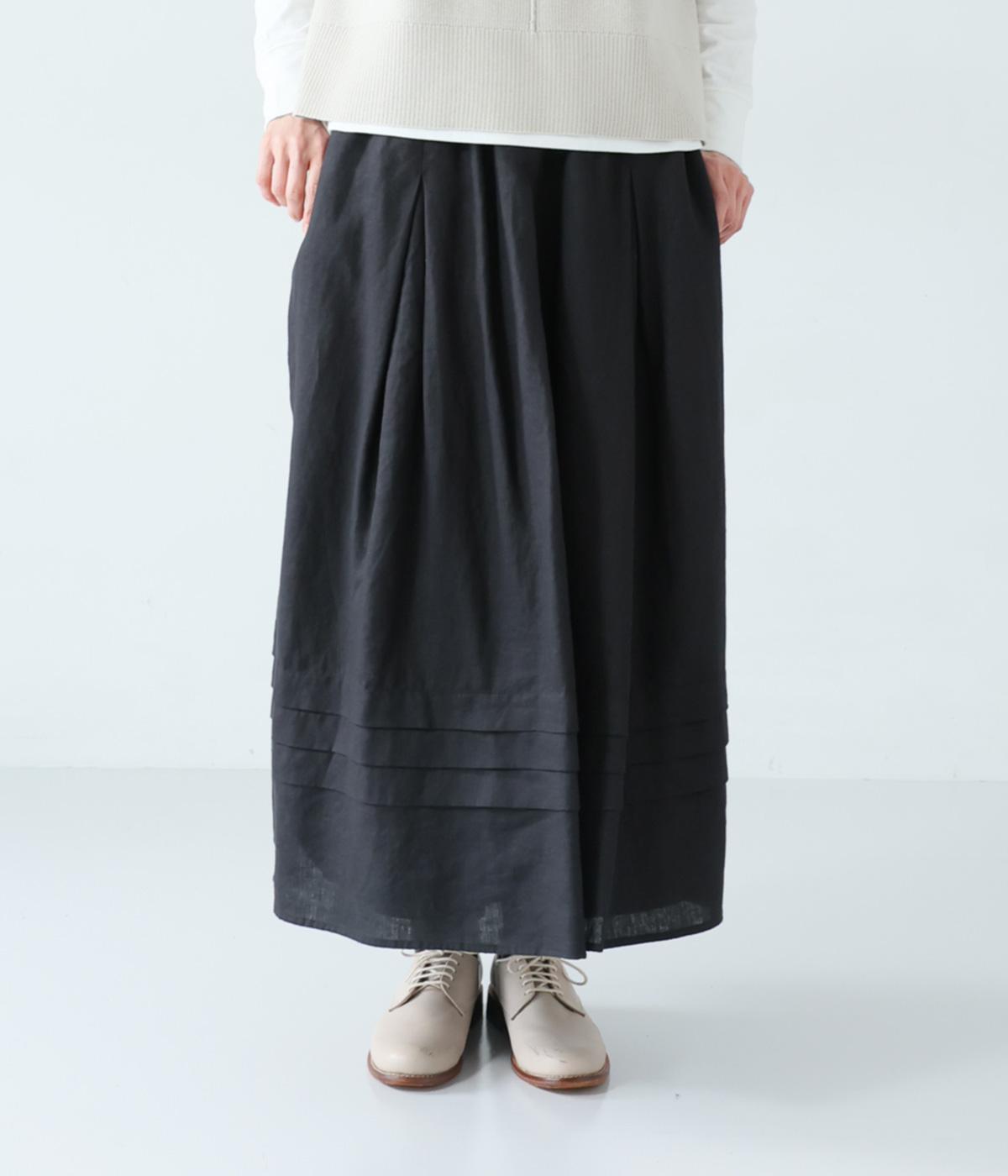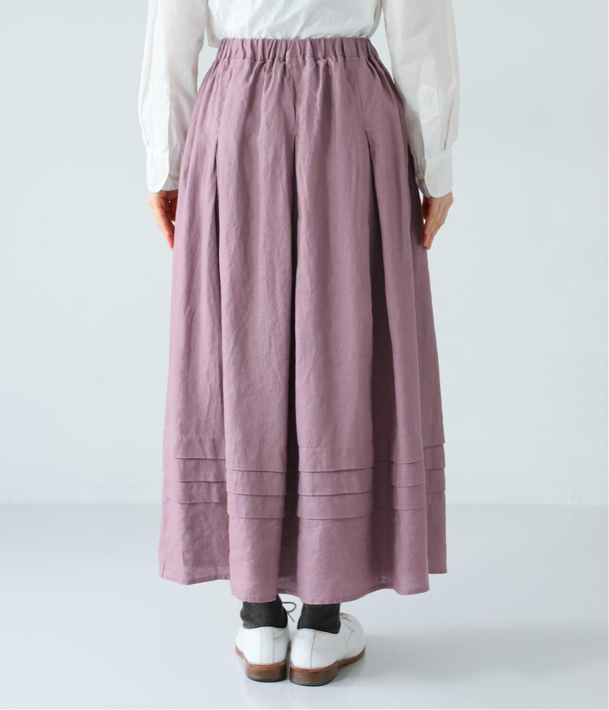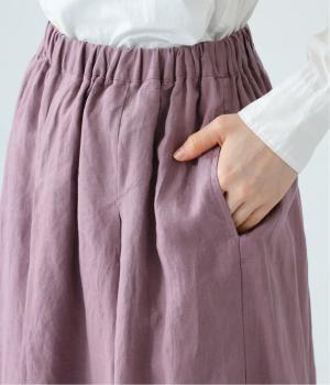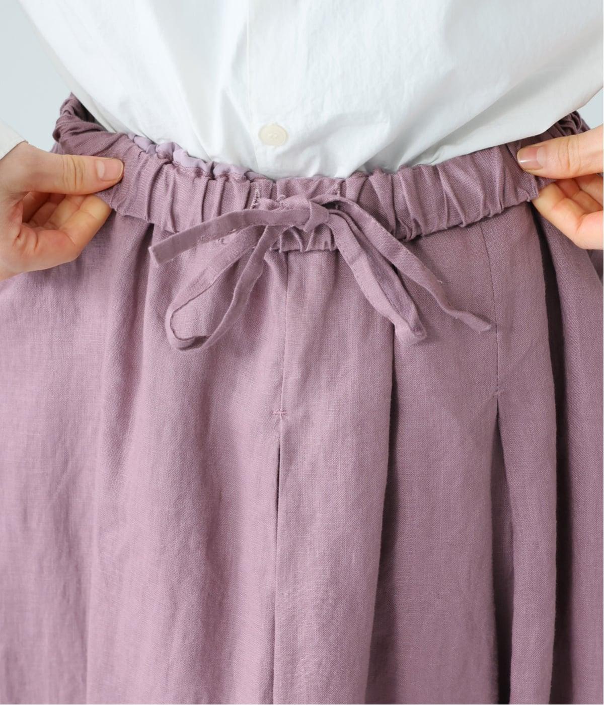腰位置から広がるタックをほどこした、大きなドレープを描くリネンスカート。横に広がりすぎないので、甘さをおさえたすっきりとした着こなしが叶います。裾の太めのタックデザインがアクセントに。ウエストは総ゴム仕様で、内側には紐を通しています。