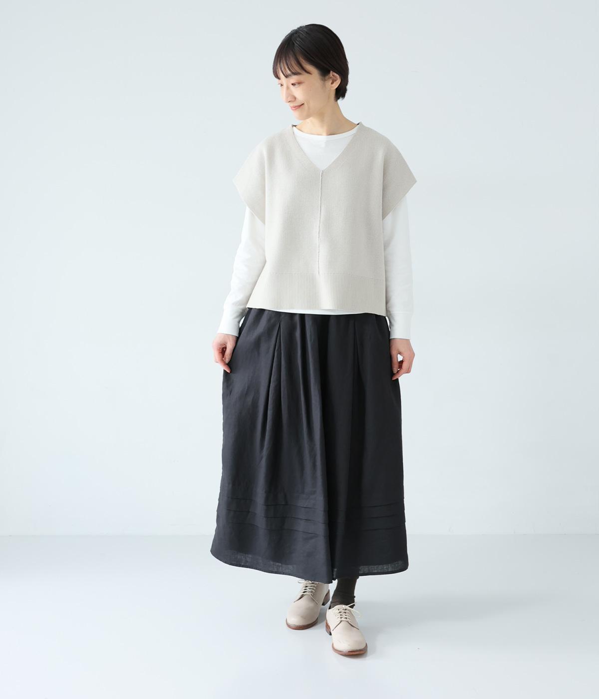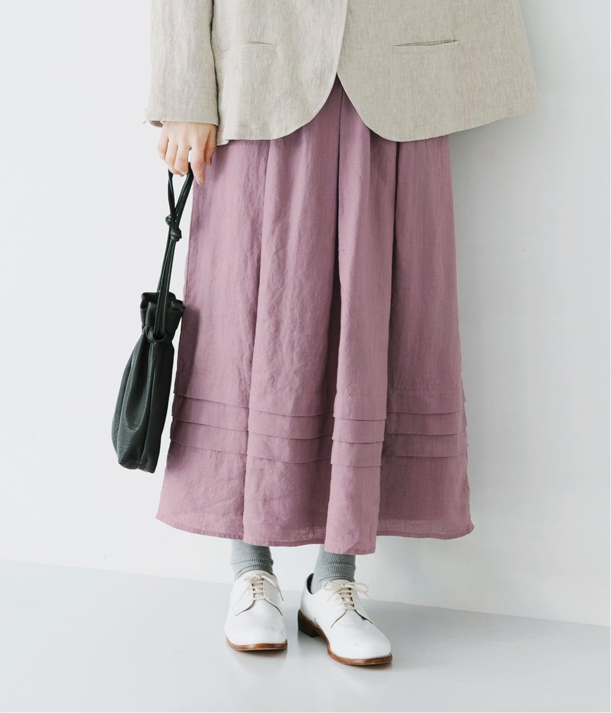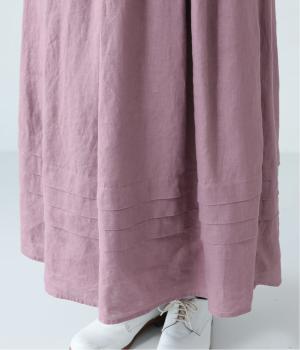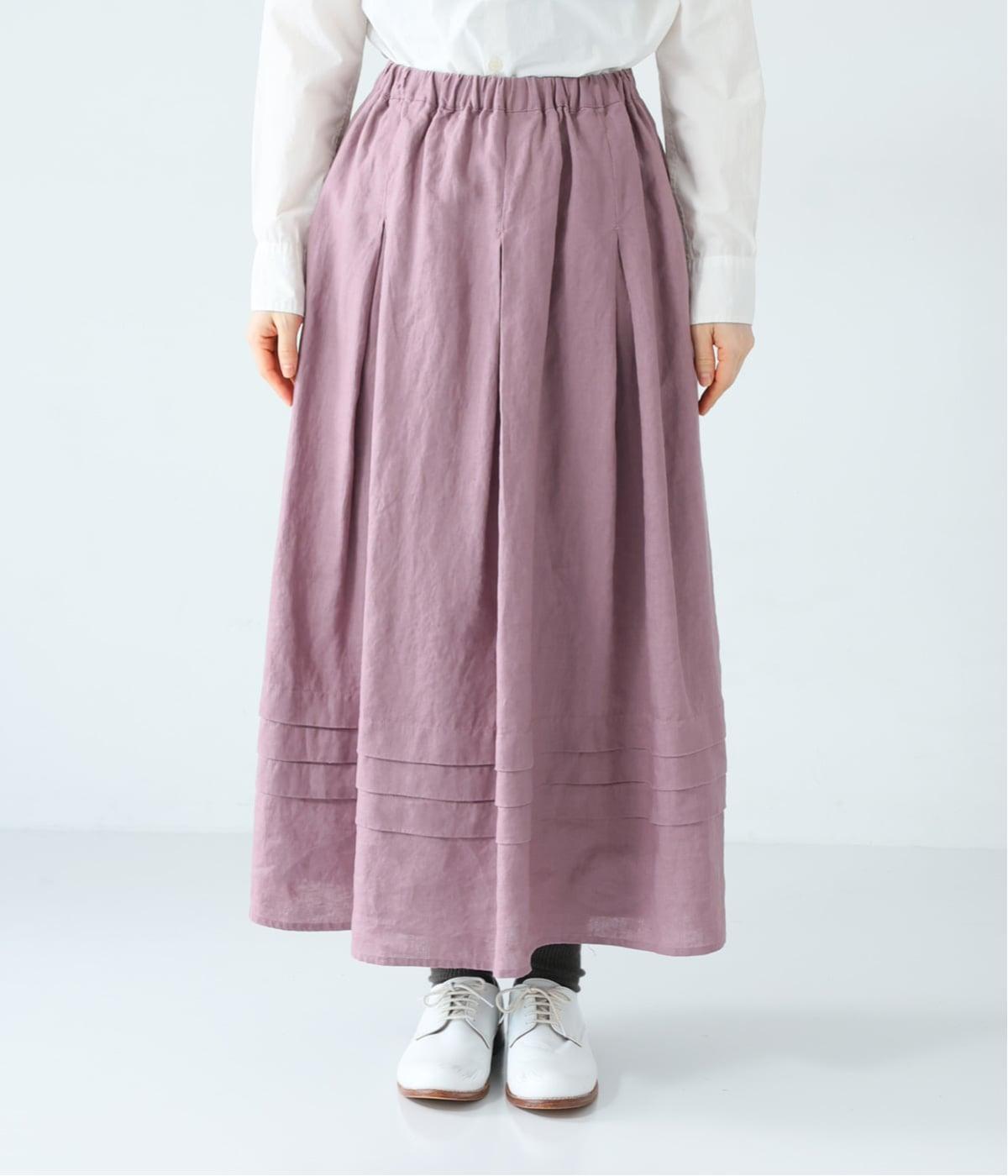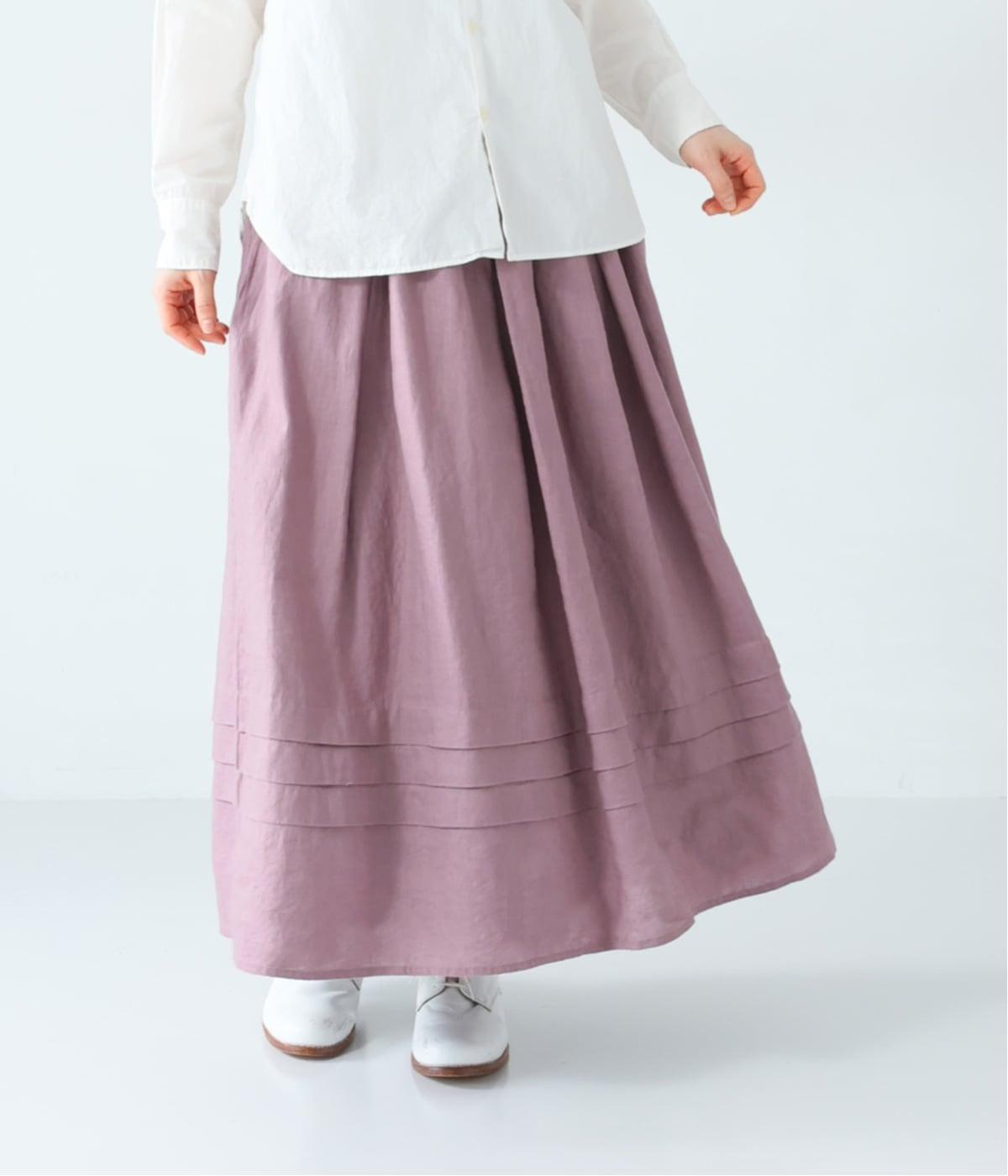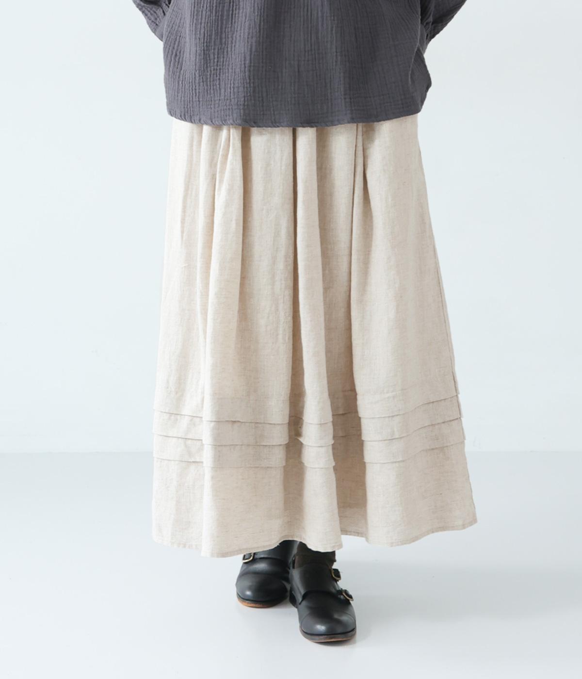 腰位置から広がるタックをほどこした、大きなドレープを描くリネンスカート。横に広がりすぎないので、甘さをおさえたすっきりとした着こなしが叶います。裾の太めのタックデザインがアクセントに。ウエストは総ゴム仕様で、内側には紐を通しています。