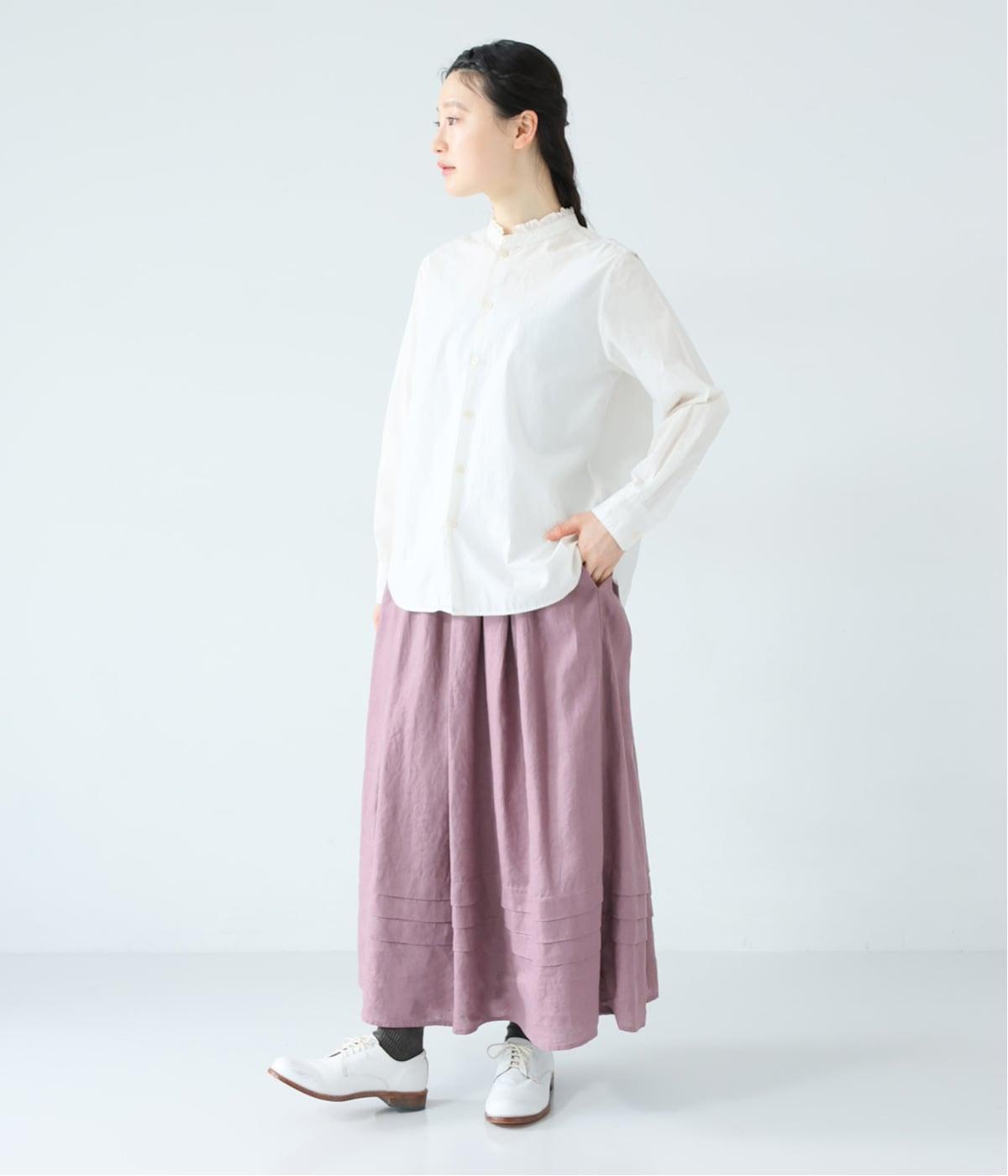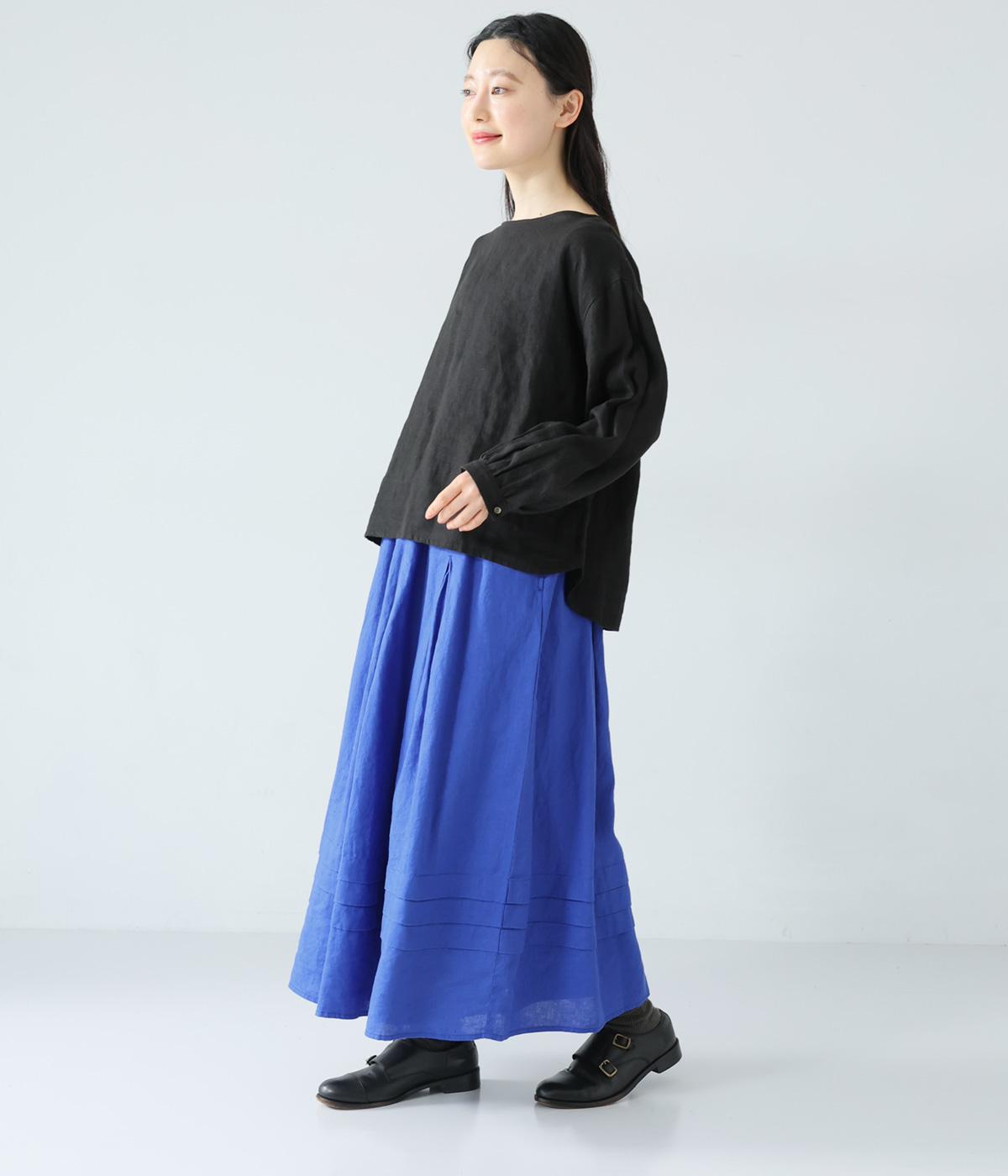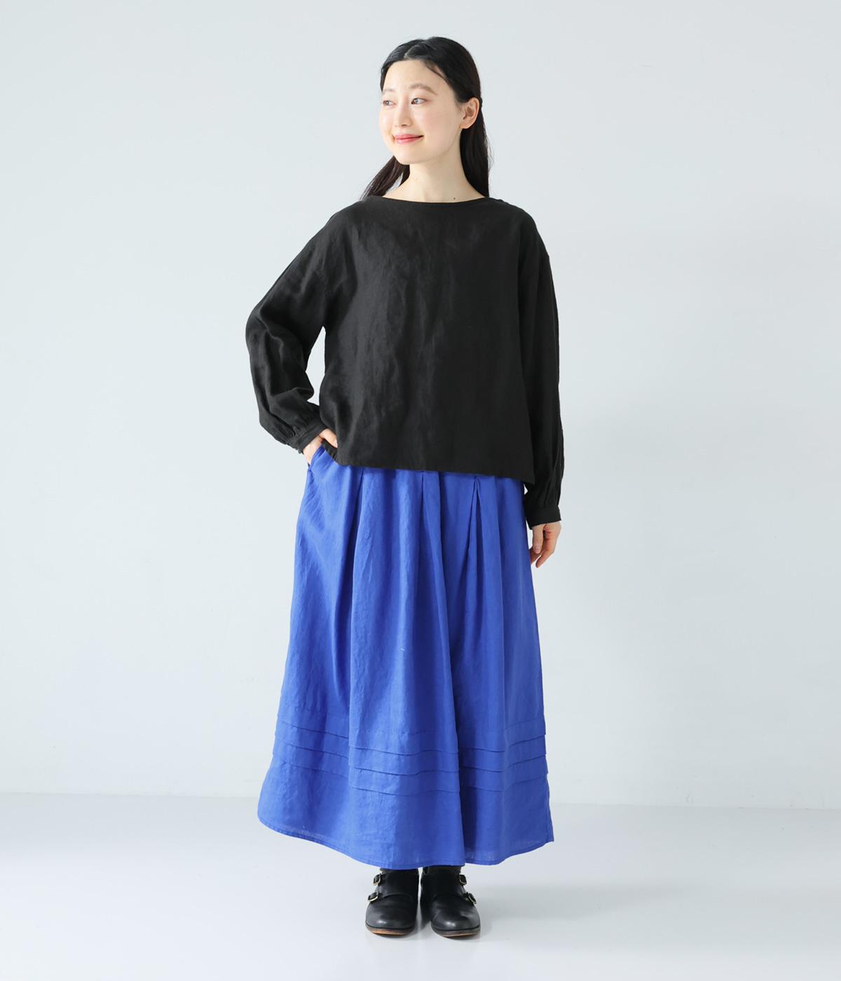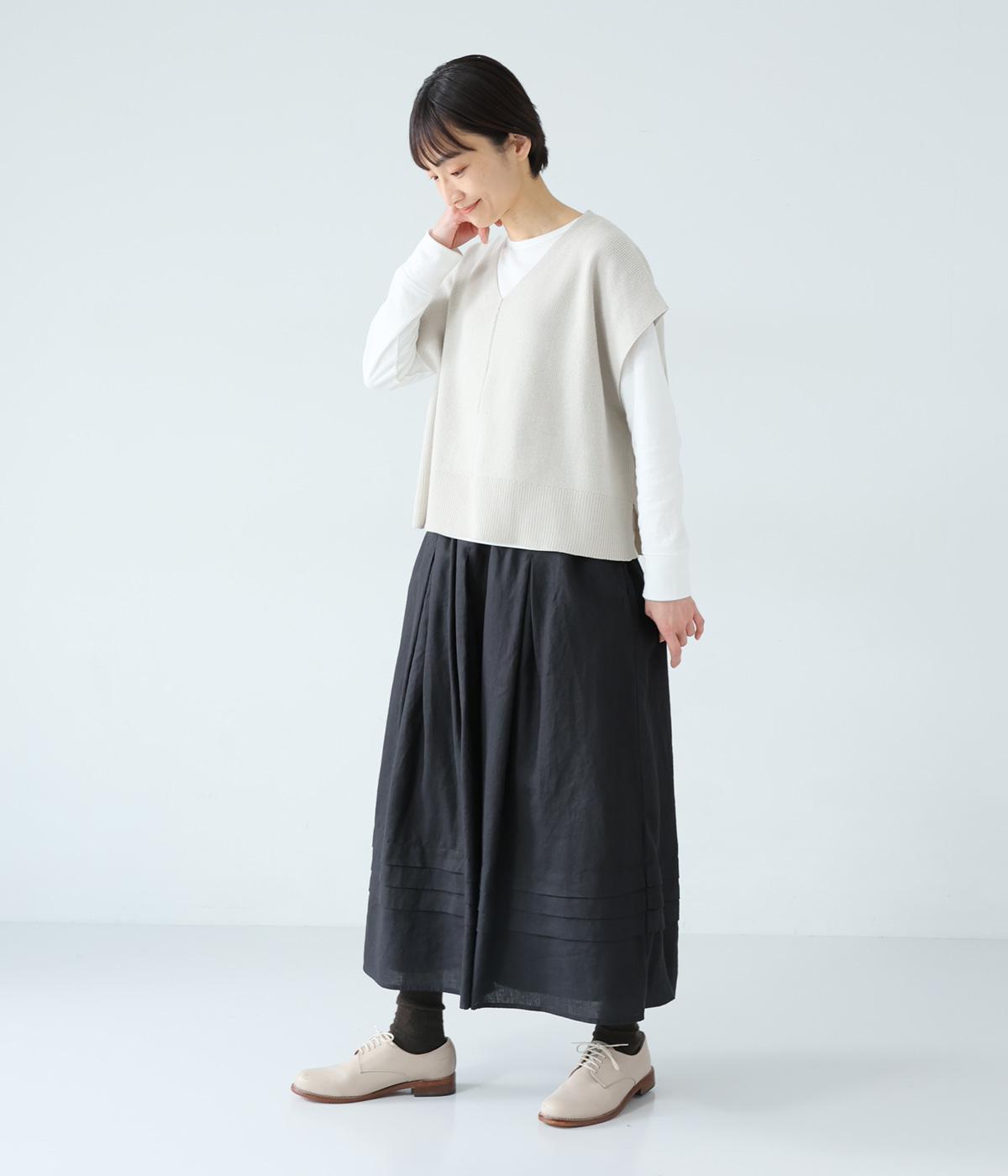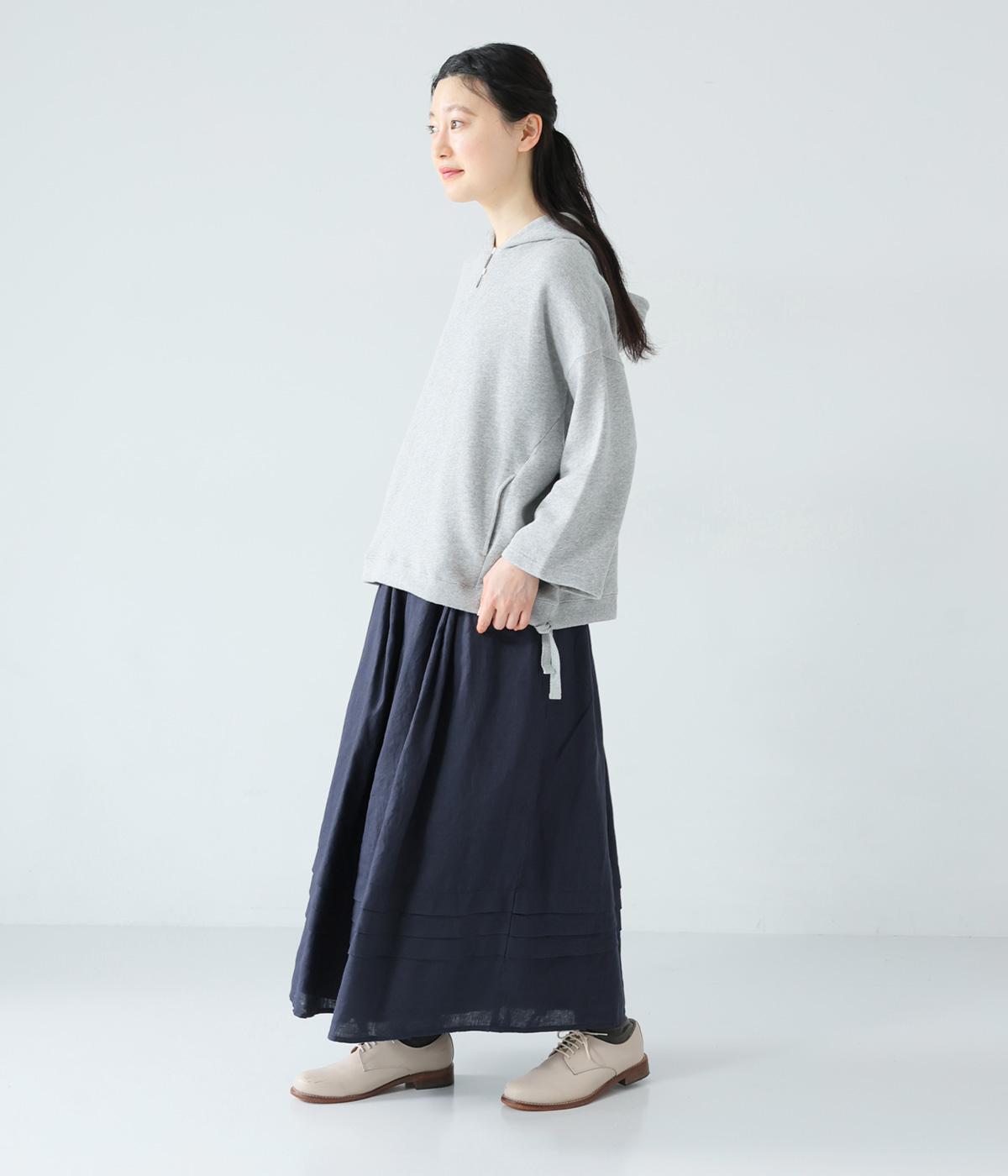 腰位置から広がるタックをほどこした、大きなドレープを描くリネンスカート。横に広がりすぎないので、甘さをおさえたすっきりとした着こなしが叶います。裾の太めのタックデザインがアクセントに。ウエストは総ゴム仕様で、内側には紐を通しています。