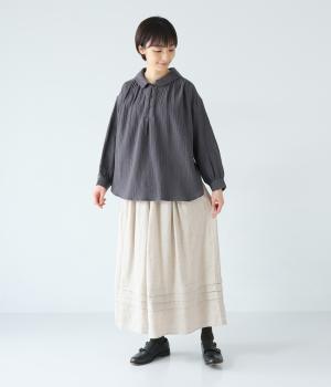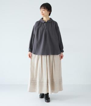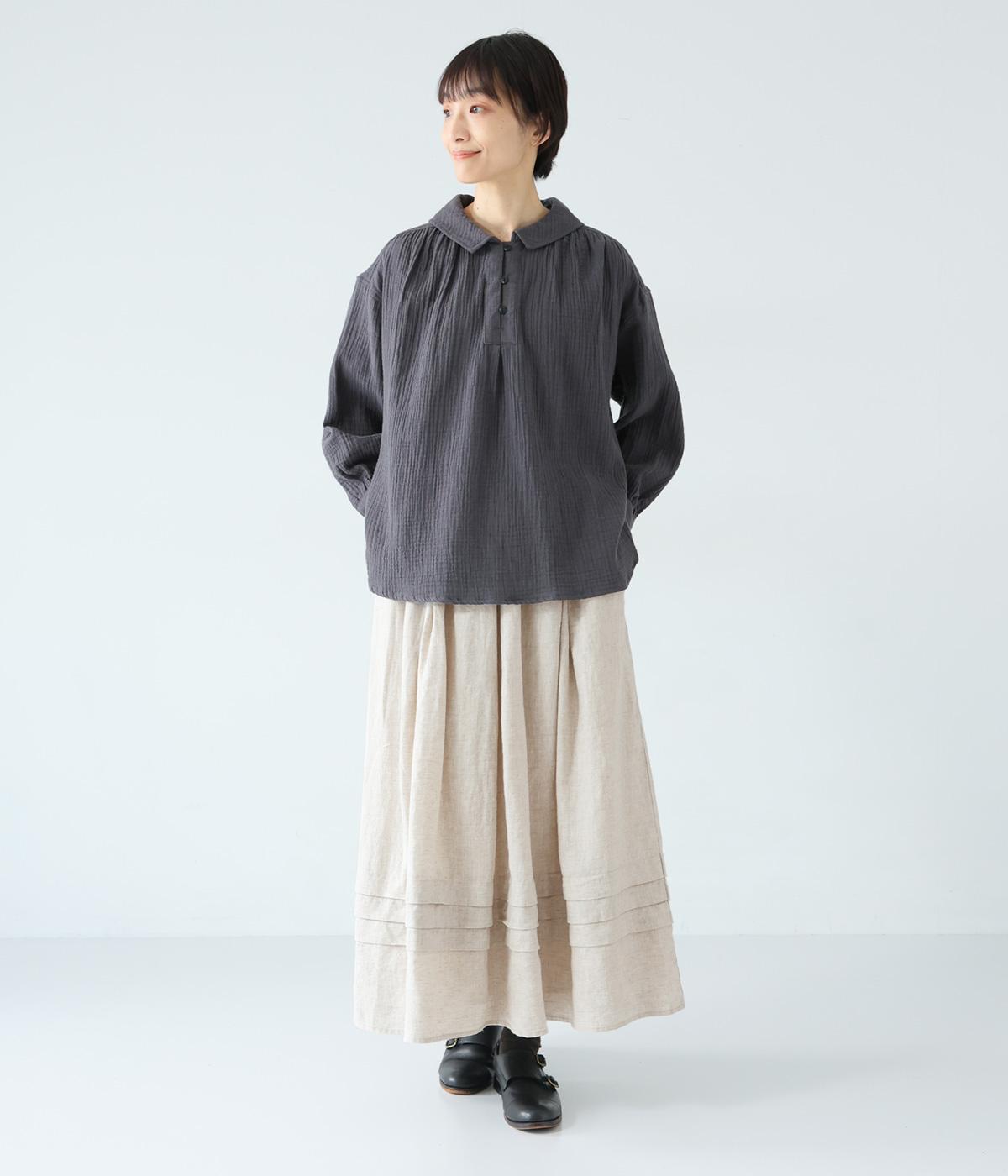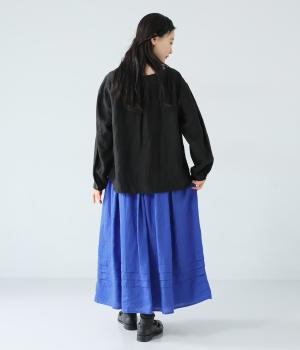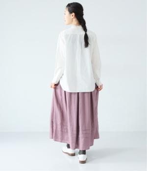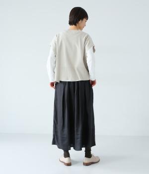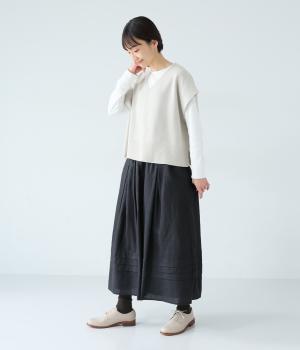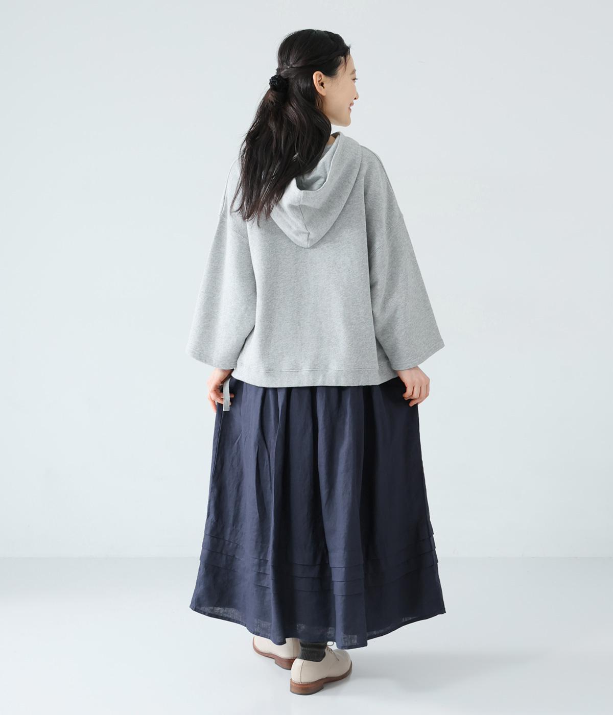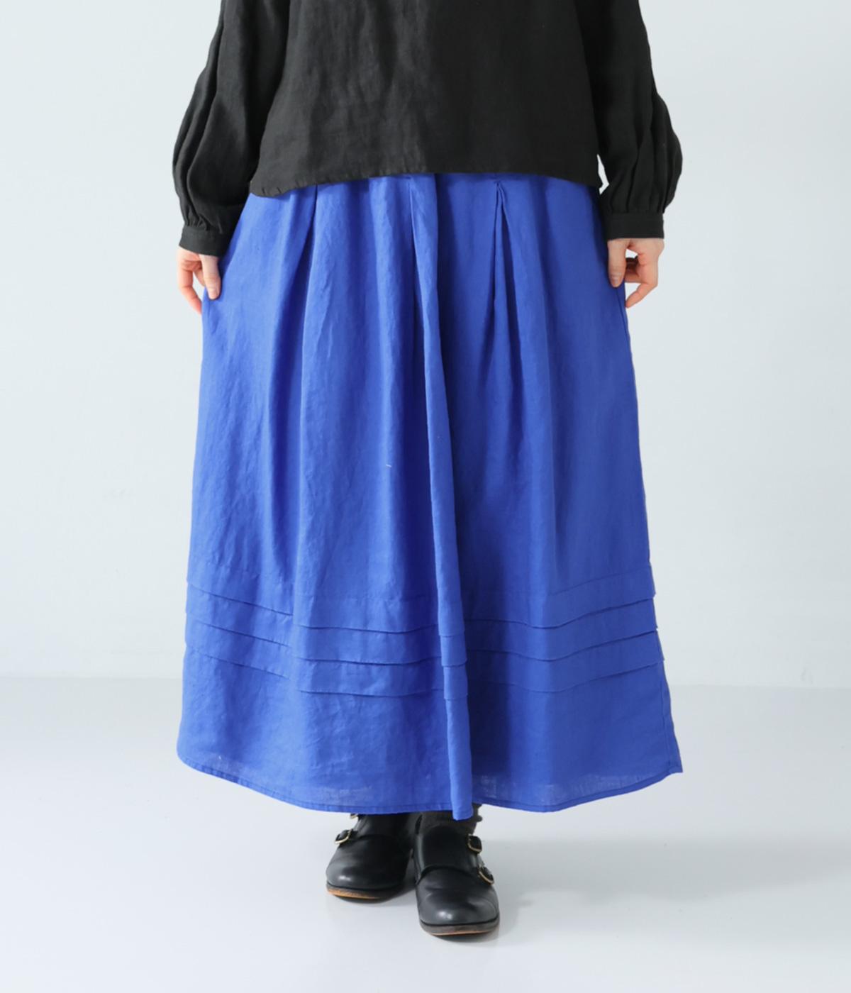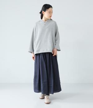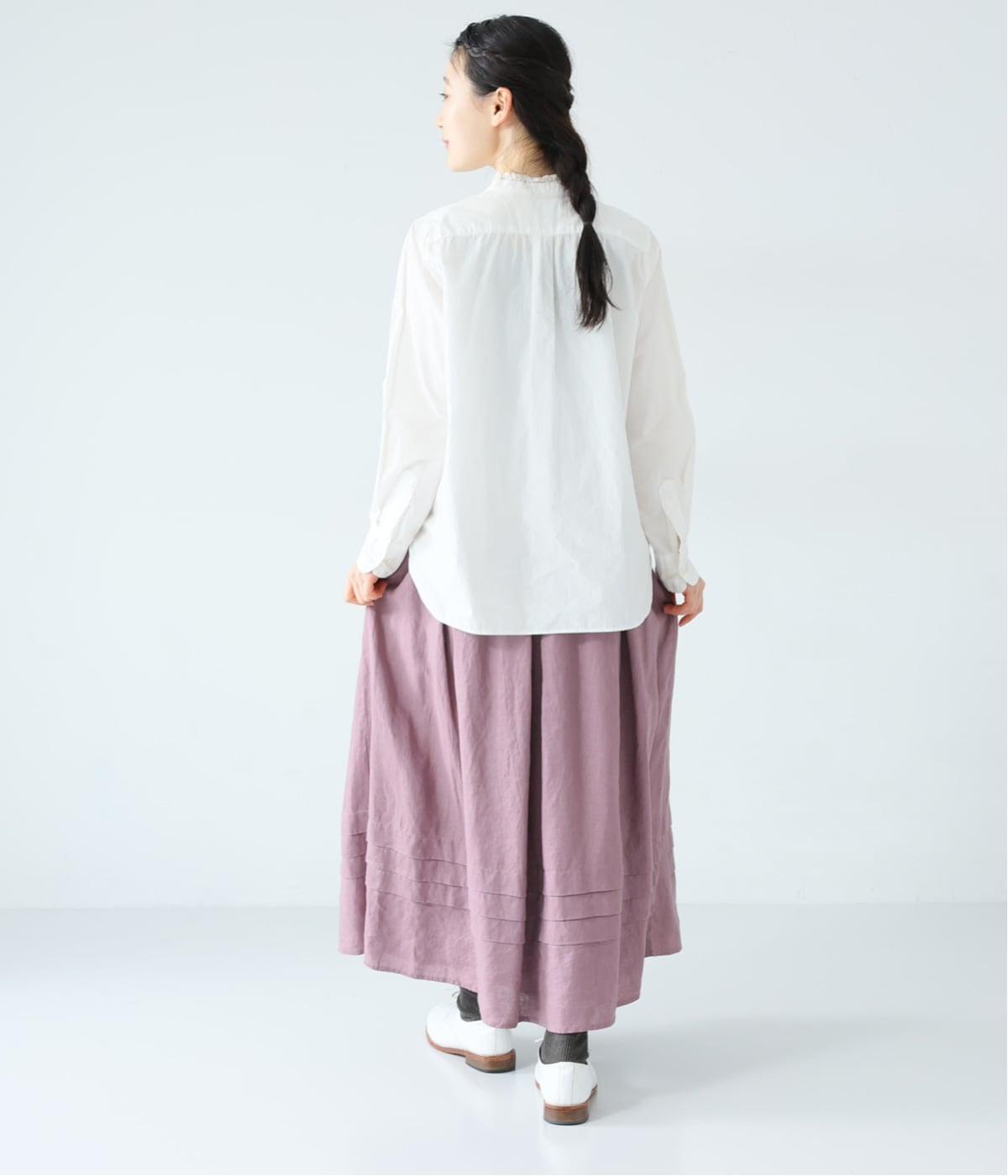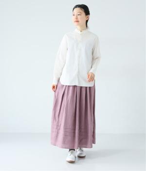 腰位置から広がるタックをほどこした、大きなドレープを描くリネンスカート。横に広がりすぎないので、甘さをおさえたすっきりとした着こなしが叶います。裾の太めのタックデザインがアクセントに。ウエストは総ゴム仕様で、内側には紐を通しています。