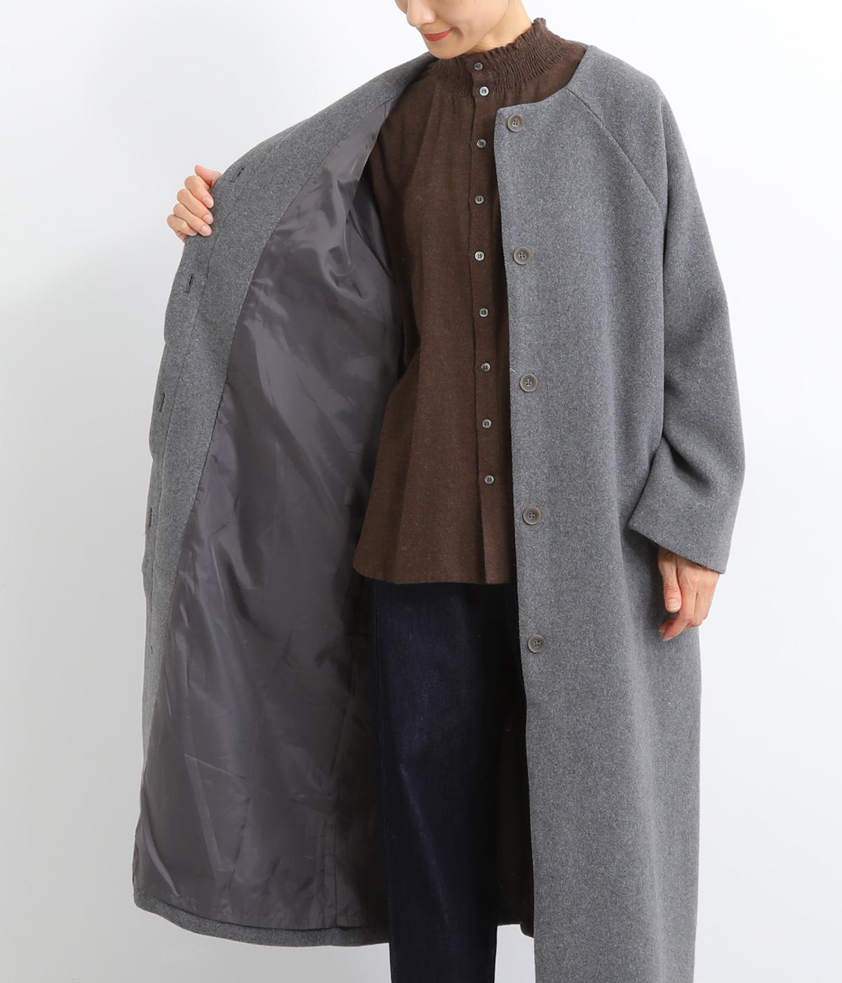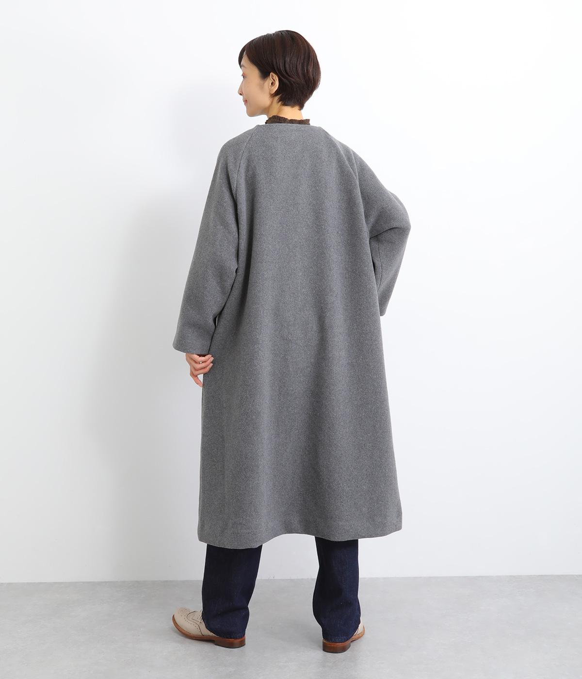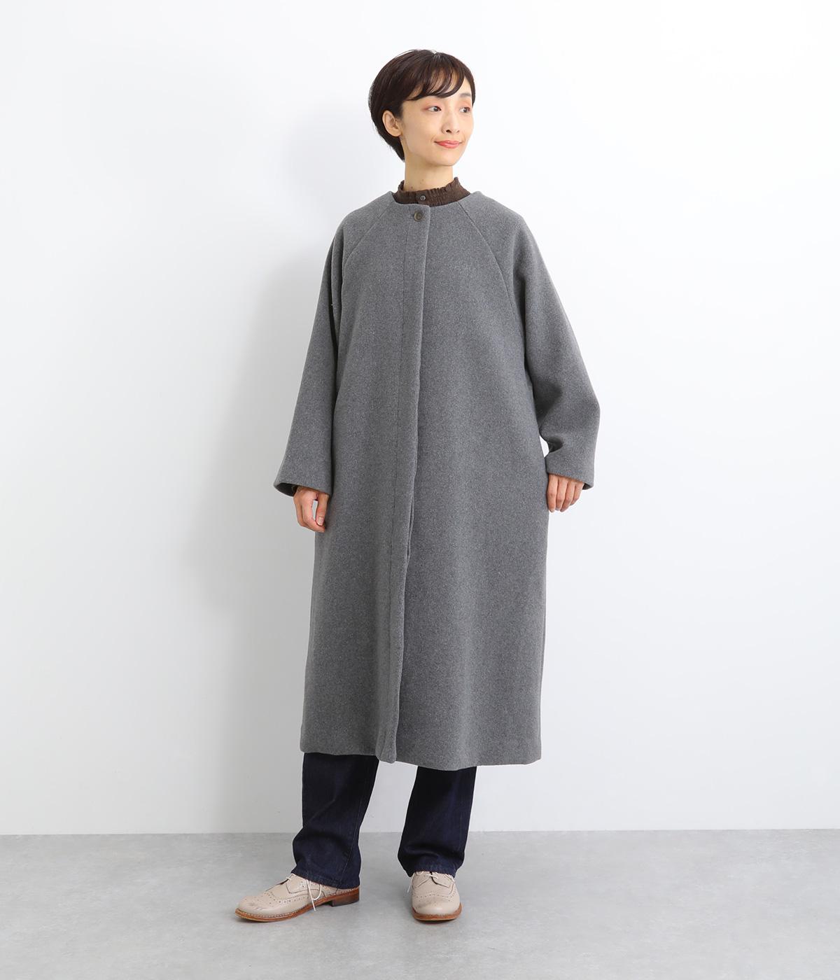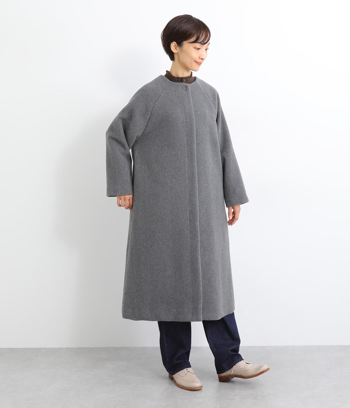 女性らしい上品な着こなしを叶えるノーカラーコート。ラグランスリーブが肩ラインを滑らかに見せてくれます。フロントボタンを隠す比翼仕立てでカジュアルさを軽減。裾に向かって緩やかに広がるシルエットで、ひざ下のロング丈も好バランスに仕上げました。