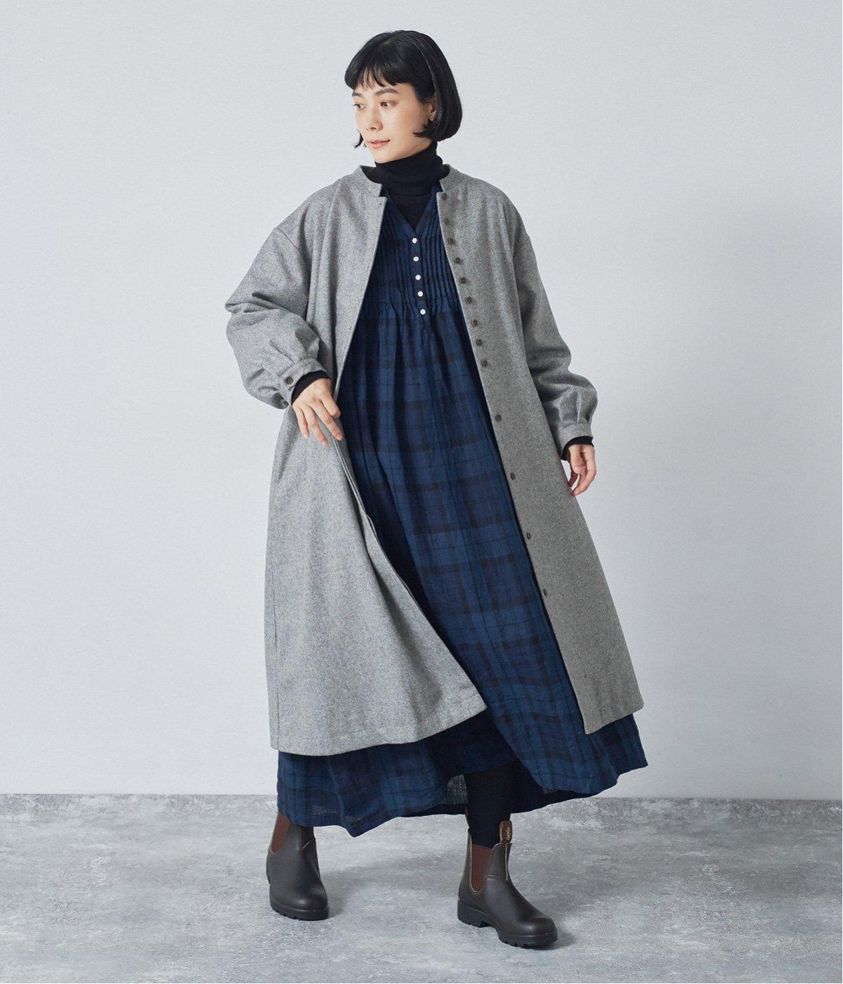 淡いグレーのロングコートと、深いネイビーのワンピースのコントラストが効いたスタイリング。前を開けてさっと羽織るだけで、簡単に大人ナチュラルな着こなしが完成します。