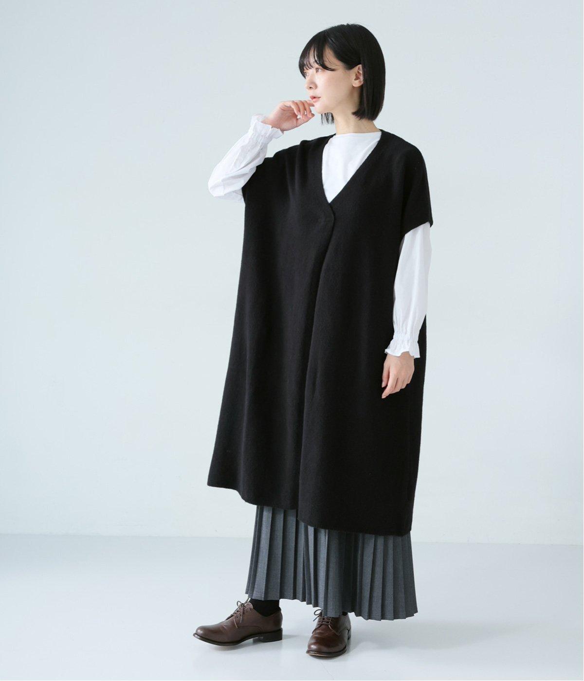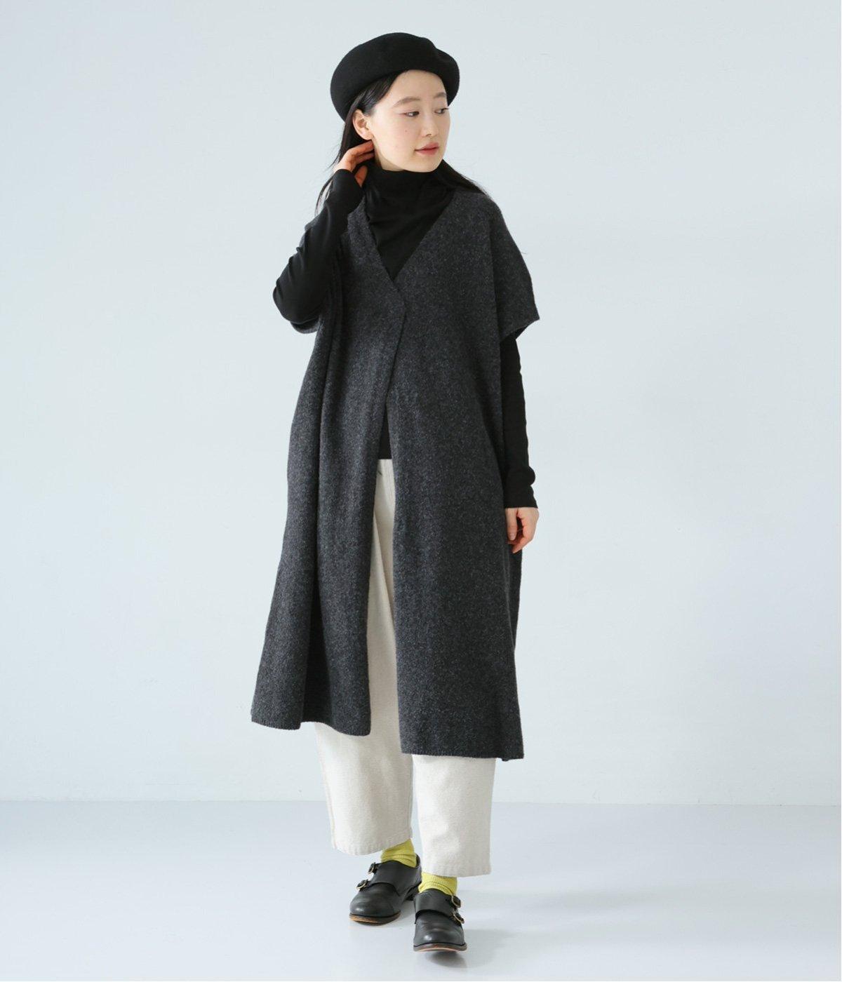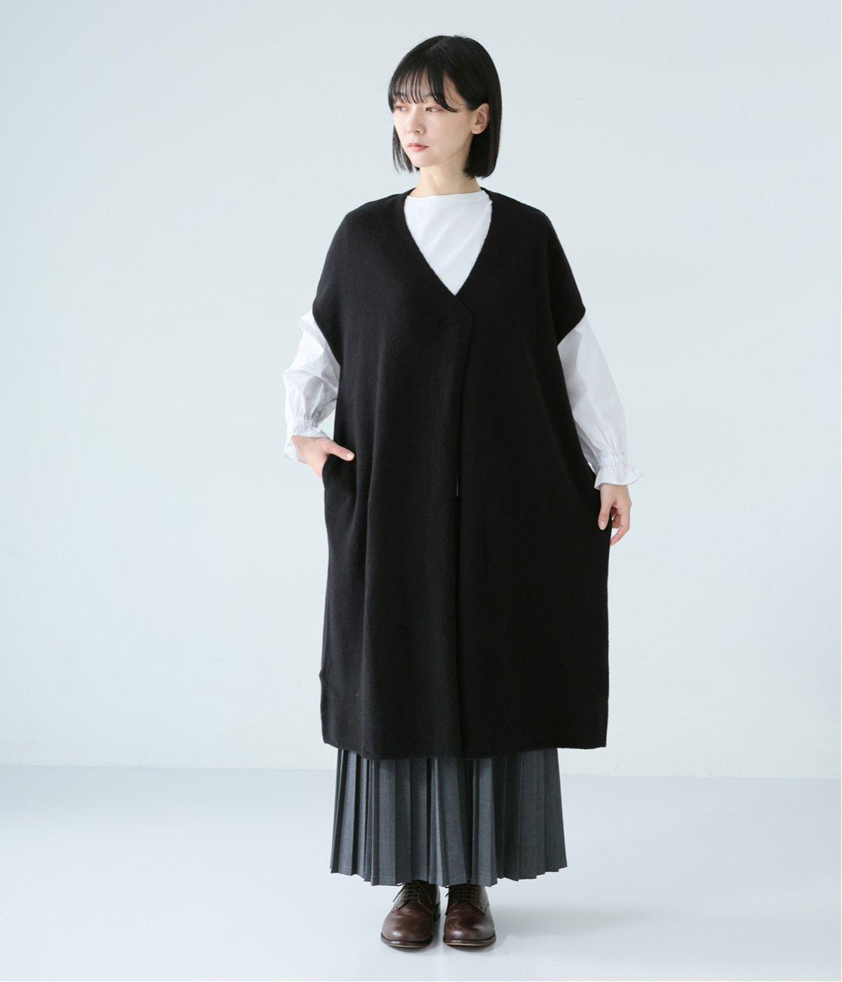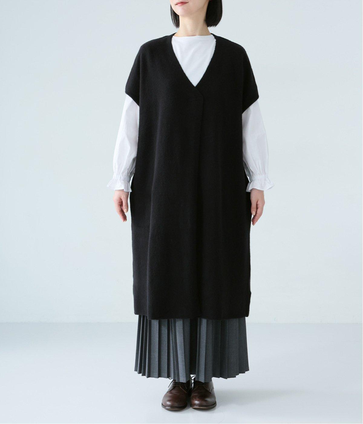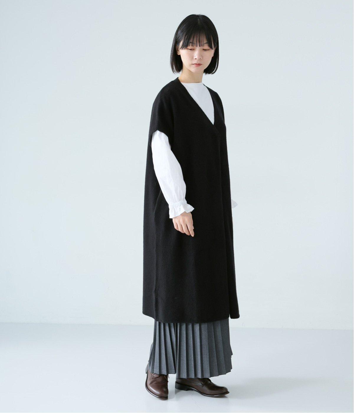 さらりと重ねやすい軽い着心地のニットベスト。合わせるインナーを選ばず、センターのスリットですっきりとしたジレのような印象に。