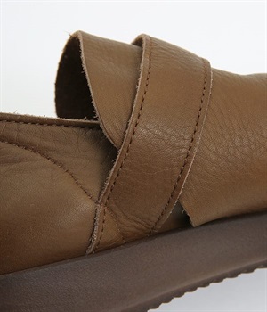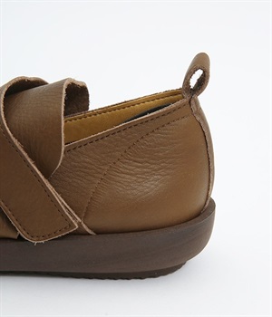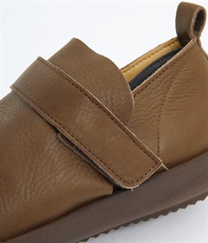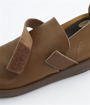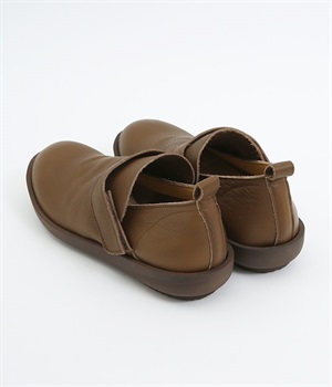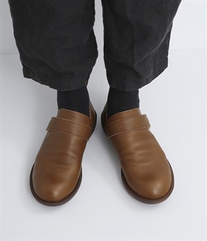 装飾を省いたシンプルな佇まいで使いやすいシューズ。はくほどに足にやさしくなじんでいく牛革素材を使用しています。アッパー部分には面ファスナーつきのベルトが備わり、甲高の方にも着用しやすいデザイン。足裏の形に寄り添う、心地良いクッション性を持つインソールも装備した気の利いたつくりです。靴ひもがなく足入れも簡単なのでデイリー使いに適しています。