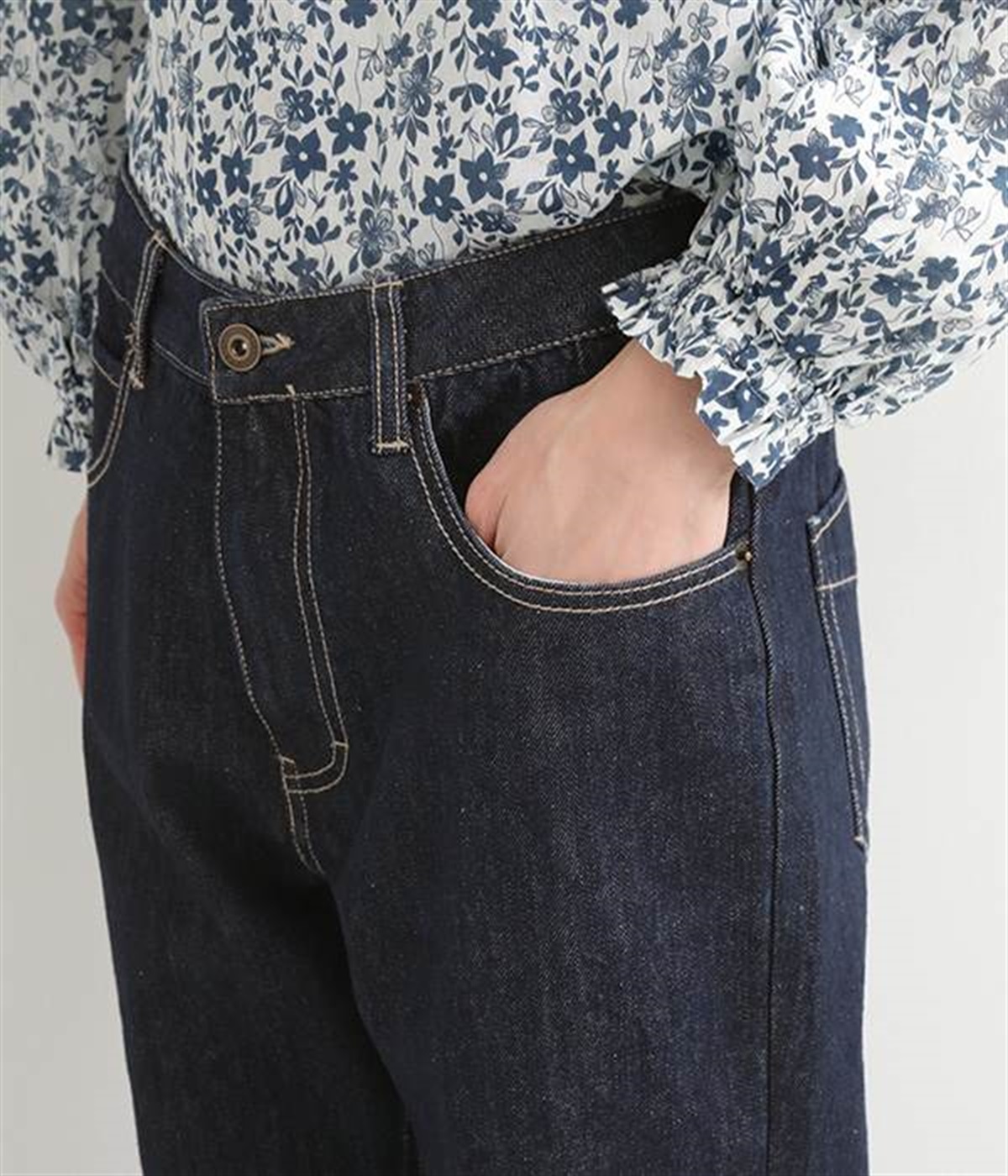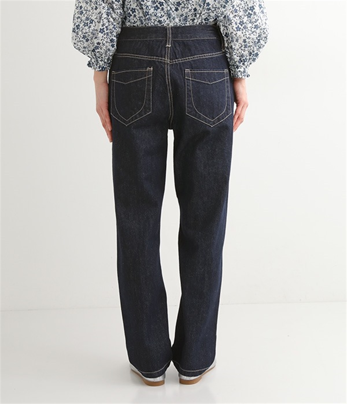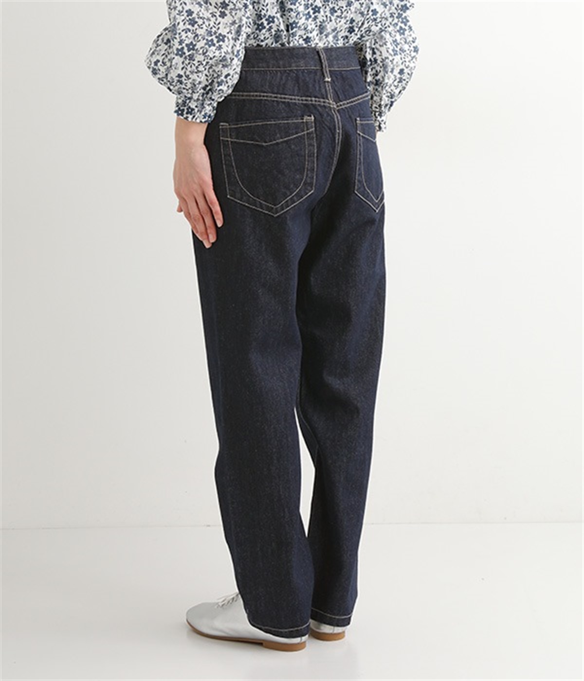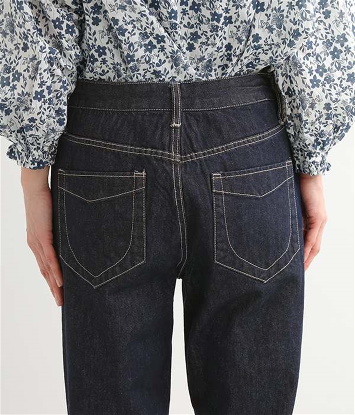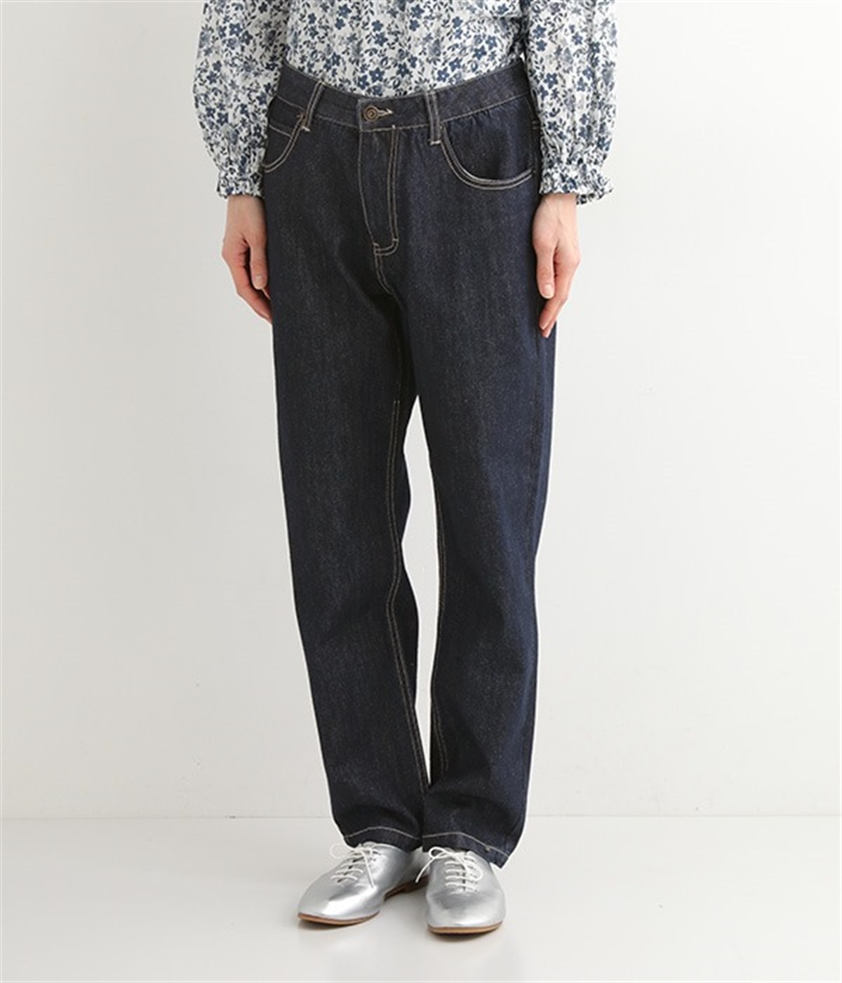 ストレートシルエットのベーシックなデニムパンツです。トレンドに左右されないベーシックなデザインは、長くシーズンレスで使え、大人のデイリースタイルに活躍します。配色違いのステッチがアクセントをプラスオン。春から夏は裾をラフに折り上げて足首に抜け感をつけた着こなしも素敵です。ウエストはボタン&ファスナー仕様。
