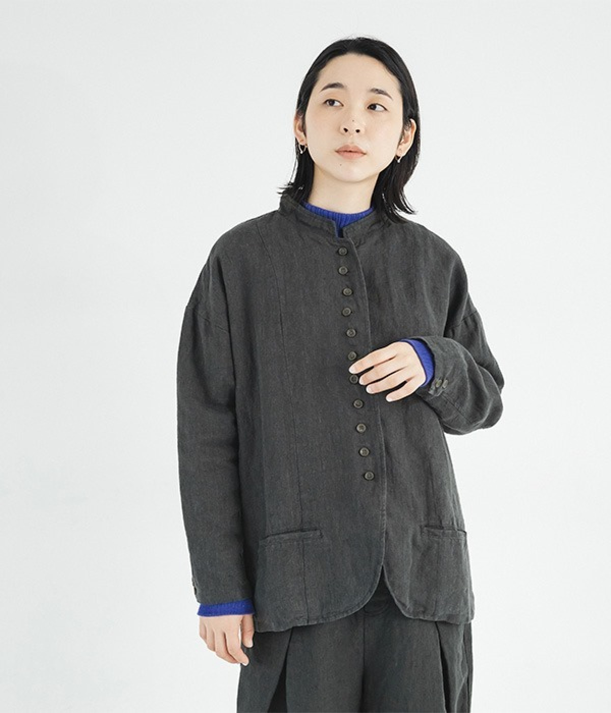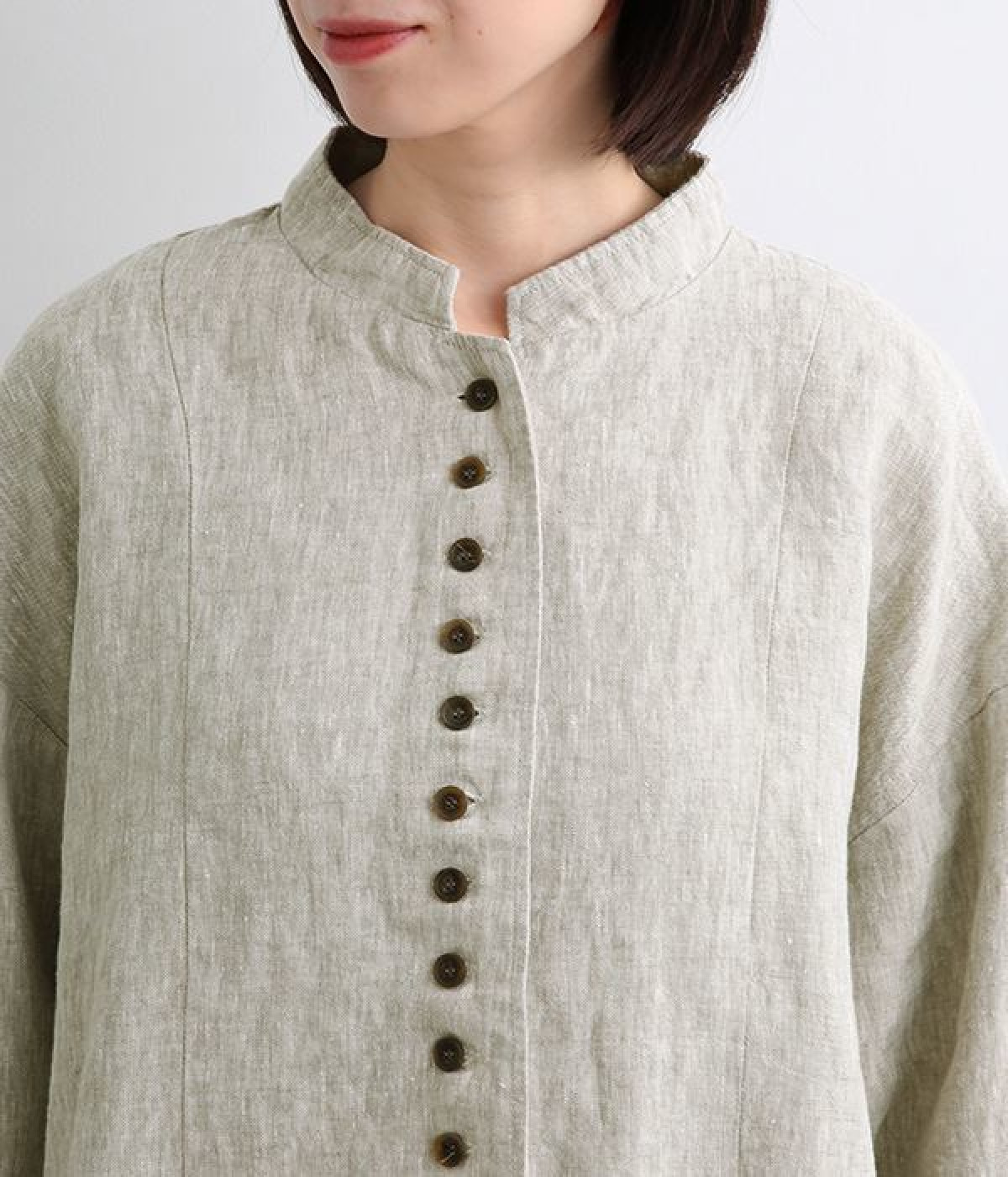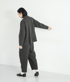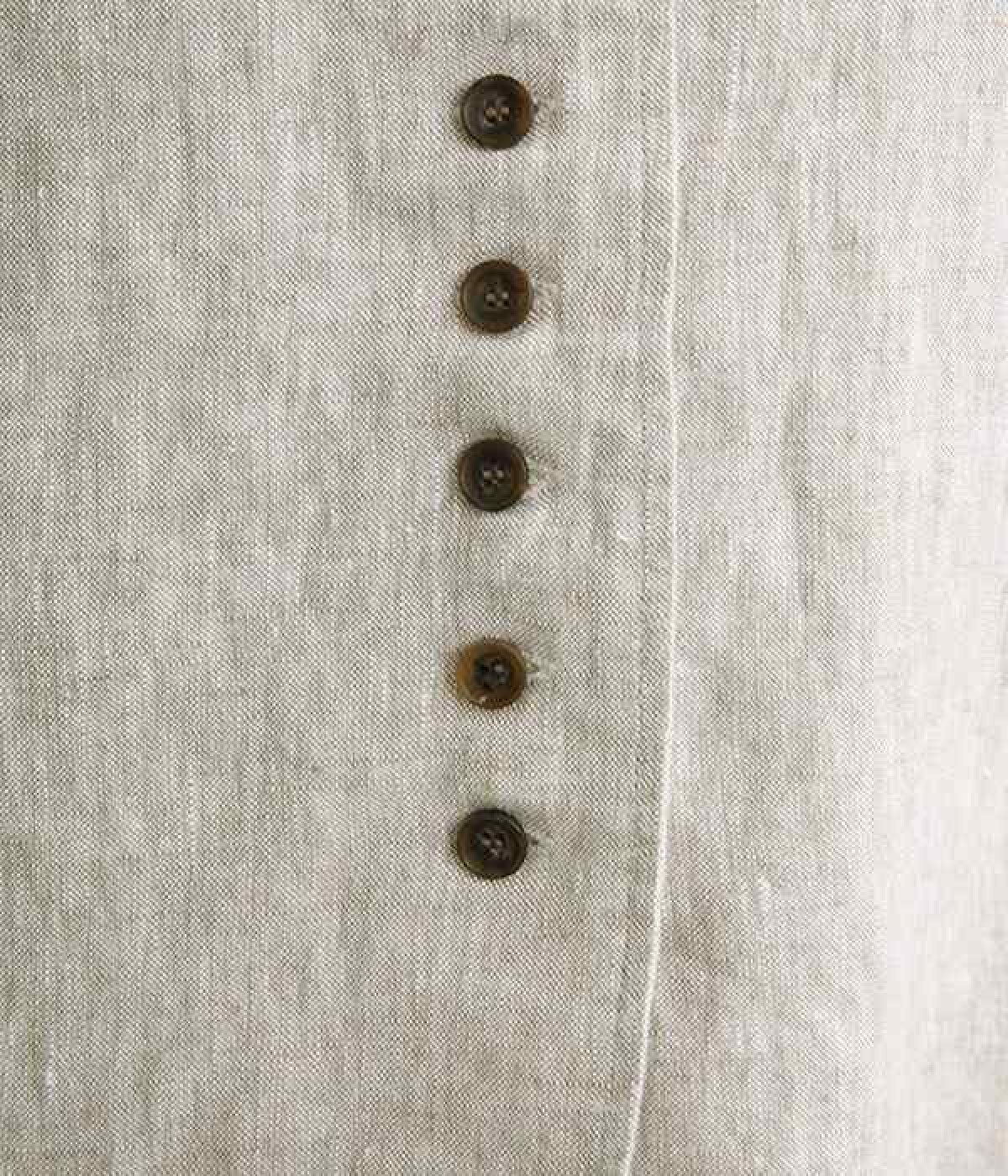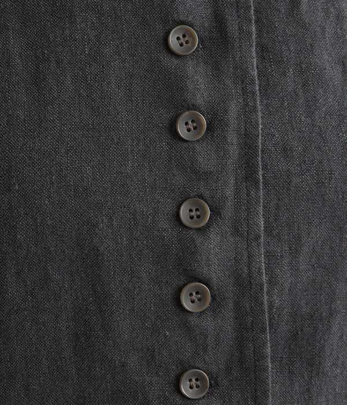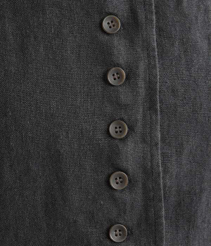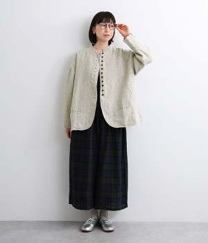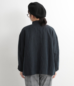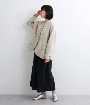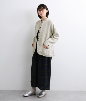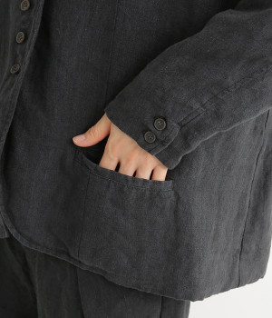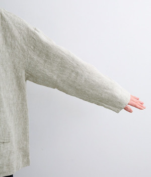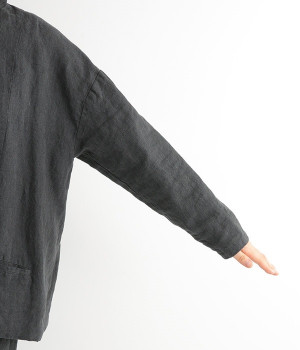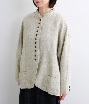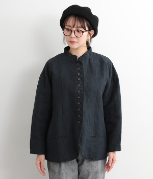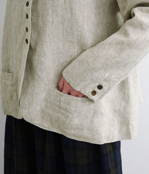 シャリ感とコシのある、丈夫な9番手リネンで仕立てたジャケットです。前端に多く並んだボタンがデザインポイント。かっちりとした印象のジャケットを、ボタン使いとリネン素材でほどよくカジュアルダウンさせました。着るほどにやわらかく肌になじみ、豊かになっていく風合いも楽しむことができます。