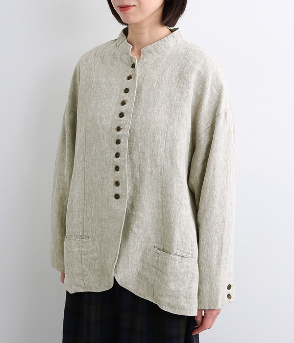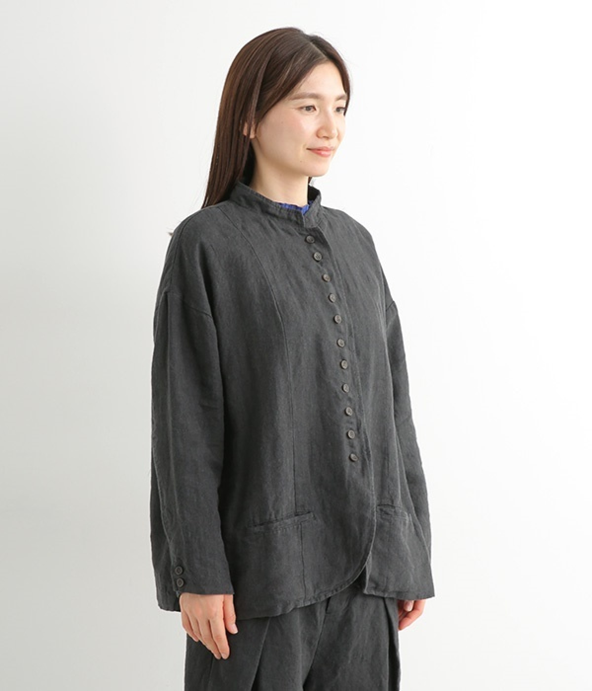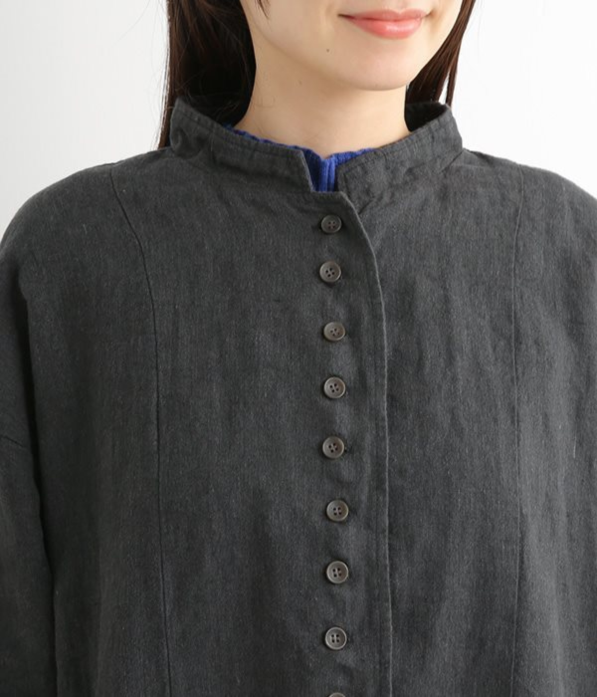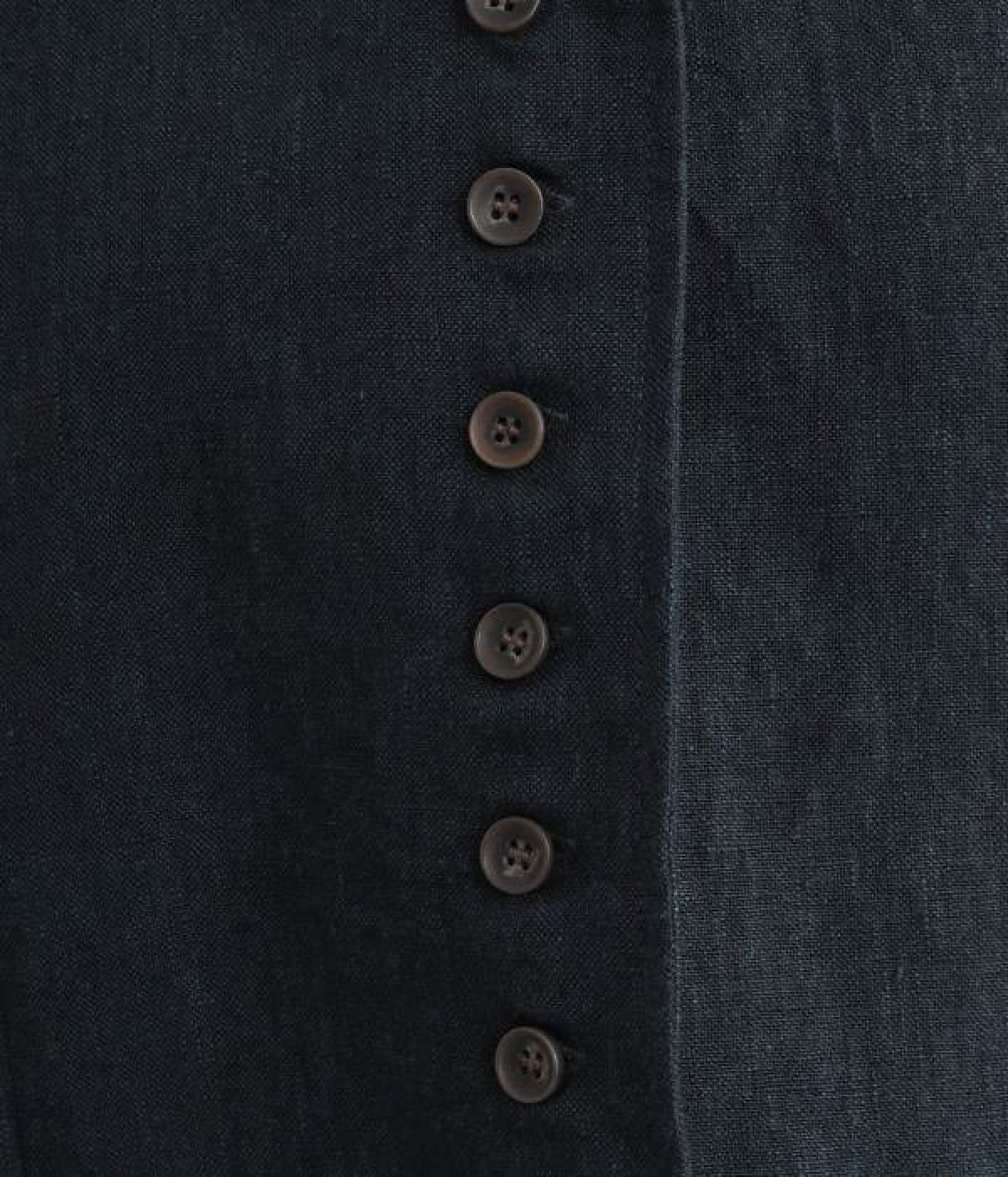 シャリ感とコシのある、丈夫な9番手リネンで仕立てたジャケットです。前端に多く並んだボタンがデザインポイント。かっちりとした印象のジャケットを、ボタン使いとリネン素材でほどよくカジュアルダウンさせました。着るほどにやわらかく肌になじみ、豊かになっていく風合いも楽しむことができます。