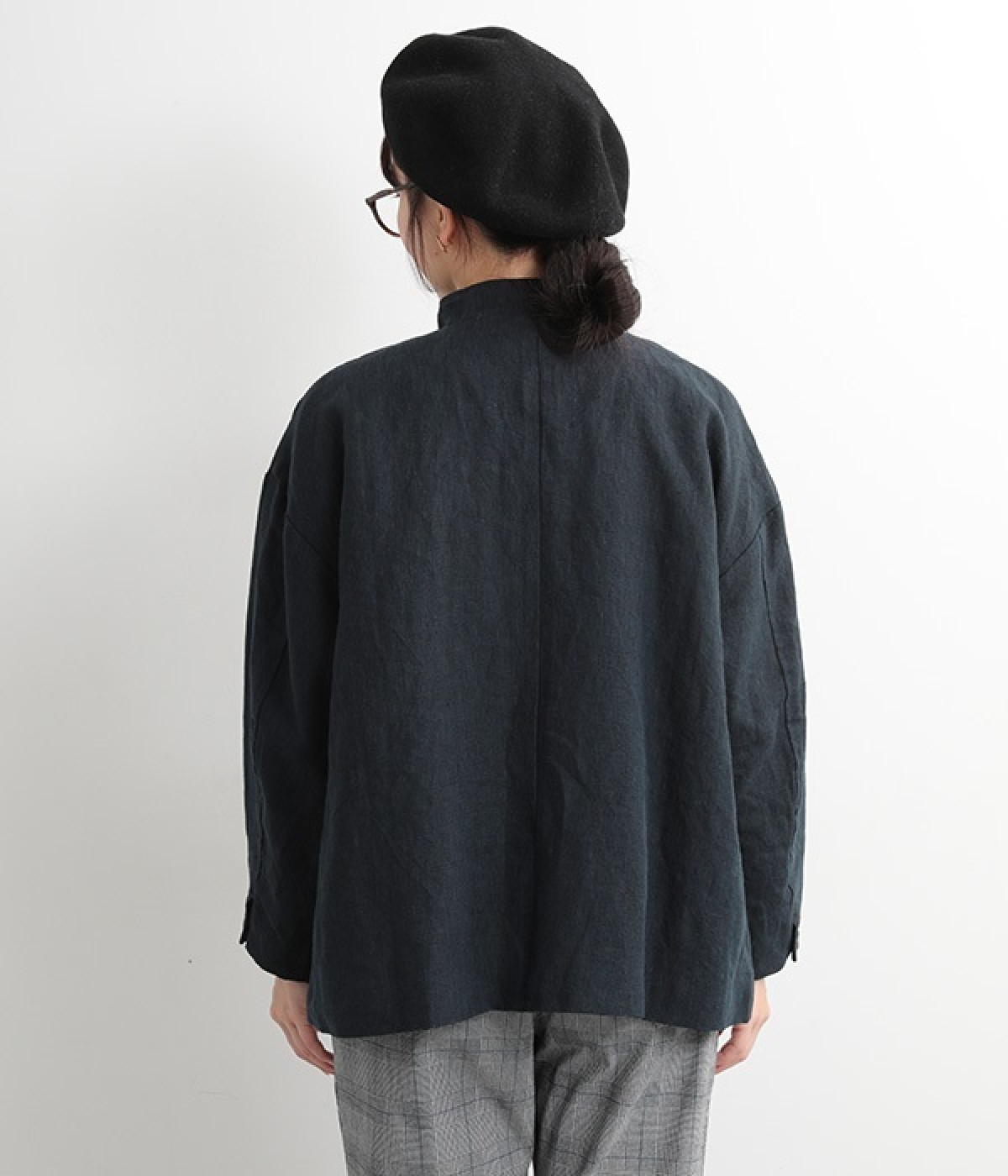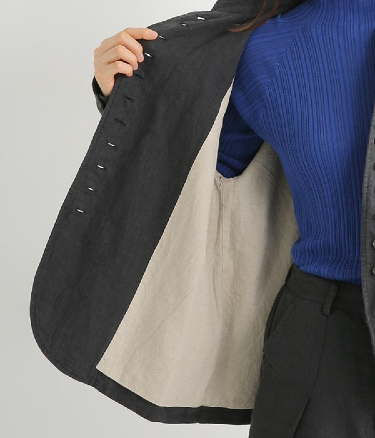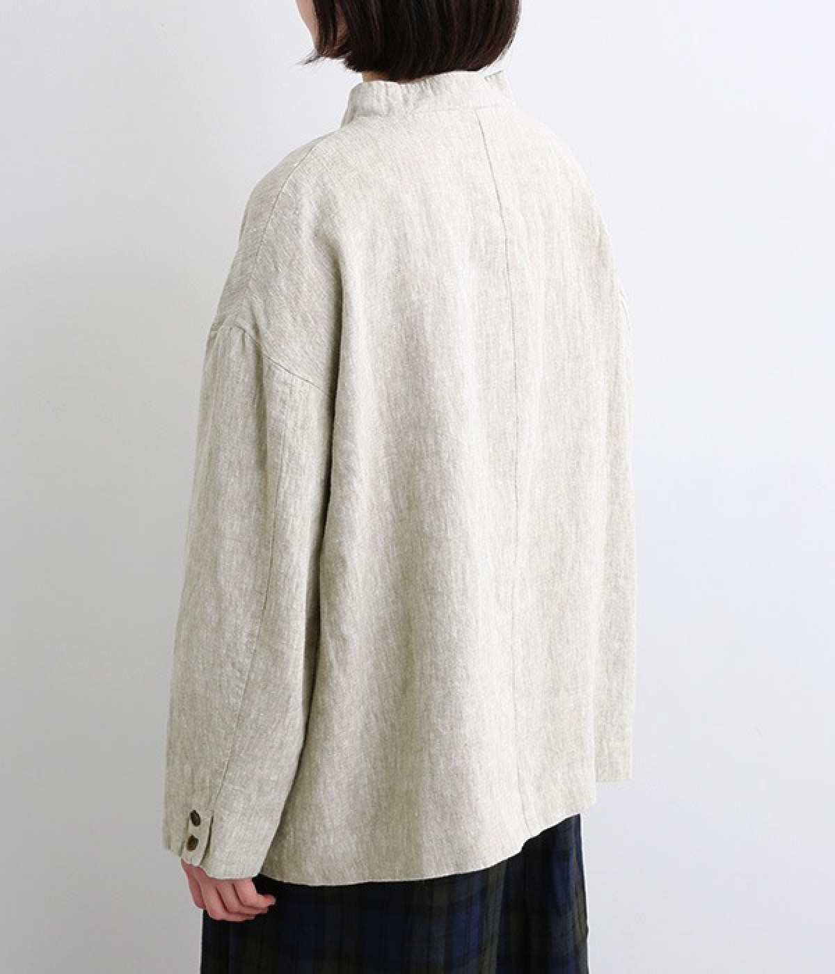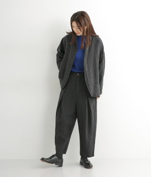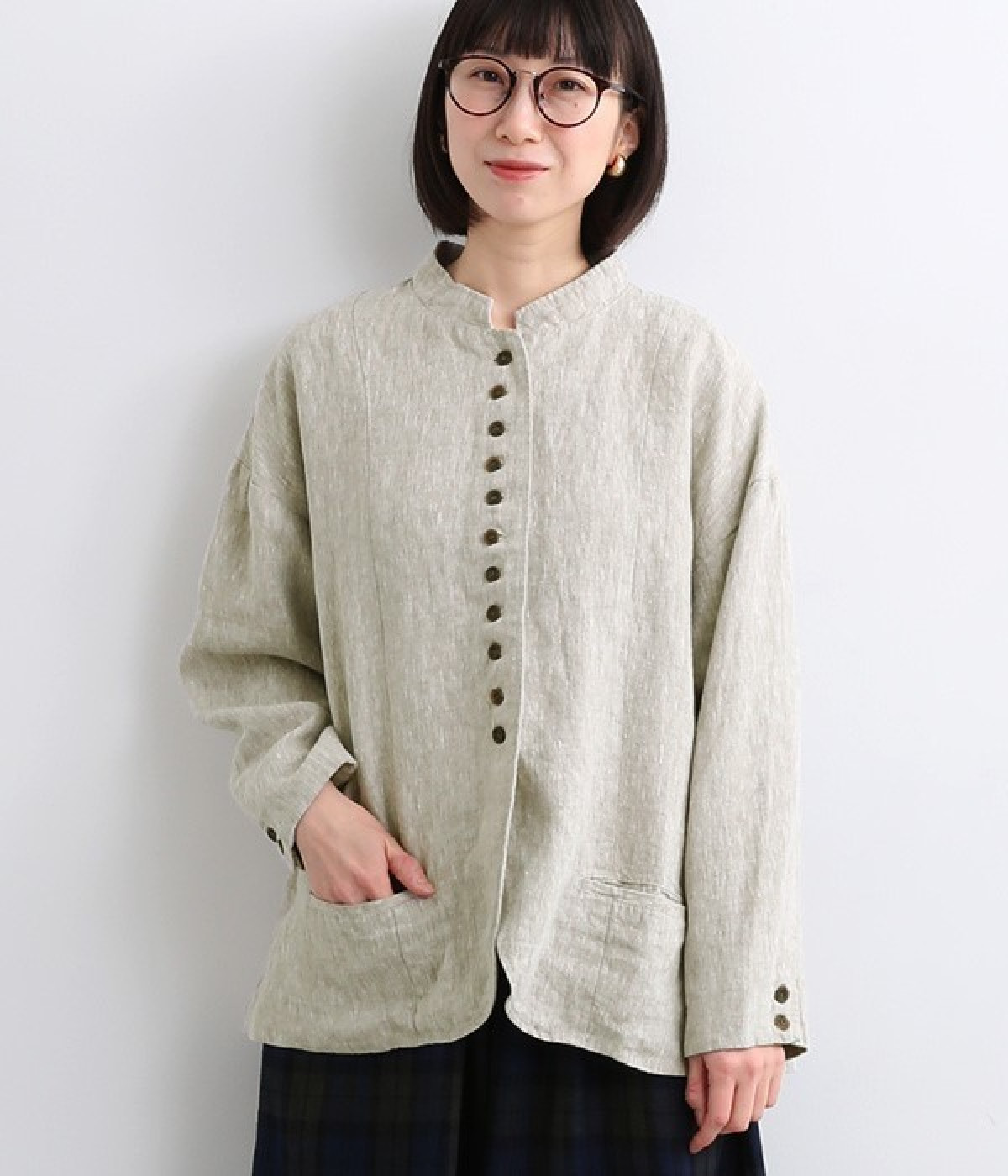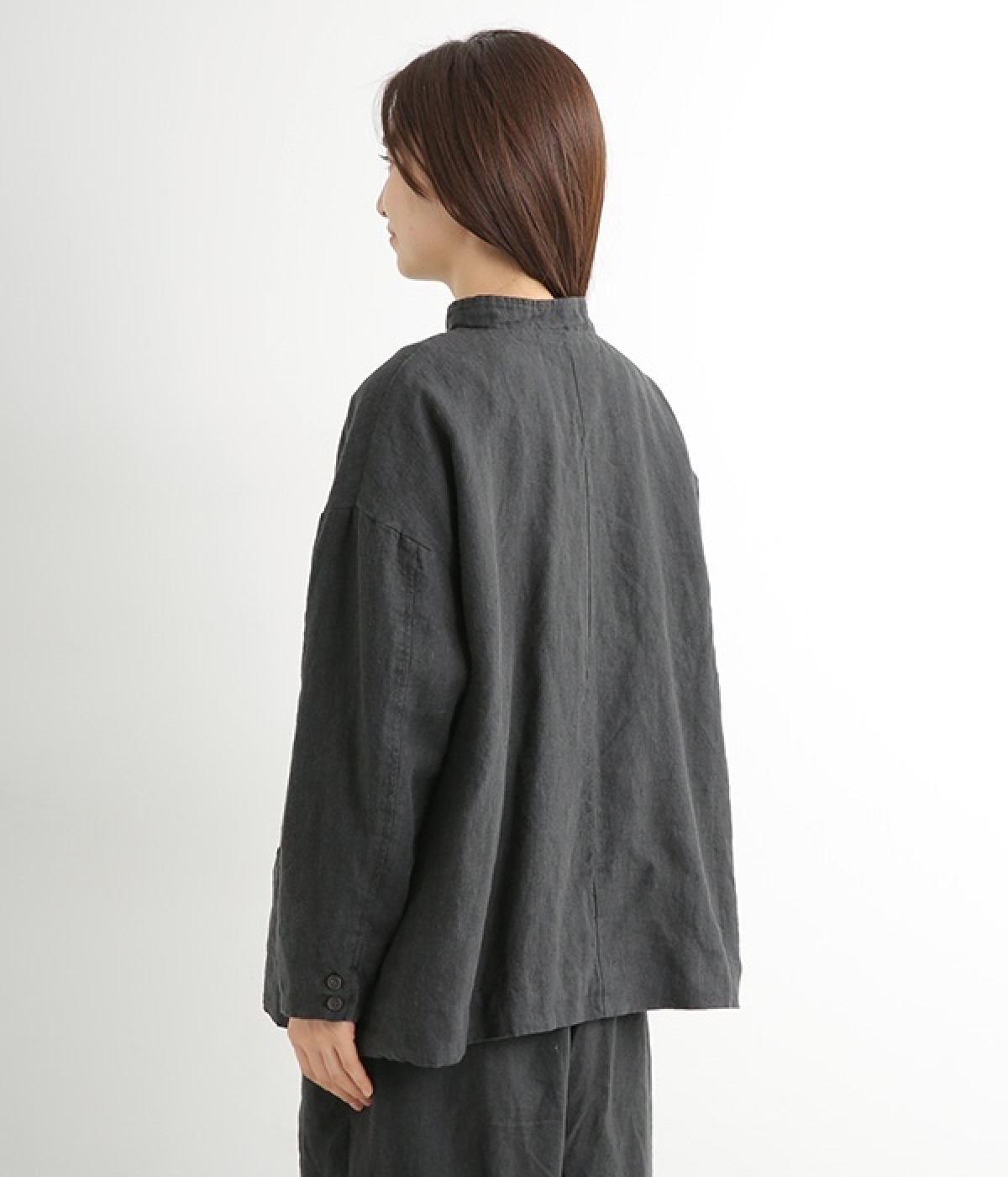 シャリ感とコシのある、丈夫な9番手リネンで仕立てたジャケットです。前端に多く並んだボタンがデザインポイント。かっちりとした印象のジャケットを、ボタン使いとリネン素材でほどよくカジュアルダウンさせました。着るほどにやわらかく肌になじみ、豊かになっていく風合いも楽しむことができます。