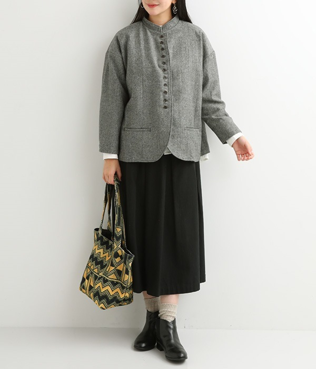 ツイード特有の奥深い色味が美しいウール混ジャケットです。きちんと感のあるコンパクトなスタンドカラーに、前立てに並べたたくさんのボタン使いがアクセントとして際立ちます。肩のラインを落としたドロップショルダーを採用し、ゆったりと丸みを帯びた立体的なフォルムが完成。少し短めの袖丈は手首を見せてすっきりと。袖にディテールがあるブラウスやグローブを合わせても素敵です。