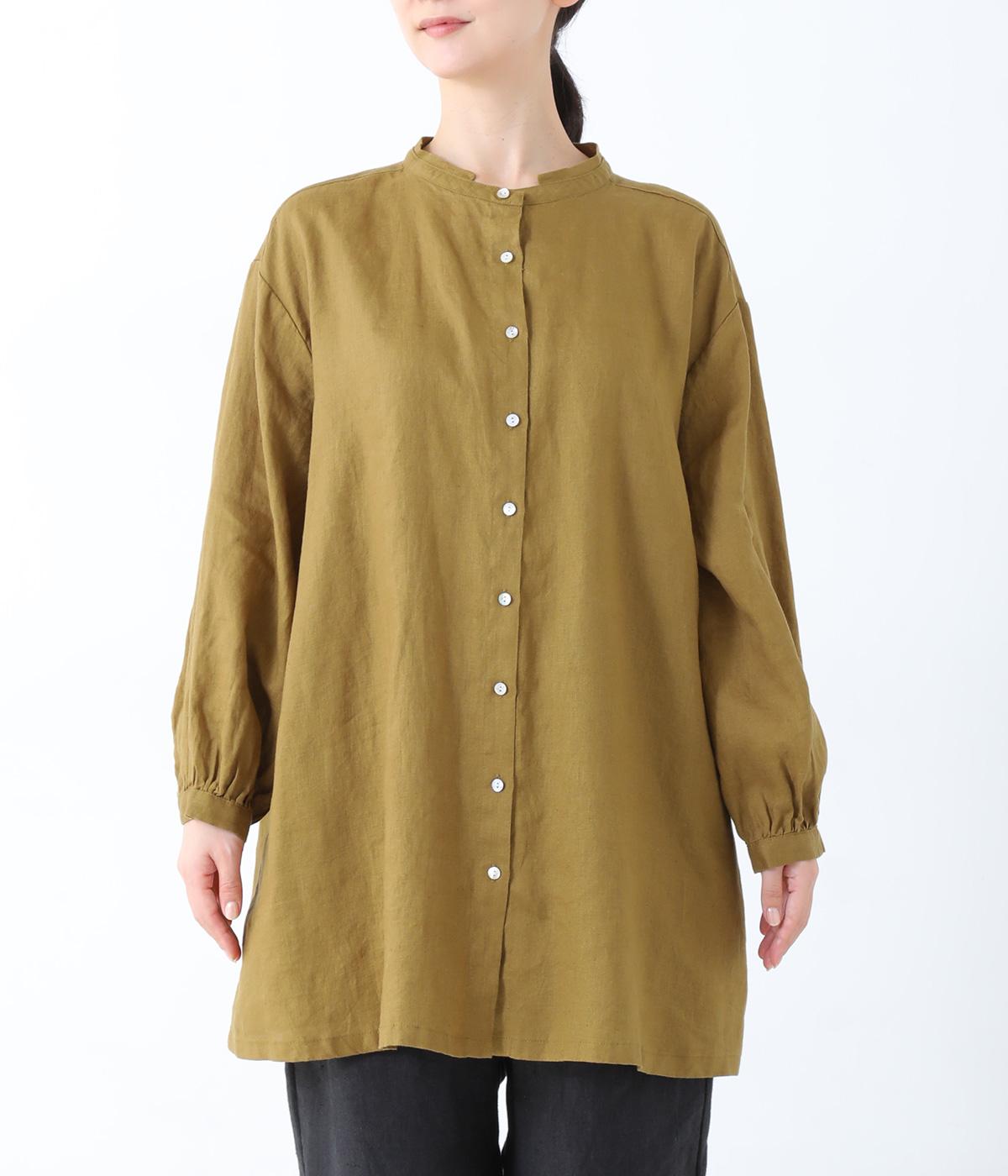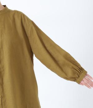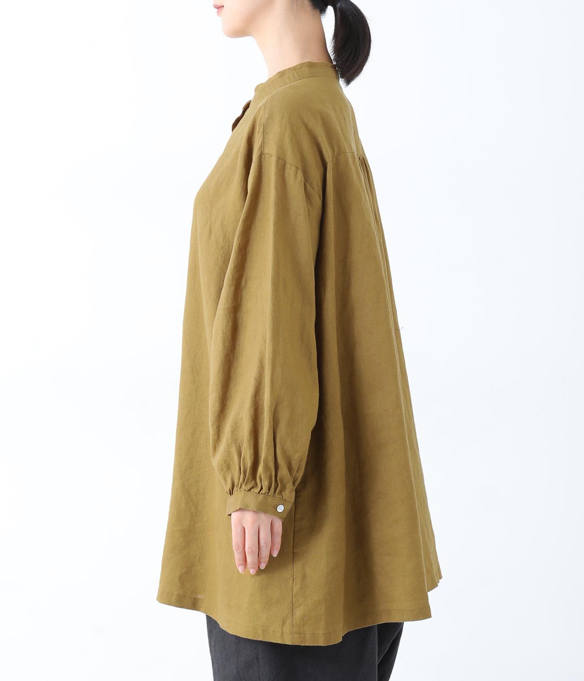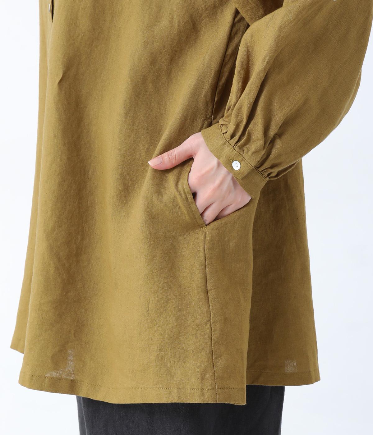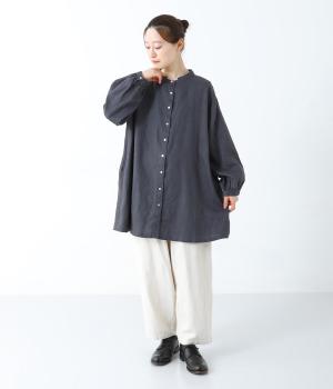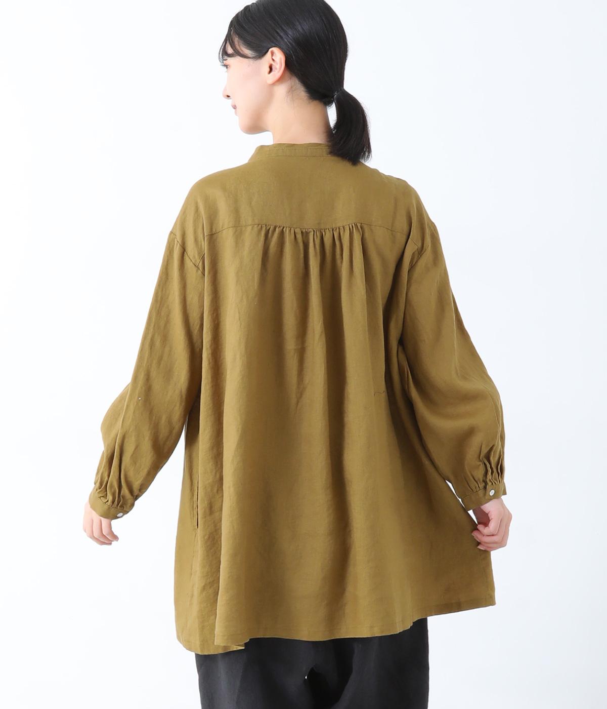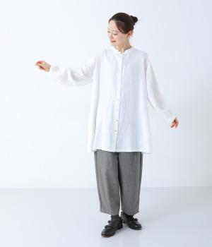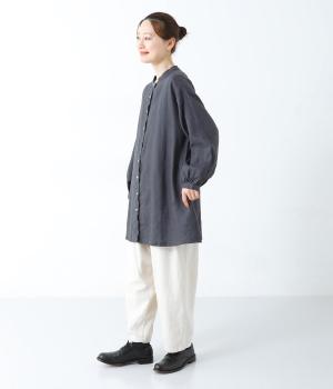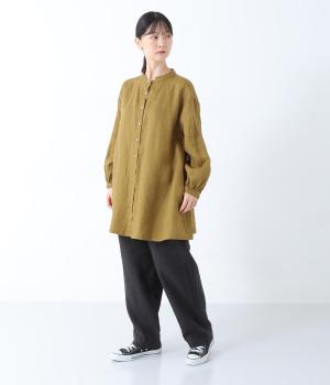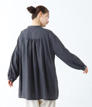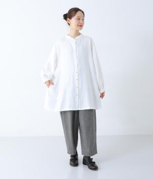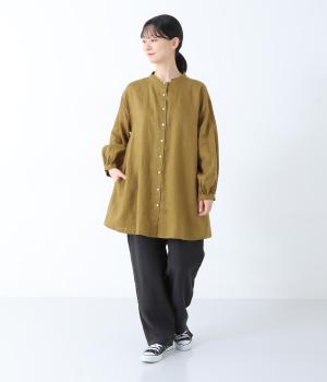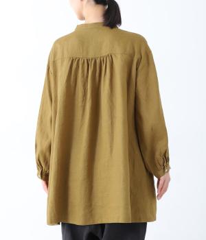 後ろヨーク下に細かなギャザーを入れ、ゆったりとしたフレアシルエットに仕上げたチュニック。ヒップまで隠す着丈が体のラインをカバーしてくれます。低めに立ち上げたスタンドカラーできちんと感をプラス。両サイドには便利なポケットをつけました。