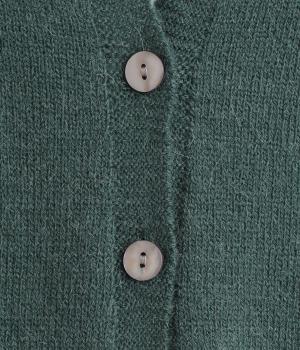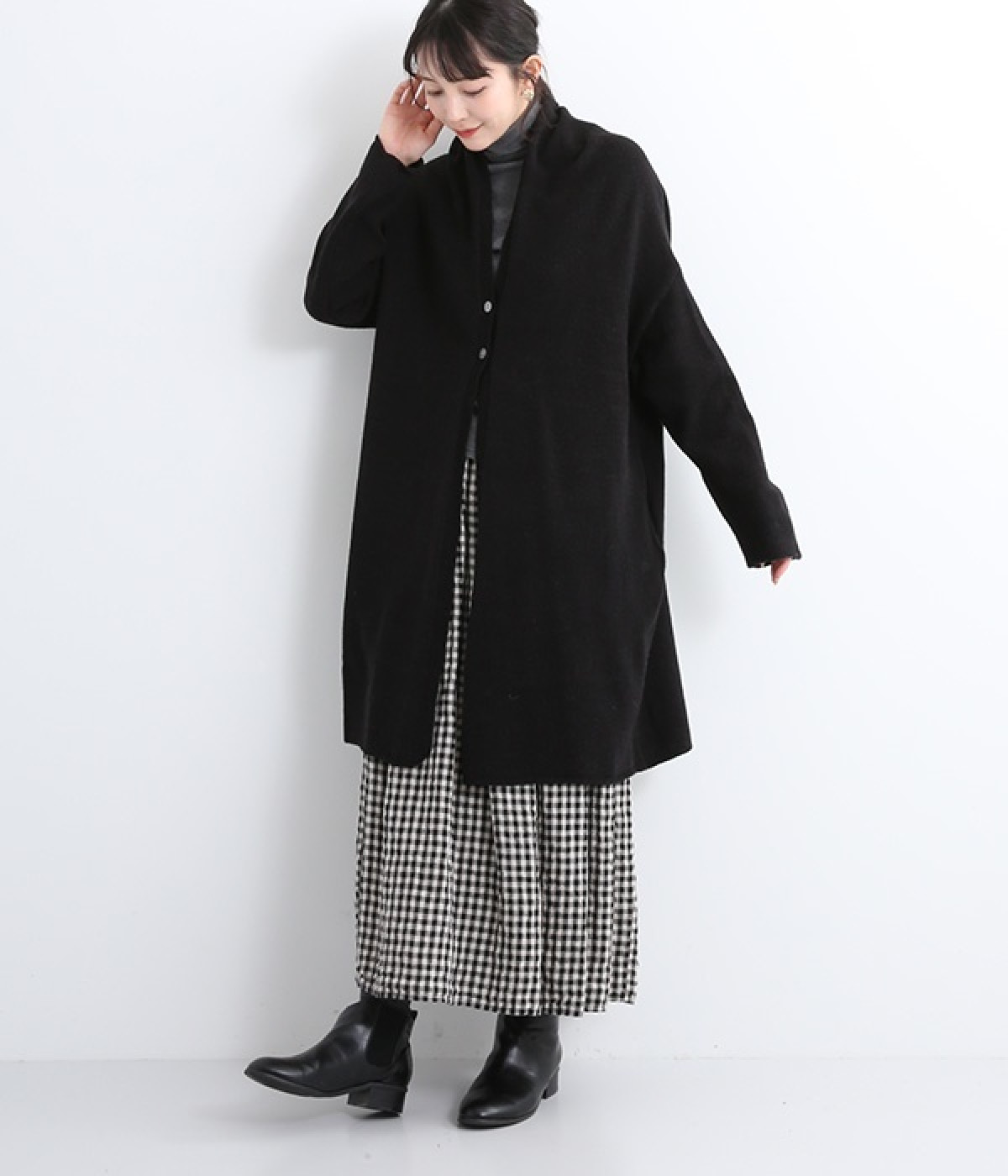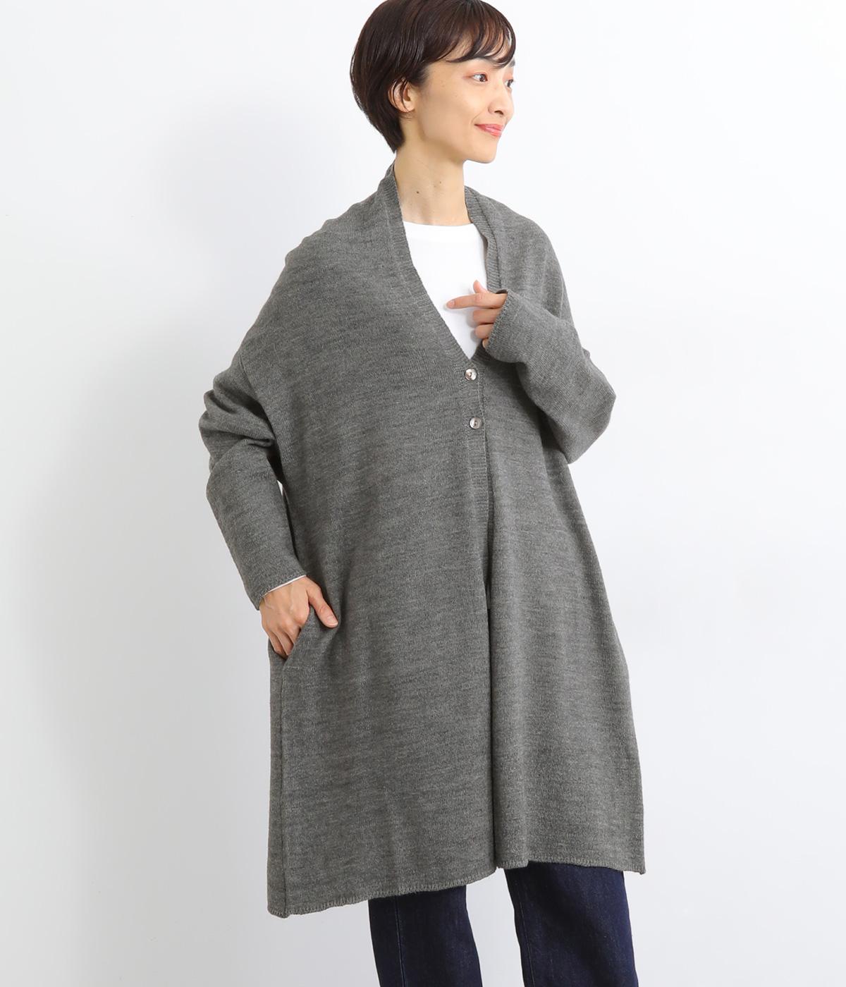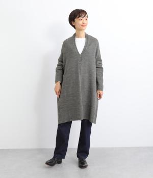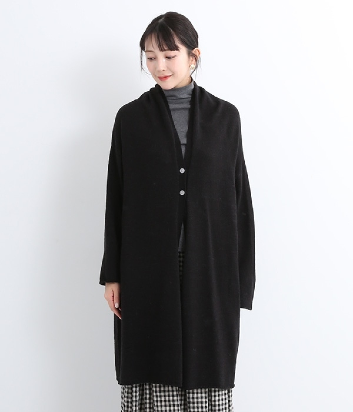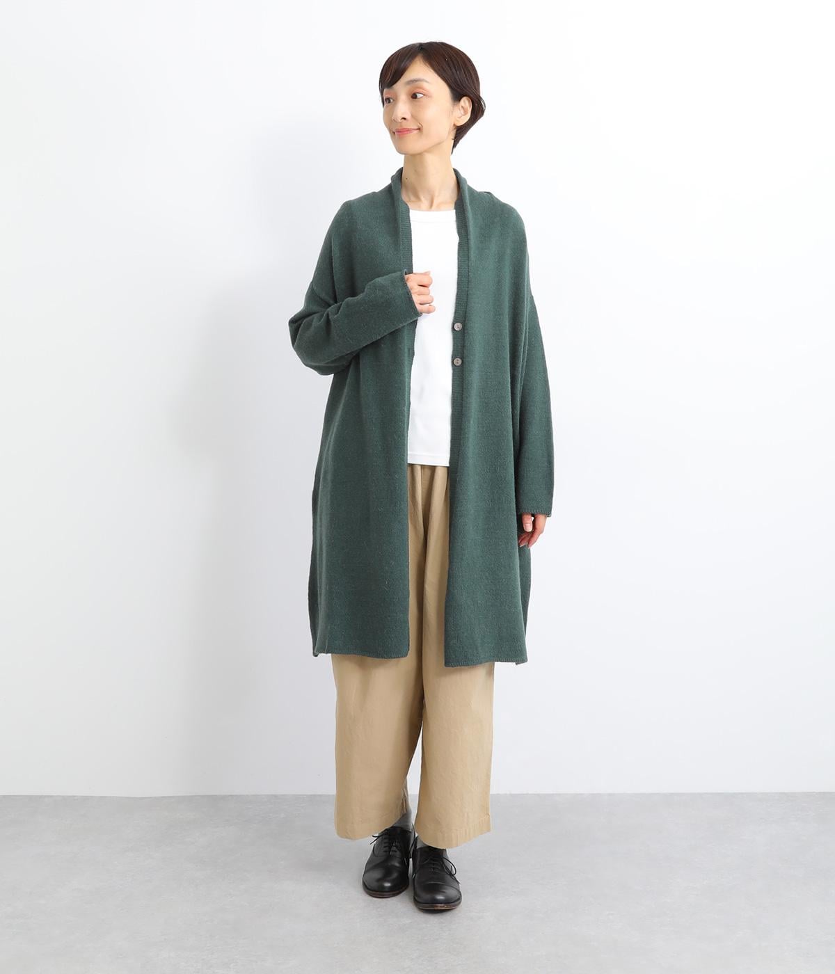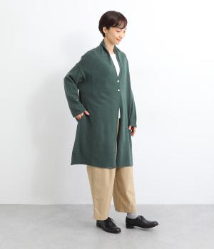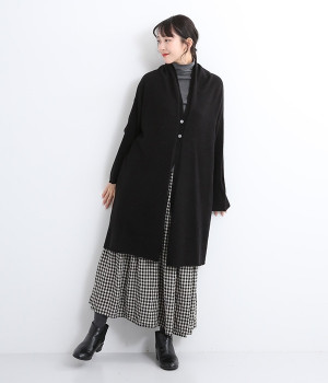 体のラインをカモフラージュしつつ、さまざまな装いに合わせやすいひざ上丈のロングカーディガン。首後ろに高さを出し、首元まであたたかく着用できます。フロントボタンは2つのみつけて、さっと羽織りやすく抜け感のあるデザインに仕上げました。